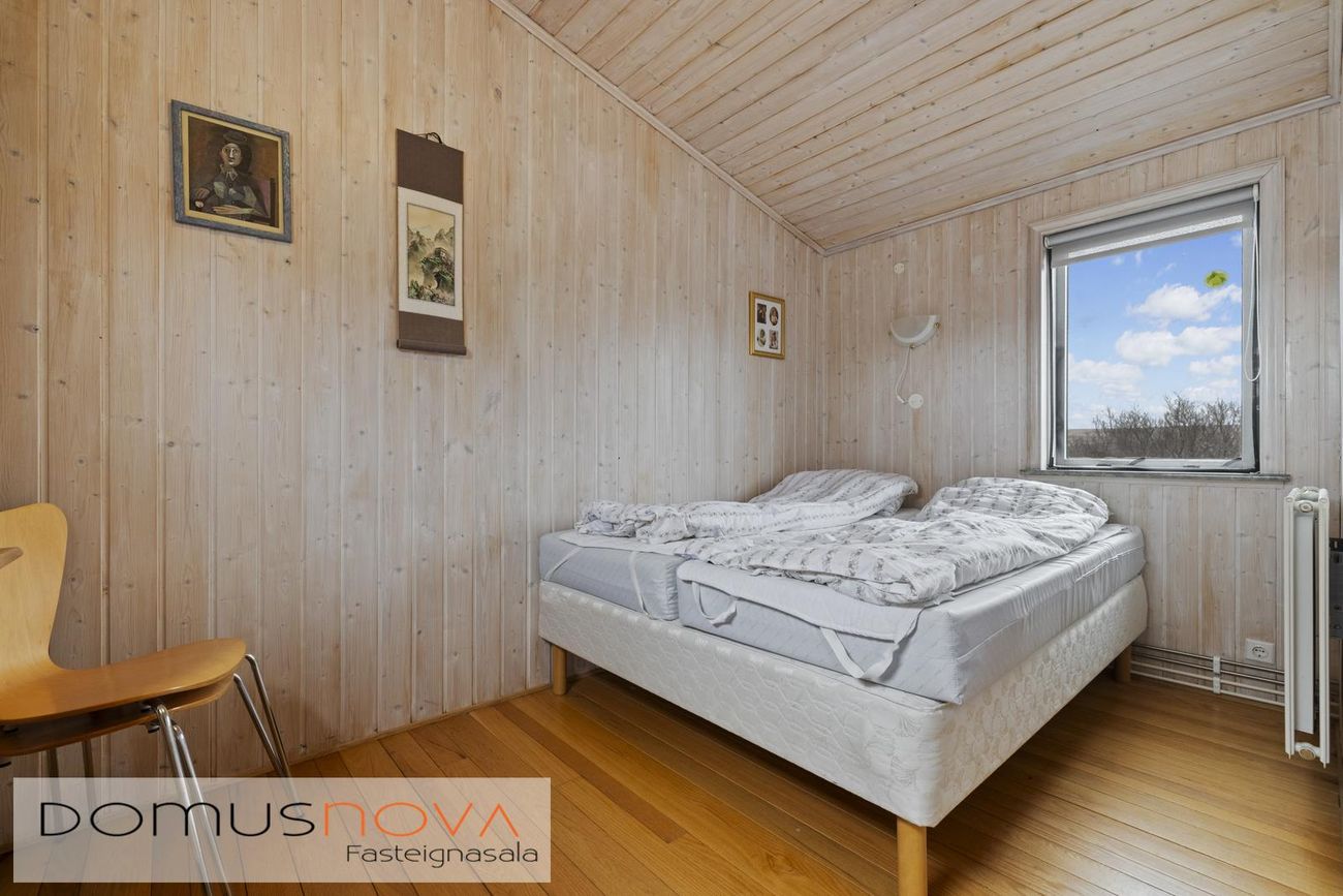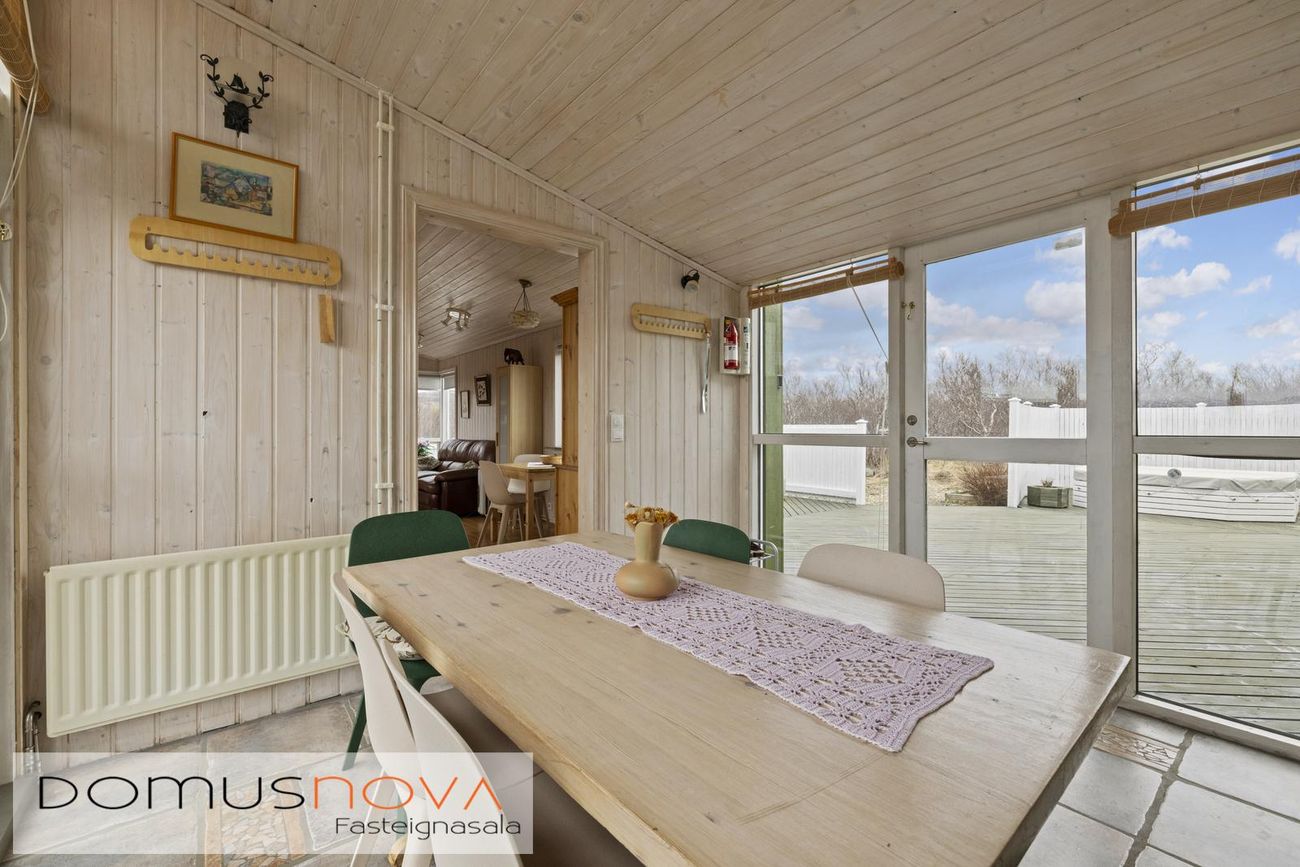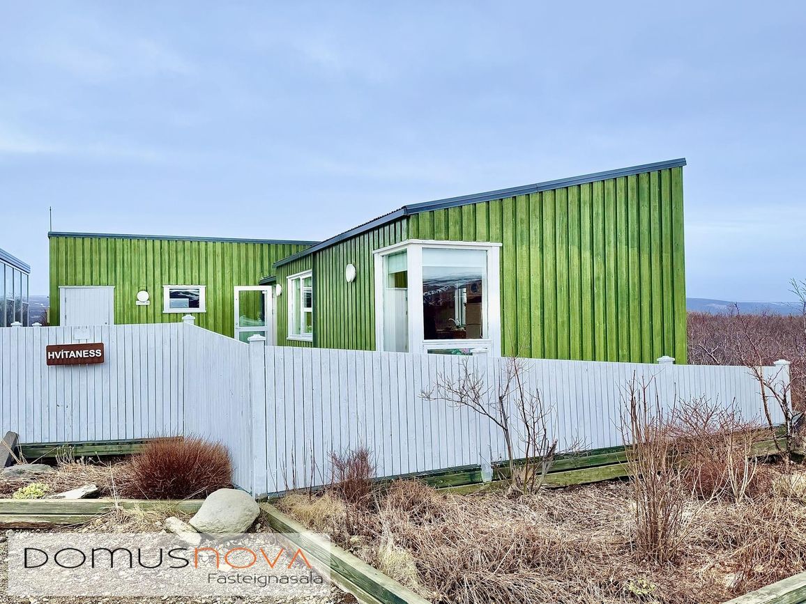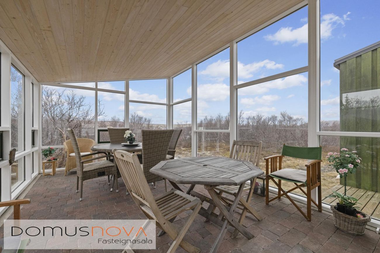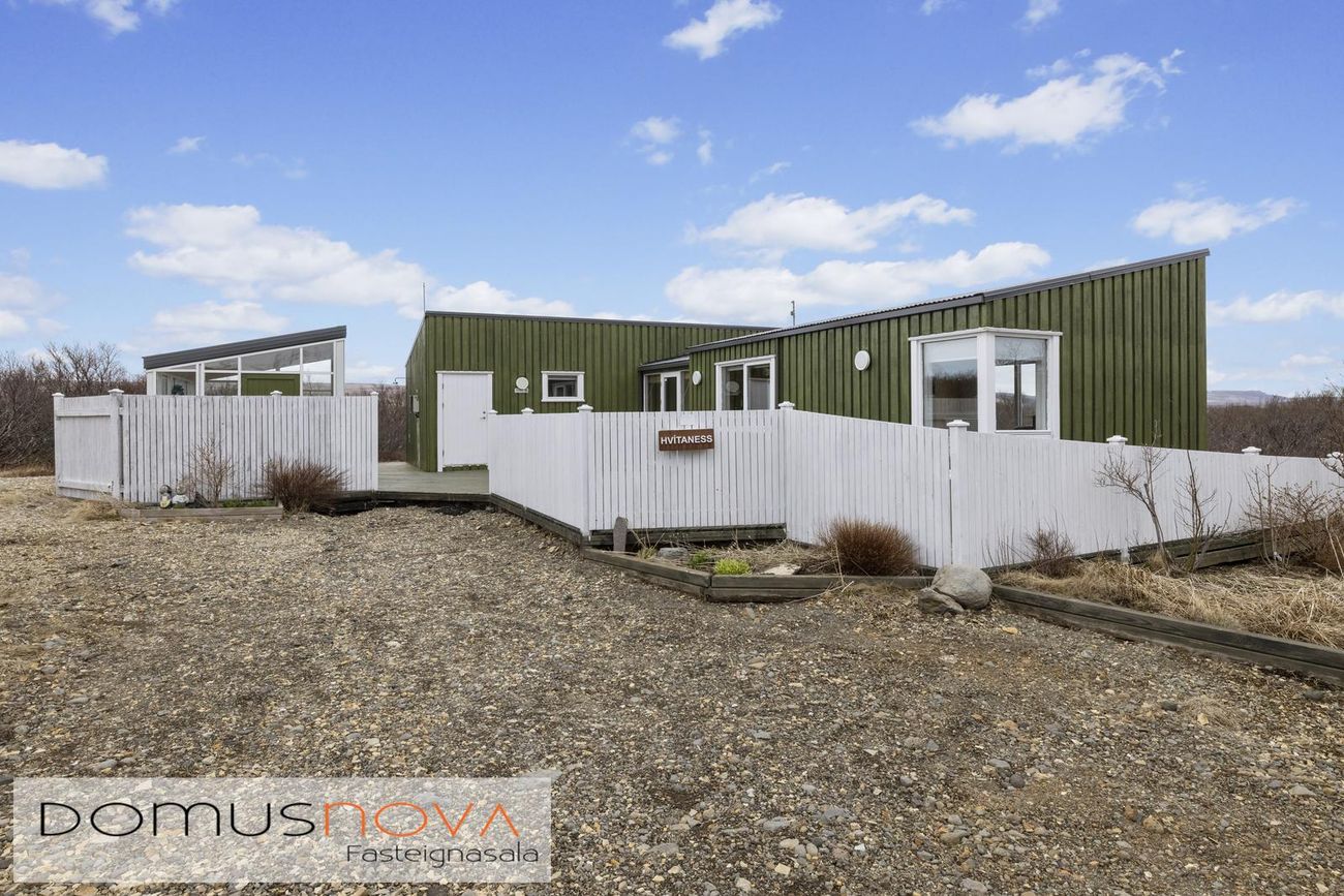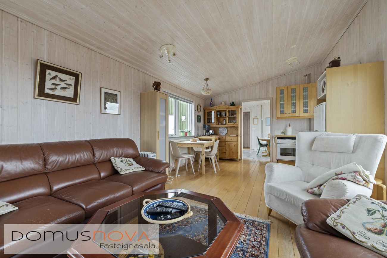 Aðalhús 76,8 fm og gestahús 22 fm á 6.500 fm leigulóð. Opinn grunnhönnuður rými með parketgólfum og aukinni lofthæð.