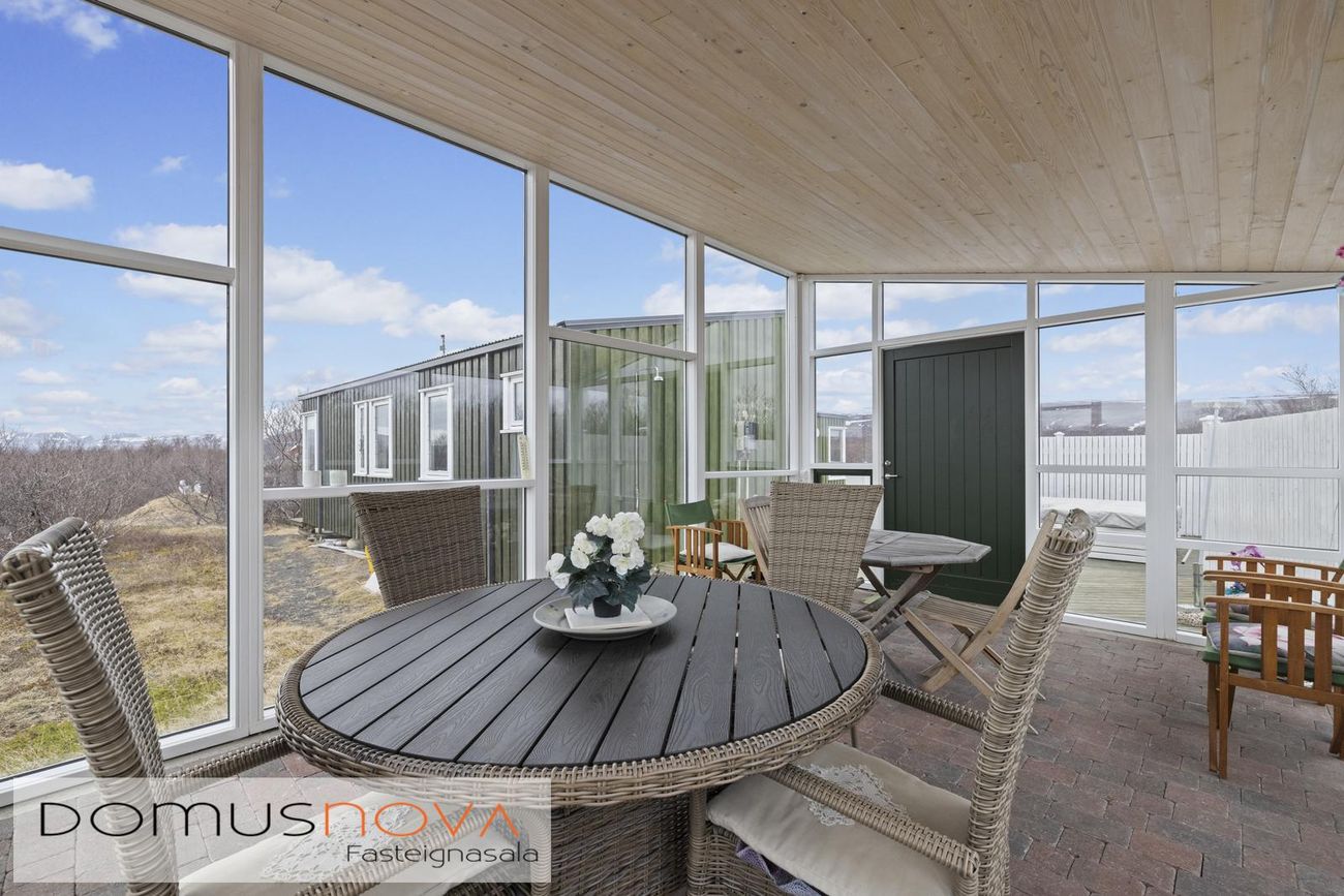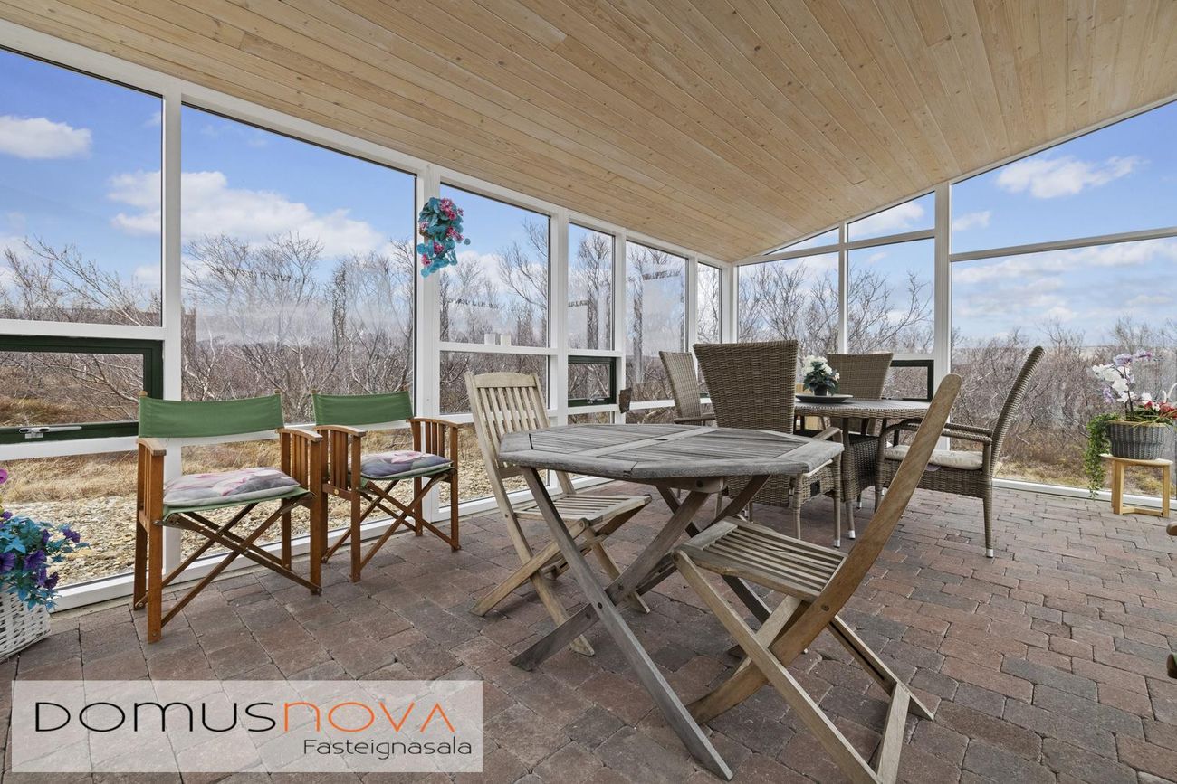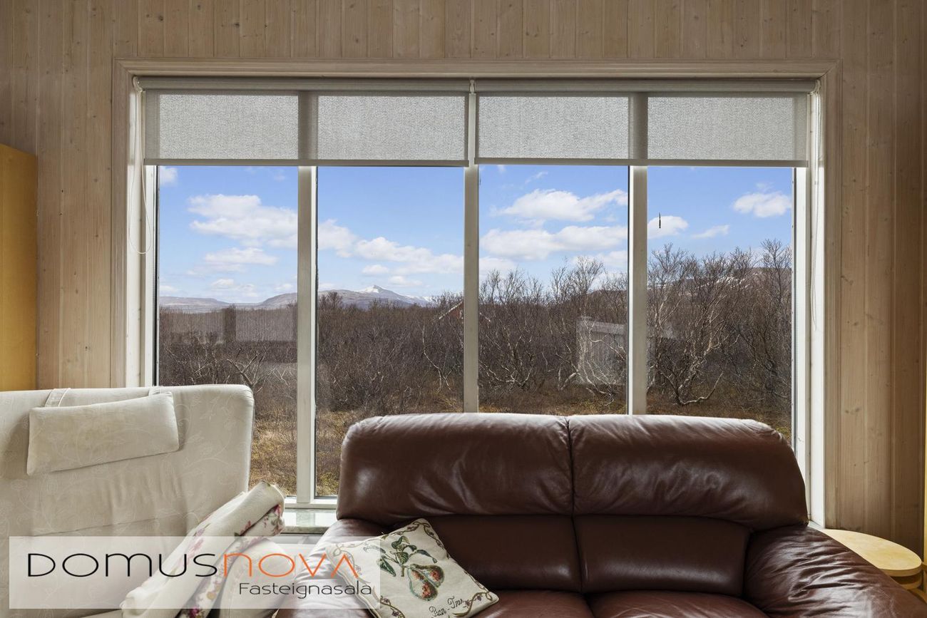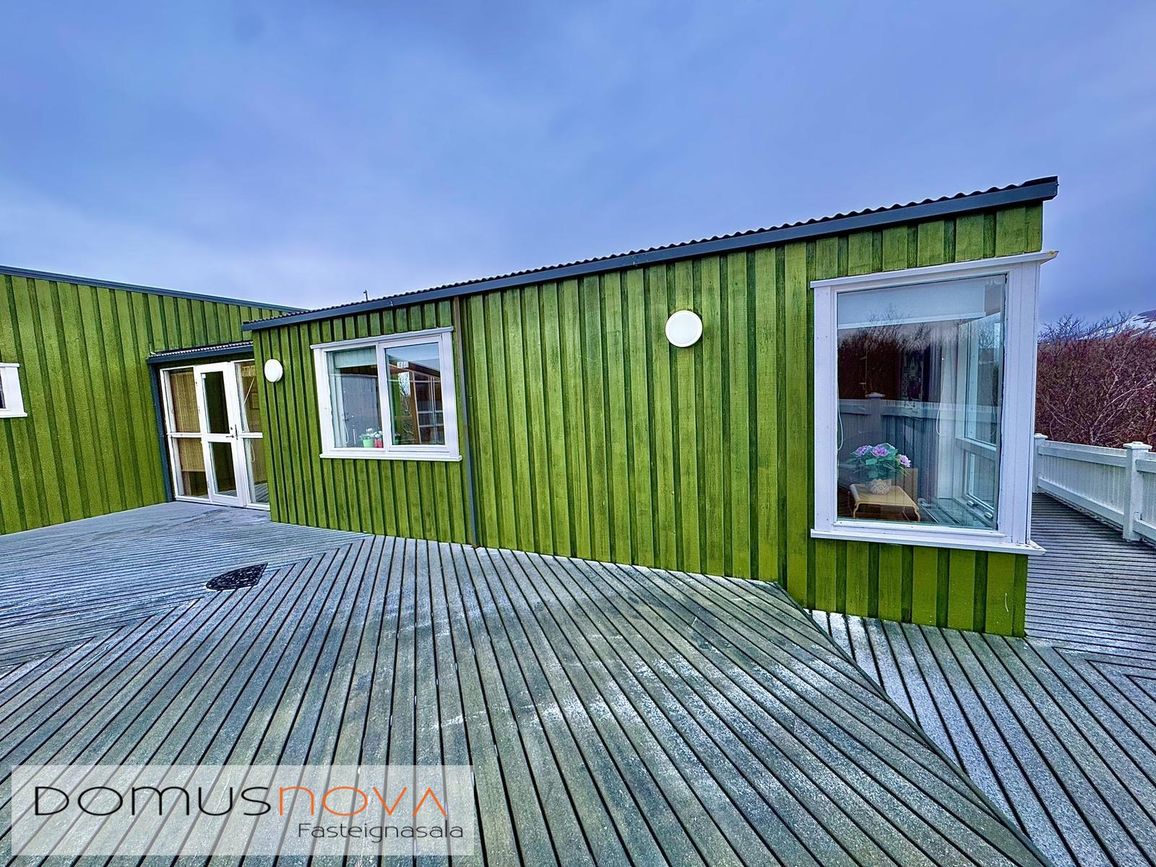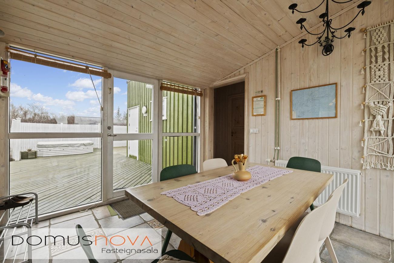 Aðalhús 76,8 fm og gestahús 22 fm á 6.500 fm leigulóð. Opinn grunnhönnuður rými með parketgólfum og aukinni lofthæð.