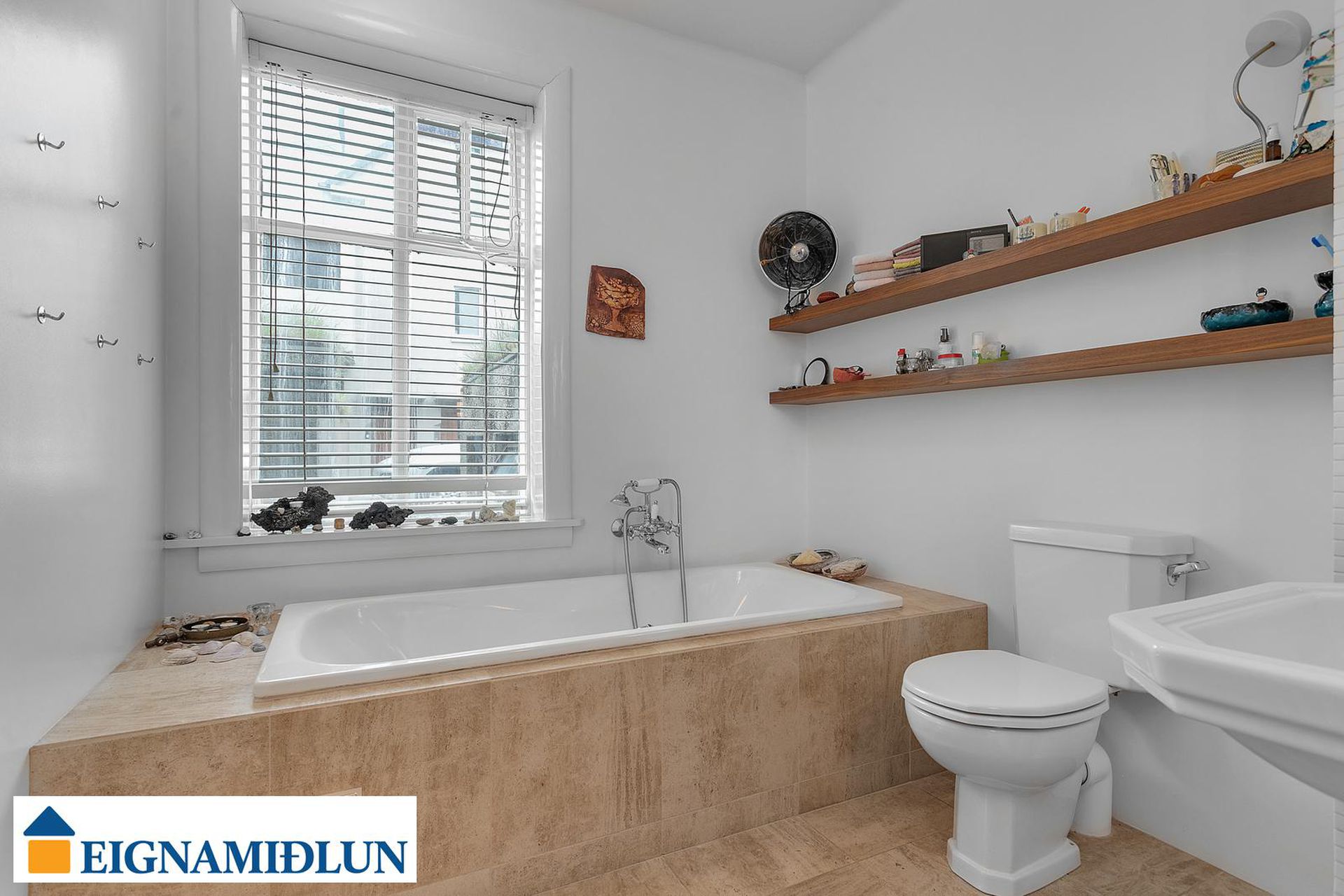 Nýlega útbúið þvottahús. Aðstaða fyrir þvottavél og þurrkara í vinnuhæð. Flísar á gólfi, handklæðaofn og opnanlegur gluggi.