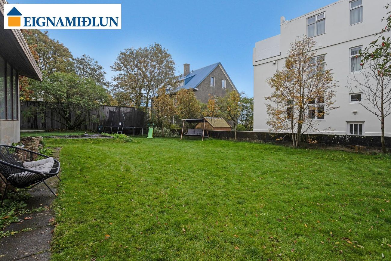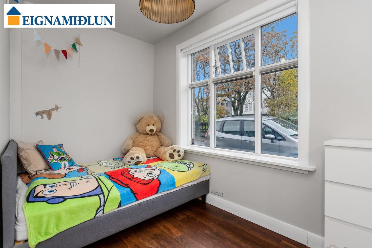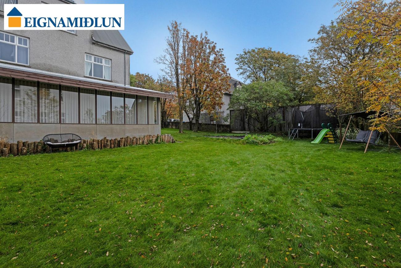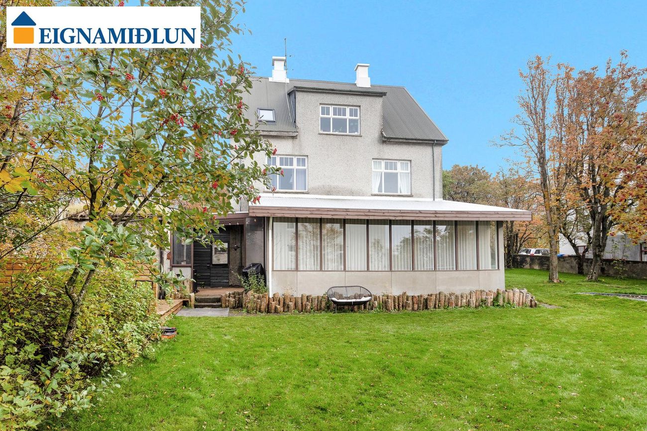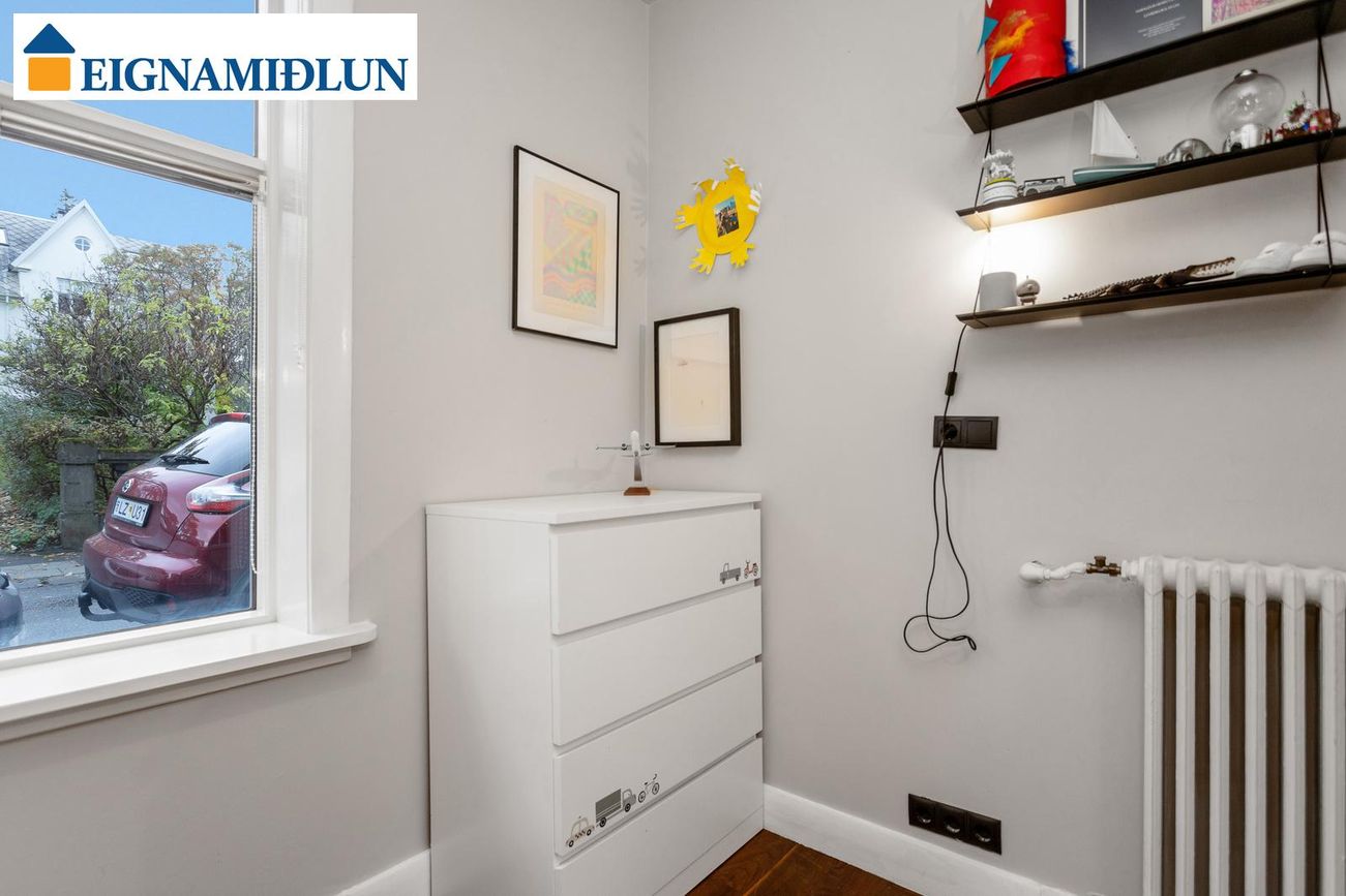 Glæsileg 4ja herbergja sérhæð á einstaklega fallegum stað við Fjölnisveg í Þingholtunum, einni af fallegustu götum borgarinnar. Falleg eign með stórum garði á eftirsóknarverðum stað þar sem miðbær Reykjavíkur er í göngufæri og stutt í leikskóla, skóla og helstu þjónustu. Birt stærð er 149,5 fm og skiptist eignin í íbúð skráða 121,5 fm og bílskúr, þar sem hefur verið gerð stúdíó-íbúð, skráður 28 fm. Húsið er byggt árið 1930, bílskúr árið 1939 og viðbygging árið 1982.Nánari lýsing:Gengið er inn um sameiginlegan inngang frá götu, fatahengi og geymsluskápur er utan íbúðar áður en gengið er inn. Þaðan er gengið inn á gang sem tengir saman flest rými íbúðarinnar, gegnheil hnota er á gólfum og nýlegur hljóðdúkur í lofti með innfelldri lýsingu.