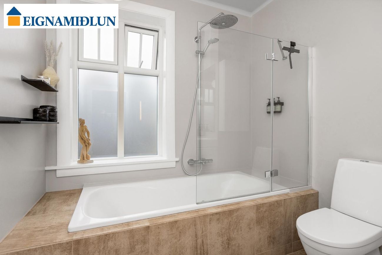 Baðherbergið er glæsilegt með sandsteinsflísum á gólfi og í kringum baðkar. Sturta er við baðkar með glerskilrými. Nýlegt salerni.