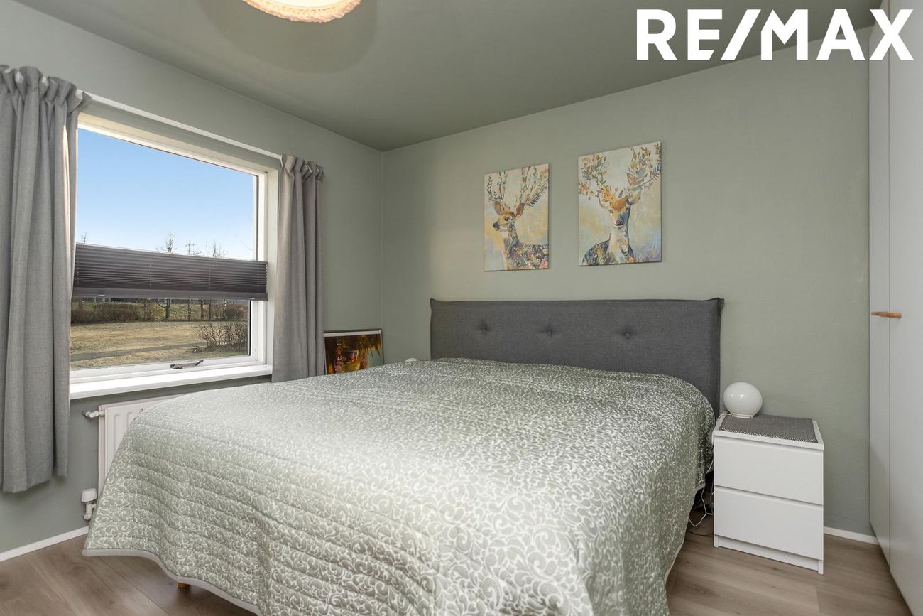 Tvö rúmgóð barnaherbergi með parket á gólfi og gluggum í austur. Rúmgott hjónaherbergi með parket á gólfi, innbyggðum fataskáp og glugga í austur.
