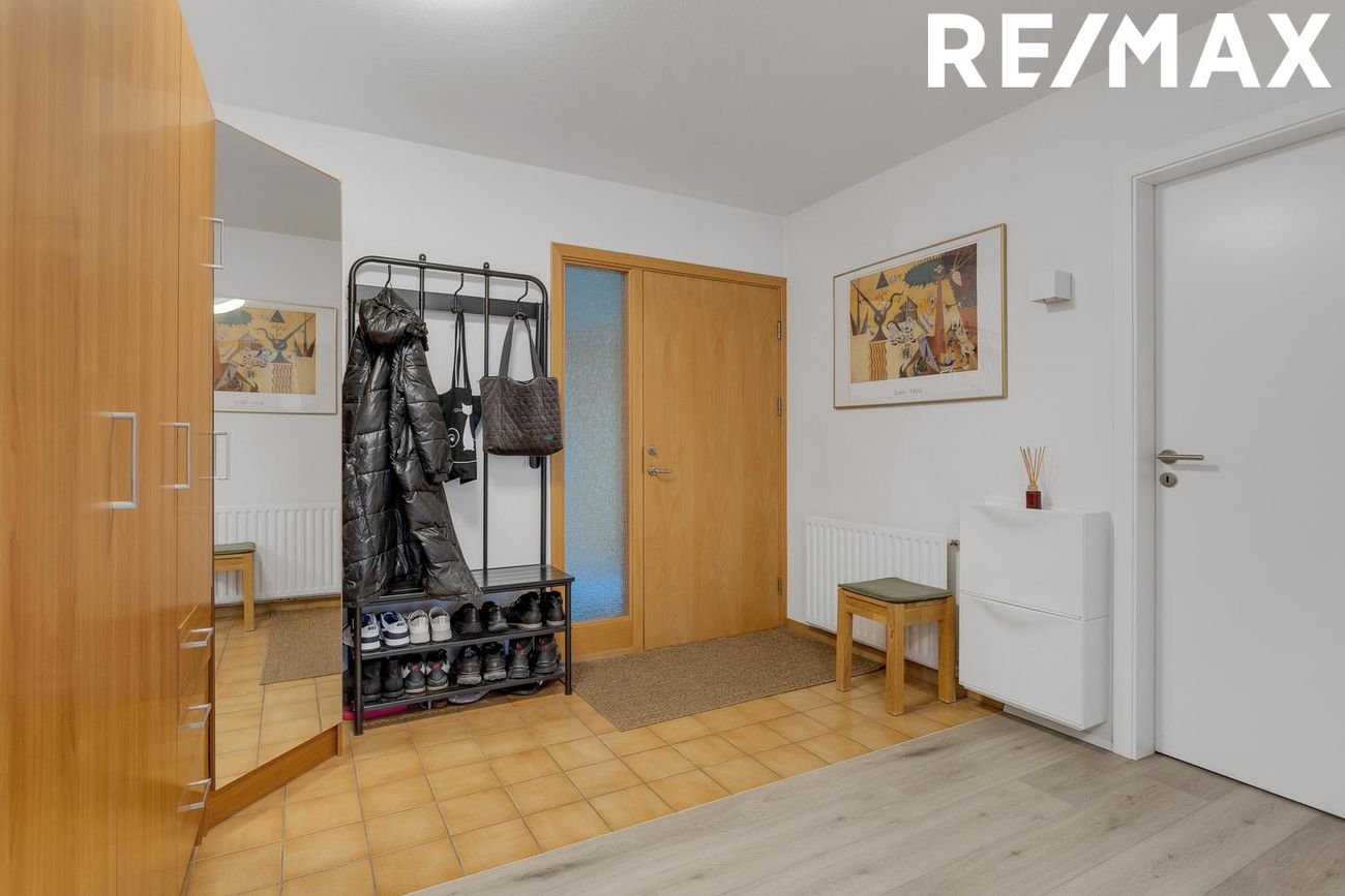 Forstofa / hol innan íbúðar með flísum og parketi á gólfi og vönduðum fataskápum.