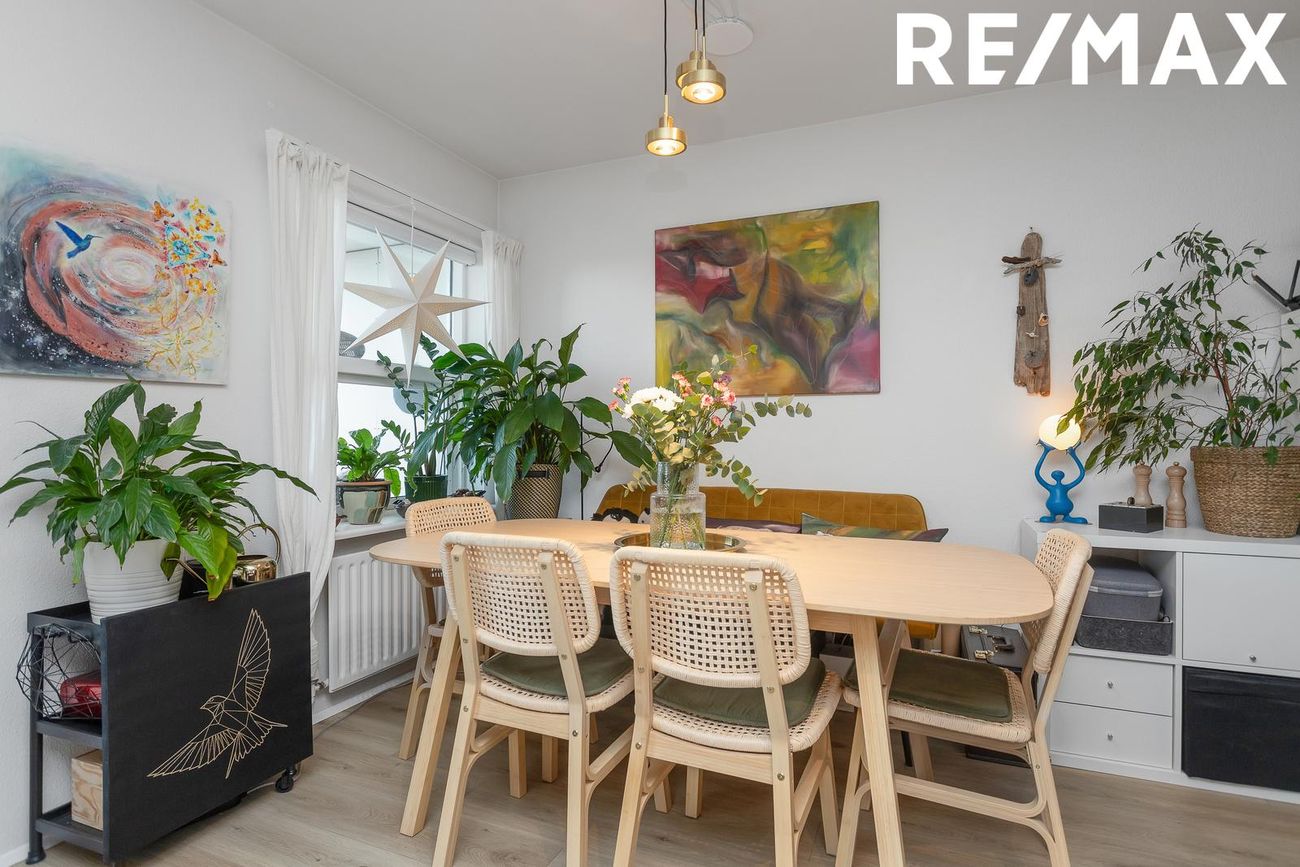 Ljóst eldhús með ljósri innréttingu og borðkrók með stórum gluggum. Útgengi út á grill svalir sem snúa í suður.