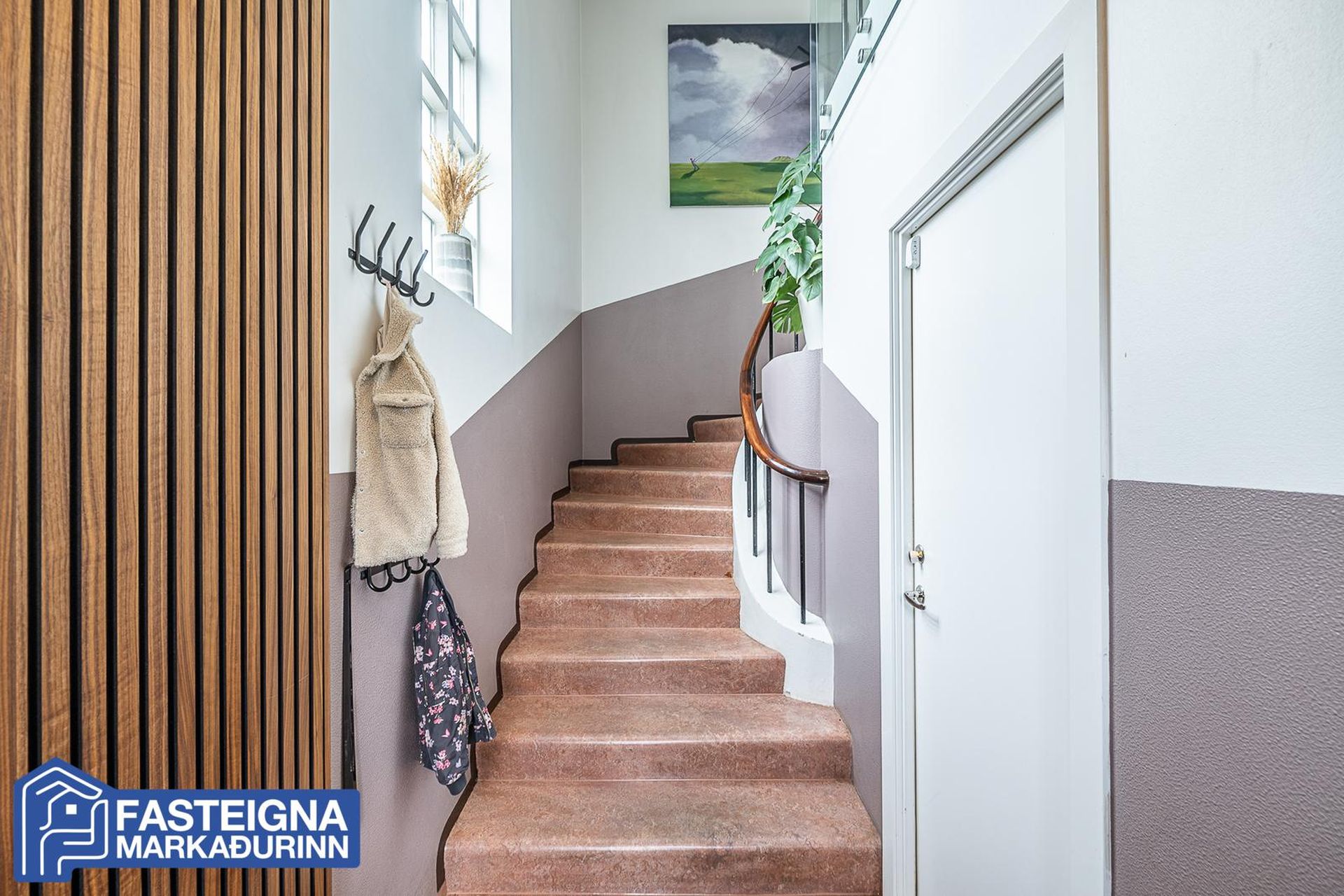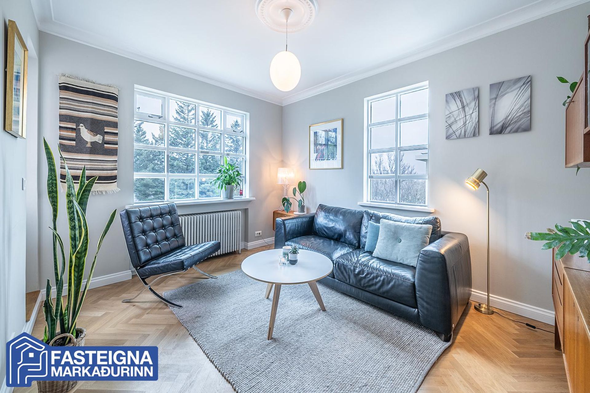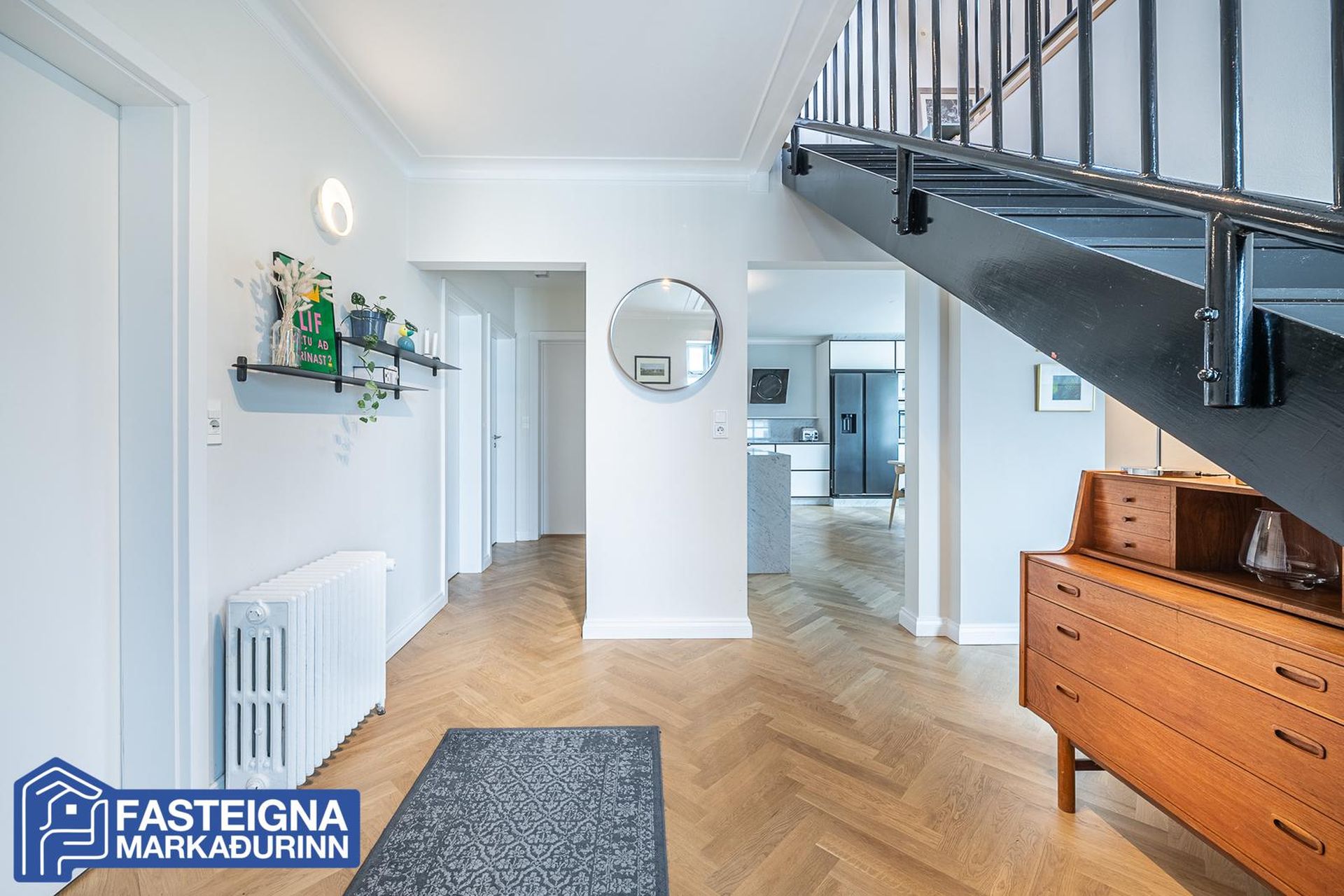Fasteignamarkaðurinn ehf. s: 570-4500 kynnir til sölu virkilega glæsilega, vel skipulagða og mikið endurnýjaða 159,0 fermetra sérhæð og ris og þar af 23,0 fermetra bílskúr í reisulegu steinhúsi á einstaklega góðum stað við Flókagötu teiknað af Halldóri Jónssyni. Eignin hefur verið mikið endurnýjuð nýlega, gegnheilt fiskibeinaparket lagt á alla hæðina, hurðarop breikkuð og settar nýjar hurði með Arne Jacobsen hurðahúnum svo fátt eitt sé nefnt. Einnig hefur eldhúsið verið endurnýjað og þakið á liðnum árum. Einstaklega fallegir gluggar eru á allri aðalhæðinni og svalir til suðurs frá stofu með útsýni yfir Klambratúnið. Sérinngangur er í eignina sem er á tveim hæðum þar af ris sem er undir súð og því nýtanlegir fermetrar fleiri er birt stærð segir til um.Eignin skiptist í stigahús með góðum palli, 4 svefnherbergi, stofu, eldhús og borðstofu í einu rými, tvö baðherbergi, holi, svefnherbergisgangi, vinnurými og svo er sameiginlega þvottaherbergi og þurrkherbergi í kjallara hússins. Bílskúr er við vesturhlið hússins og er með geymslu inn af og sérstæði fyrir framan.Lýsing eignar:Aðalhæð:Inngangur, einstaklega rúmgóður með linoleum dúk á gólfi og stiga, gengið upp eina hæð og er með fataskáp á palli.Hol, parketlagt og gengið upp á risloft.Herbergi I, parketlagt, með fataskáp.Svefnherbergisgangur, parketlagður, með fataskáp á heilum vegg.Herbergi ll, parketlagt með fataskáp og sérhönnuðum hillum.Hjónaherbergi, parketlagt með fataskáp á heilum vegg.Baðherbergi, flísalagt gólf og veggir, baðkar, ný innrétting við vask með nýjum Vola blöndunartækjum og er með glugga.Eldhús / borðstofa, parketlagt, og einstaklega rúmgott með góðri borðaðstöðu, opin við stofu og einnig frá holi. Fallega sérsmíðaðar innréttingar með marmara á borði og uppá vegg. Innbyggð uppþvottavél, spanhelluborð, vifta, tveir ofnar, og gert er ráð fyrir tvöföldum ísskáp. Stofa, parketlögð, með glugga í tvær áttir, gengið frá holi og opin við eldhús. Gengið er út á góðar suðursvalir með fallegu útsýni yfir Klambratún.Rishæð,Gengið upp veglegan járnstiga með parketlögðum tröppum.Hol, parketlagt, og eru tvö rými sem eru nýtt sem vinnuaðstaða í dag.Baðherbergi, með glugga, flísalagt gólf og veggir, innrétting, vegghengt wc og flísalagður sturtuklefi. Gert er ráð fyrir þvottavél á baðherbergi.Herbergi IIl, rúmgott, parketlagt með fallegum þakgluggum.Geymsluherbergi, málað gólf, er inn af svefnherbergi og er nýtt sem leikherbergi í dag. Bílskúr, með rafmagni, hita, rennandi heitu og köldu vatni með sjálfvirkum hurðaopnara og búið er að setja upp tengi fyrir rafbíl. Steypt aðkeyrsl er frá götu og sérstæði er fyrir framan.Húsið að utan lítur vel út, er vel byggt og hefur hlotið gott viðhald. Samkvæmt seljanda var þakið endurnýja 2006 og lagnir undir húsi endurnýjaðar nýlega. Lóðin, sem er 720,0 fermetrar að stærð, er gróin og sameiginleg með öðrum eignarhlutum hússins. Á framlóð er tyrfð flöt með trjágróðri og baklóð er með grófri möl. Staðstetning eignarinnar er virkilega góð miðsvæðis í Reykjavík gengt Kjarvalstöðum. Örstutt er í Klambratún, Kjarvalstaði, grunnskóla, menntaskóla, Sundhöllina, miðbæinn ásamt verslun og þjónustu. Allar nánari upplýsingar veittar á skrifstofu Fasteignamarkaðarins ehf. í síma 570-4500 eða á netfanginu