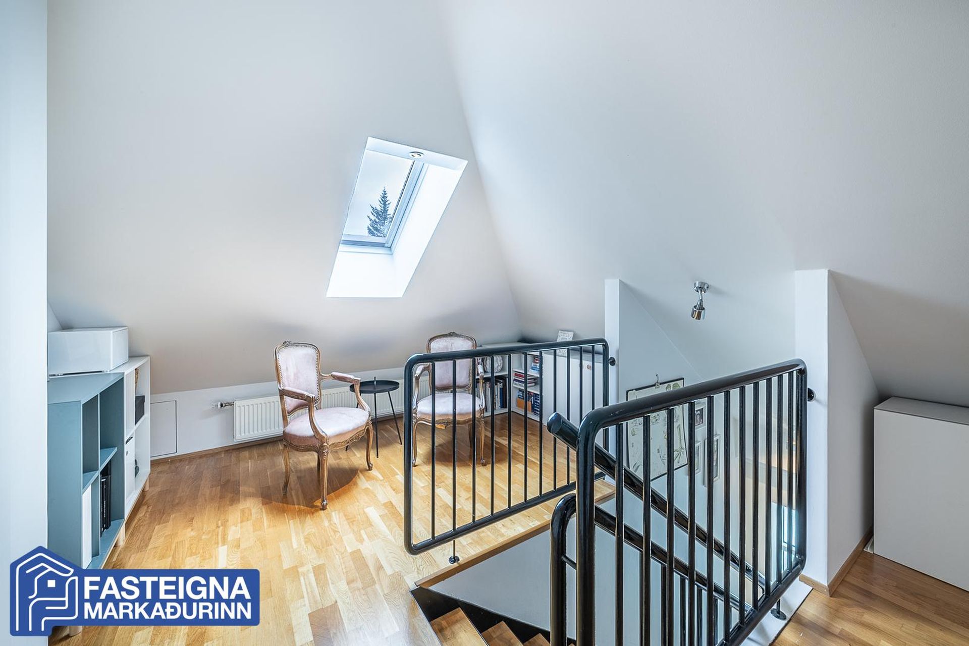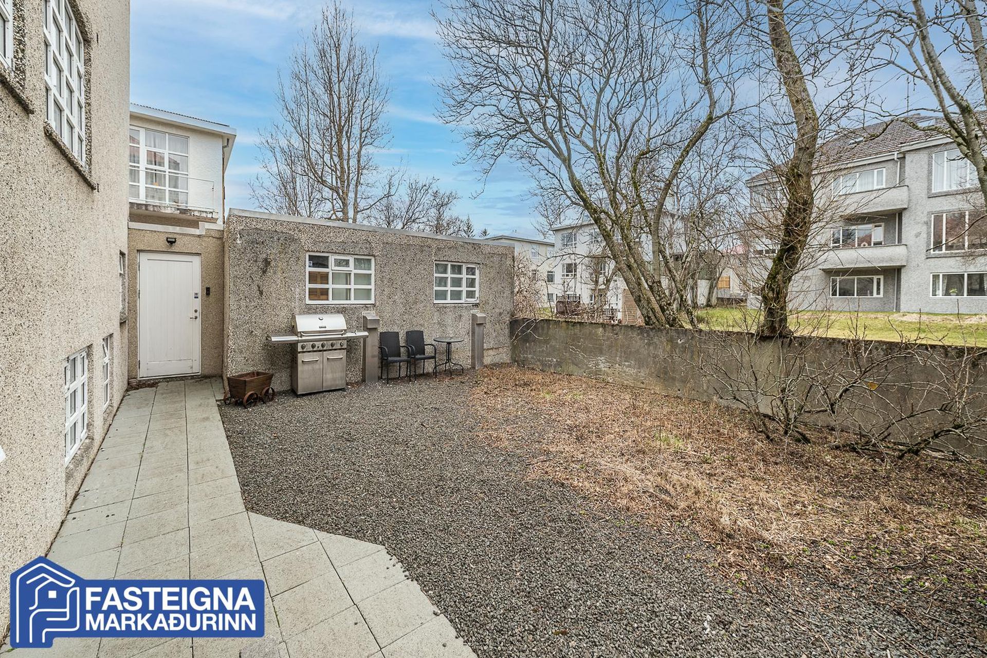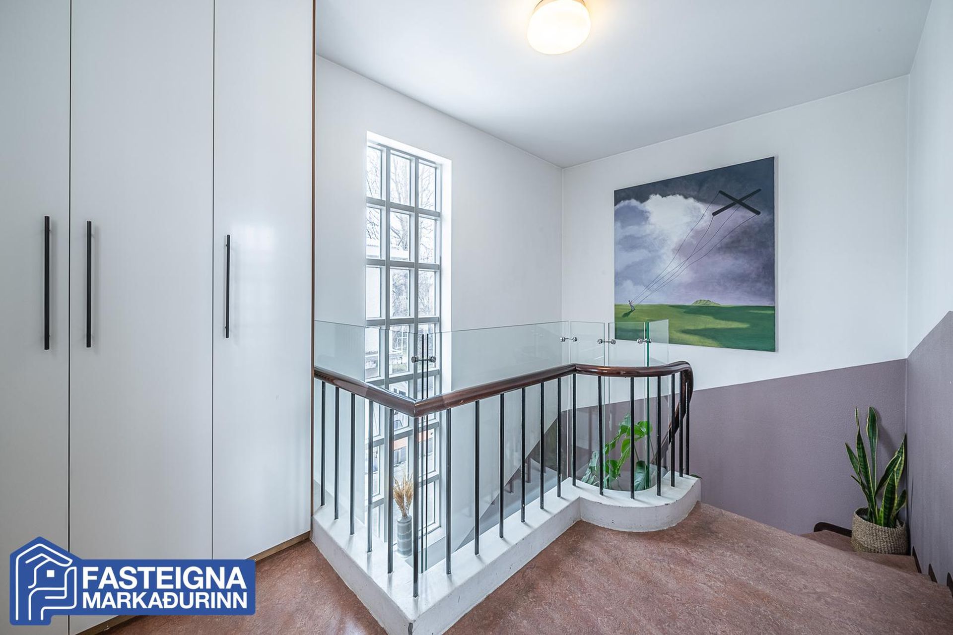 Fasteignamarkaðurinn ehf. s: 570-4500 kynnir til sölu virkilega glæsilega, vel skipulagða og mikið endurnýjaða 159,0 fermetra sérhæð og ris og þar af 23,0 fermetra bílskúr í reisulegu steinhúsi á einstaklega góðum stað við Flókagötu teiknað af Halldóri Jónssyni. Eignin hefur verið mikið endurnýjuð nýlega, gegnheilt fiskibeinaparket lagt á alla hæðina, hurðarop breikkuð og settar nýjar hurði með Arne Jacobsen hurðahúnum svo fátt eitt sé nefnt. Einnig hefur eldhúsið verið endurnýjað og þakið á liðnum árum. Einstaklega fallegir gluggar eru á allri aðalhæðinni og svalir til suðurs frá stofu með útsýni yfir Klambratúnið. Sérinngangur er í eignina sem er á tveim hæðum þar af ris sem er undir súð og því nýtanlegir fermetrar fleiri er birt stærð segir til um.Eignin skiptist í stigahús með góðum palli, 4 svefnherbergi, stofu, eldhús og borðstofu í einu rými, tvö baðherbergi, holi, svefnherbergisgangi, vinnurými og svo er sameiginlega þvottaherbergi og þurrkherbergi í kjallara hússins. Bílskúr er við vesturhlið hússins og er með geymslu inn af og sérstæði fyrir framan.Lýsing eignar:Aðalhæð:Inngangur, einstaklega rúmgóður með linoleum dúk á gólfi og stiga, gengið upp eina hæð og er með fataskáp á palli.Hol, parketlagt og gengið upp á risloft.Herbergi I, parketlagt, með fataskáp.Svefnherbergisgangur, parketlagður, með fataskáp á heilum vegg.Herbergi ll, parketlagt með fataskáp og sérhönnuðum hillum.Hjónaherbergi, parketlagt með fataskáp á heilum vegg.Baðherbergi, flísalagt gólf og veggir, baðkar, ný innrétting við vask með nýjum Vola blöndunartækjum og er með glugga.Eldhús / borðstofa, parketlagt, og einstaklega rúmgott með góðri borðaðstöðu, opin við stofu og einnig frá holi. Fallega sérsmíðaðar innréttingar með marmara á borði og uppá vegg. Innbyggð uppþvottavél, spanhelluborð, vifta, tveir ofnar, og gert er ráð fyrir tvöföldum ísskáp. Stofa, parketlögð, með glugga í tvær áttir, gengið frá holi og opin við eldhús. Gengið er út á góðar suðursvalir með fallegu útsýni yfir Klambratún.Rishæð,Gengið upp veglegan járnstiga með parketlögðum tröppum.Hol, parketlagt, og eru tvö rými sem eru nýtt sem vinnuaðstaða í dag.Baðherbergi, með glugga, flísalagt gólf og veggir, innrétting, vegghengt wc og flísalagður sturtuklefi. Gert er ráð fyrir þvottavél á baðherbergi.Herbergi IIl, rúmgott, parketlagt með fallegum þakgluggum.Geymsluherbergi, málað gólf, er inn af svefnherbergi og er nýtt sem leikherbergi í dag. Bílskúr, með rafmagni, hita, rennandi heitu og köldu vatni með sjálfvirkum hurðaopnara og búið er að setja upp tengi fyrir rafbíl. Steypt aðkeyrsl er frá götu og sérstæði er fyrir framan.Húsið að utan lítur vel út, er vel byggt og hefur hlotið gott viðhald. Samkvæmt seljanda var þakið endurnýja 2006 og lagnir undir húsi endurnýjaðar nýlega. Lóðin, sem er 720,0 fermetrar að stærð, er gróin og sameiginleg með öðrum eignarhlutum hússins. Á framlóð er tyrfð flöt með trjágróðri og baklóð er með grófri möl. Staðstetning eignarinnar er virkilega góð miðsvæðis í Reykjavík gengt Kjarvalstöðum. Örstutt er í Klambratún, Kjarvalstaði, grunnskóla, menntaskóla, Sundhöllina, miðbæinn ásamt verslun og þjónustu. Allar nánari upplýsingar veittar á skrifstofu Fasteignamarkaðarins ehf. í síma 570-4500 eða á netfanginu