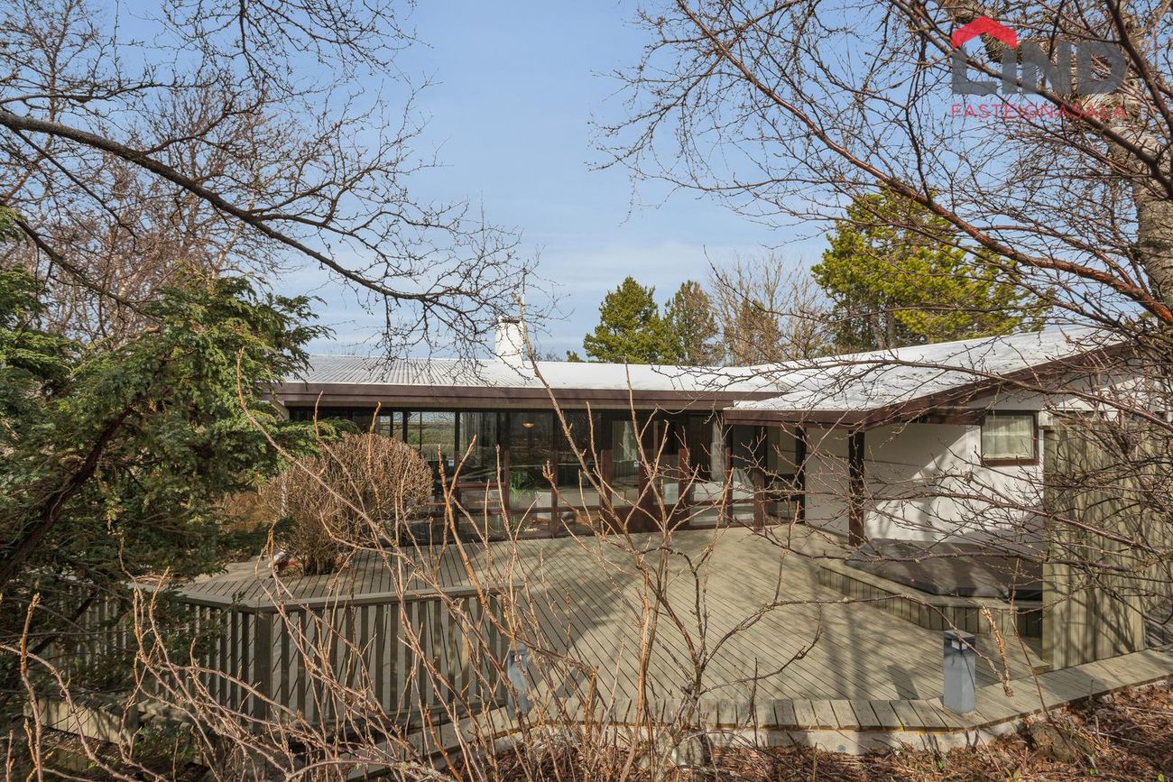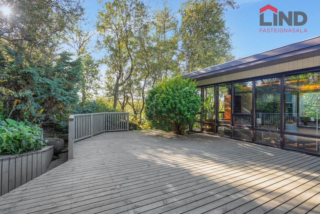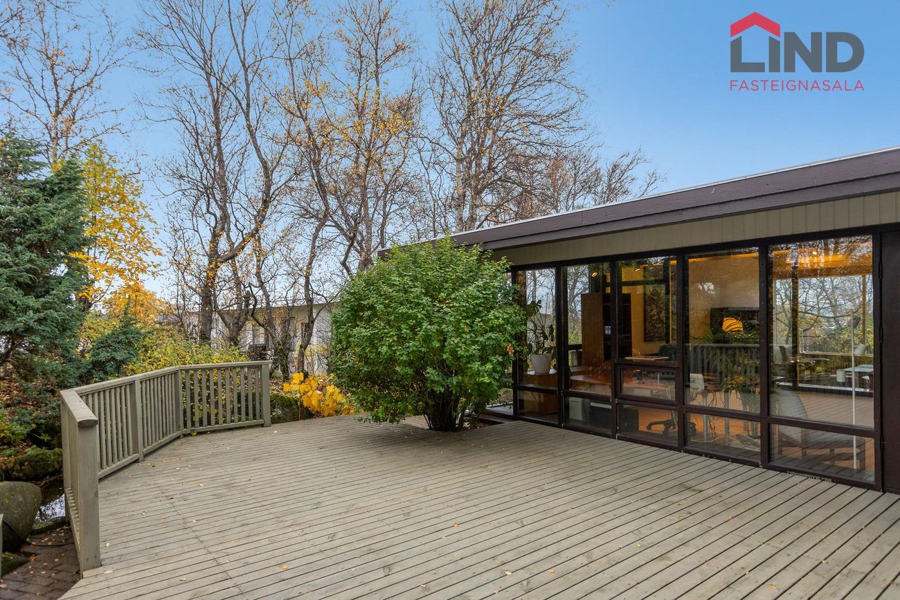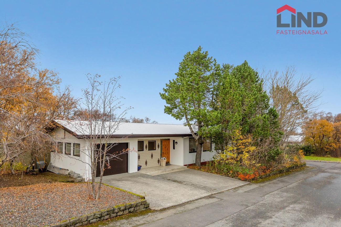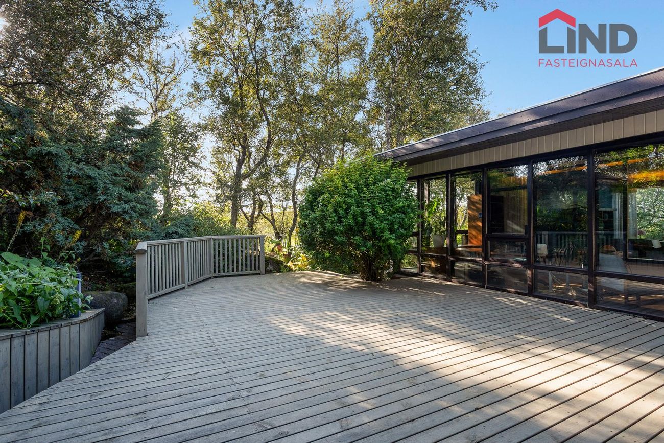 Einbýli á einni hæð. Fimm svefnherbergi, þar á meðal hjónaherbergi með fataherbergi. Opnar stofur með mikilli lofthæð og parketgólfi. Sólstofa með útgangi á pall. Bílskúr með steyptu gólfi, heitu og köldu vatni, og opnanlegum glugga. Sér geymsla.