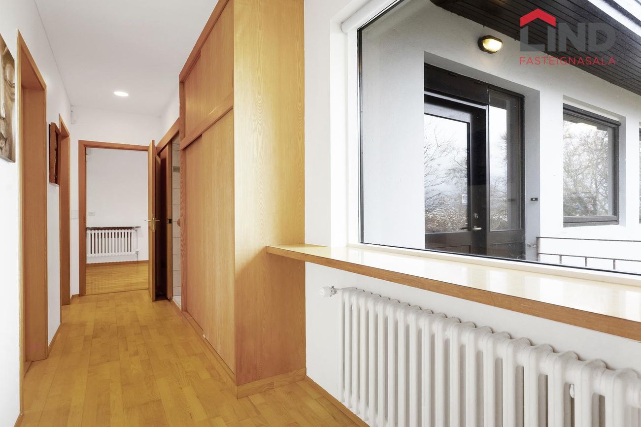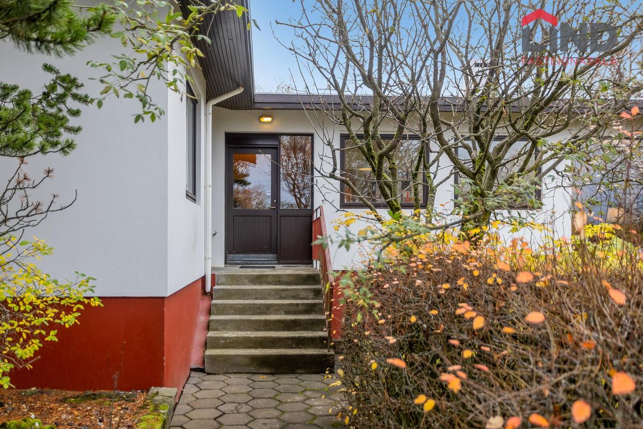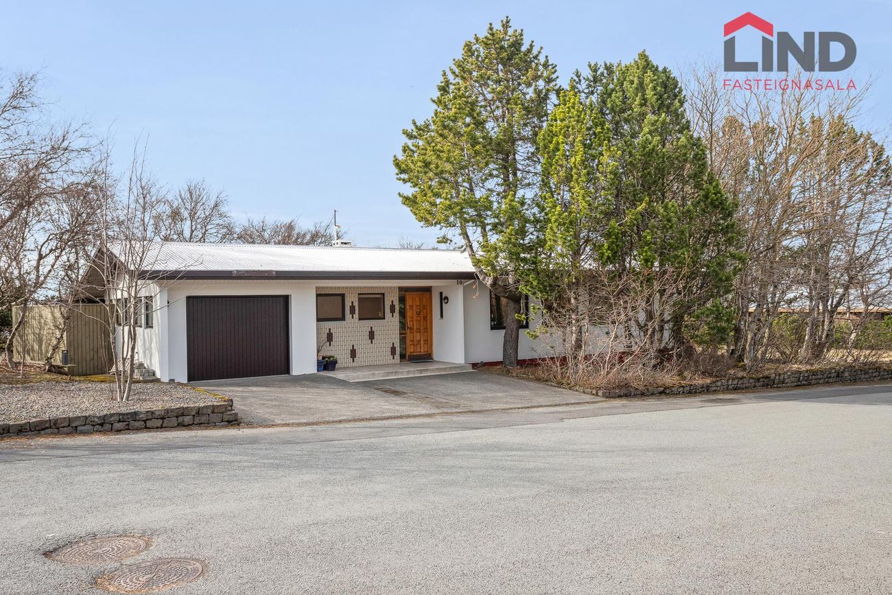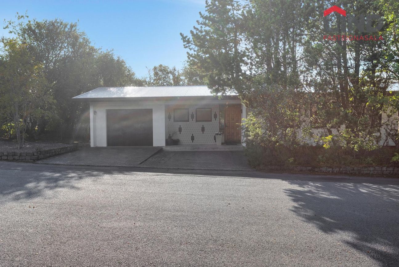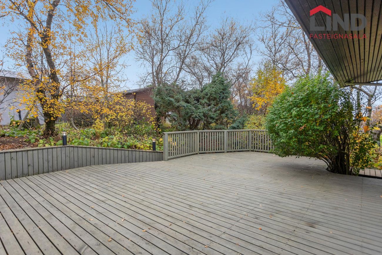 Einbýli á einni hæð. Fimm svefnherbergi, þar á meðal hjónaherbergi með fataherbergi. Opnar stofur með mikilli lofthæð og parketgólfi. Sólstofa með útgangi á pall. Bílskúr með steyptu gólfi, heitu og köldu vatni, og opnanlegum glugga. Sér geymsla.