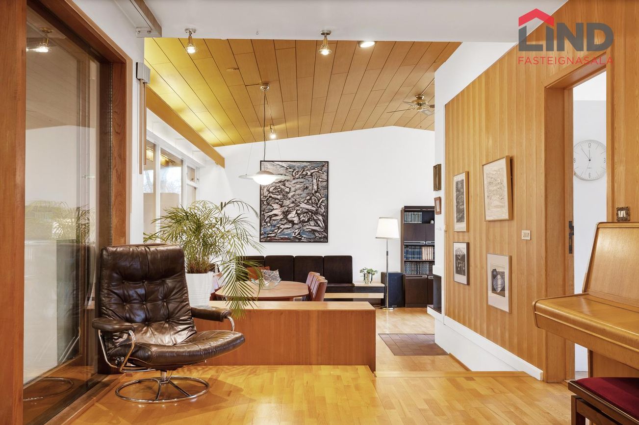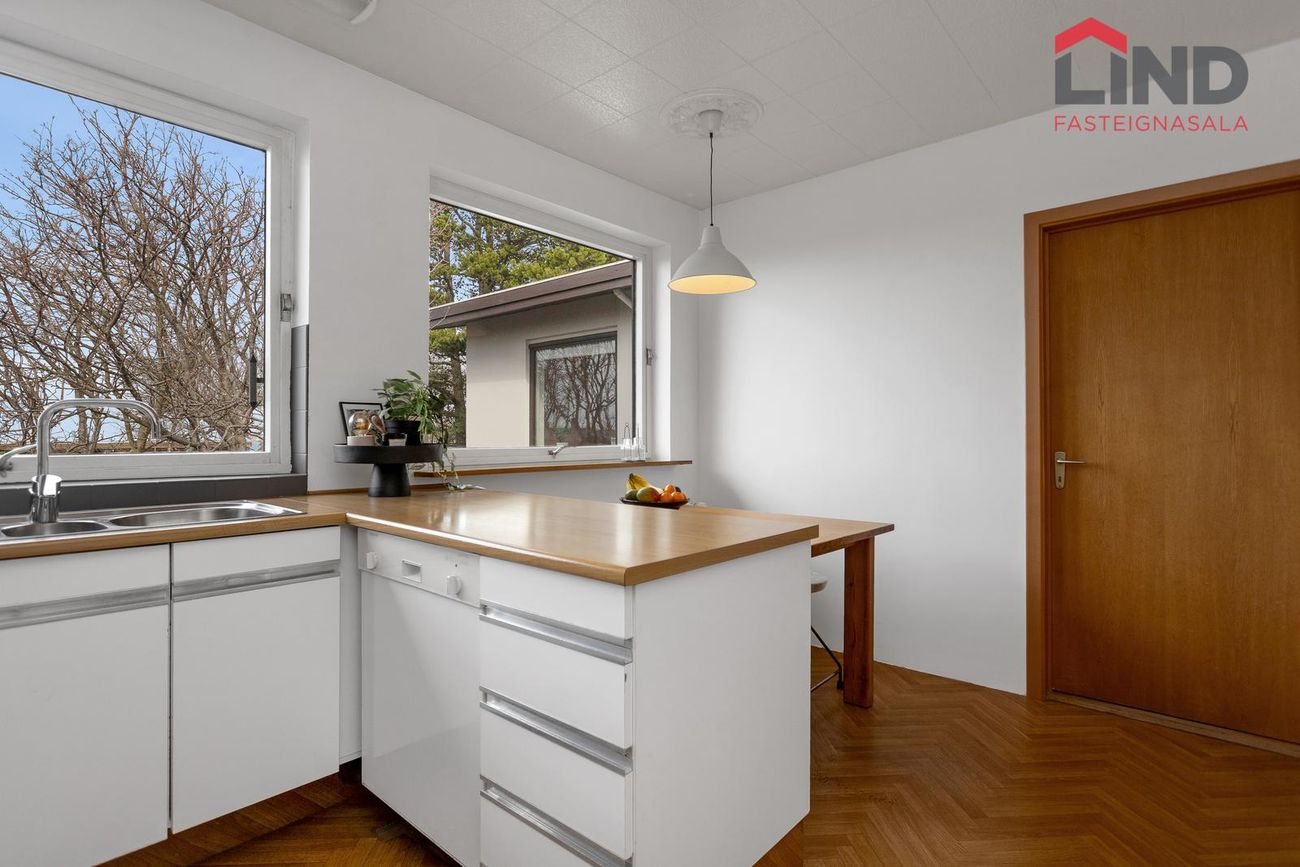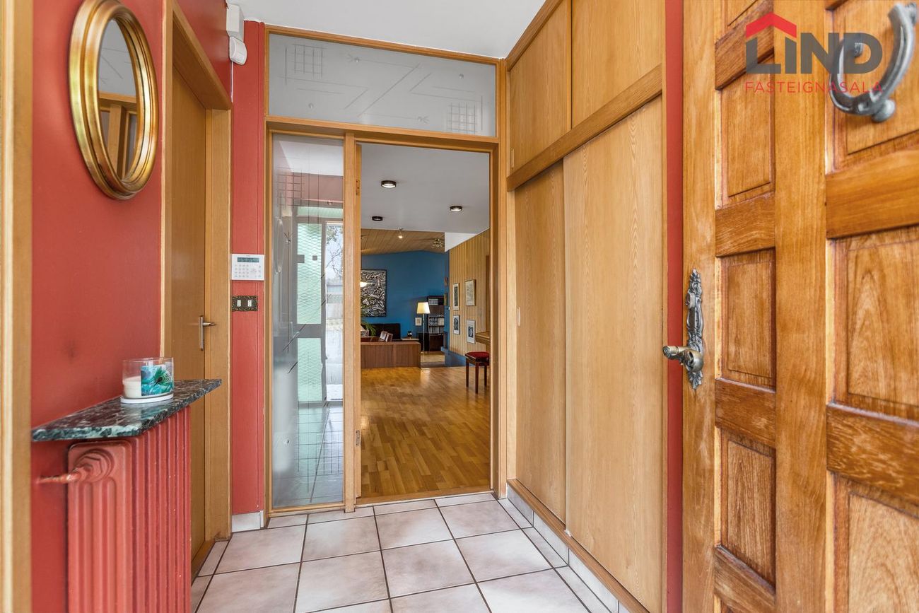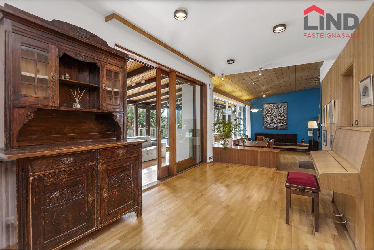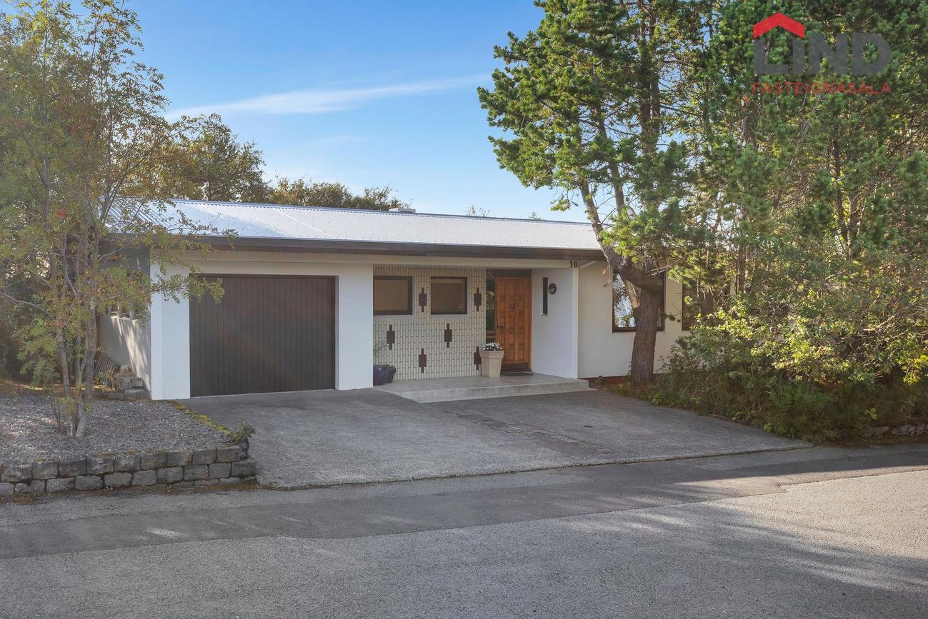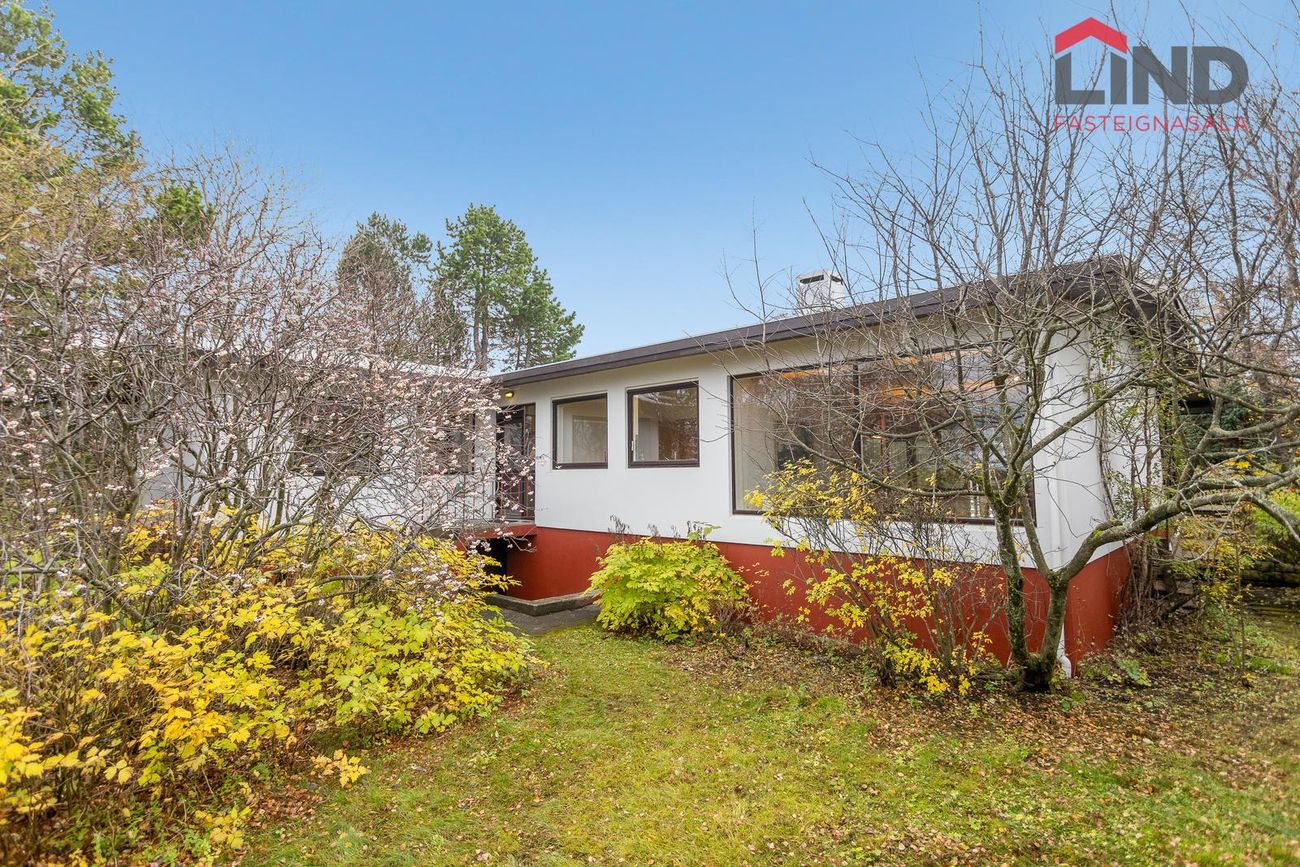 Einbýli á einni hæð. Fimm svefnherbergi, þar á meðal hjónaherbergi með fataherbergi. Opnar stofur með mikilli lofthæð og parketgólfi. Sólstofa með útgangi á pall. Bílskúr með steyptu gólfi, heitu og köldu vatni, og opnanlegum glugga. Sér geymsla.