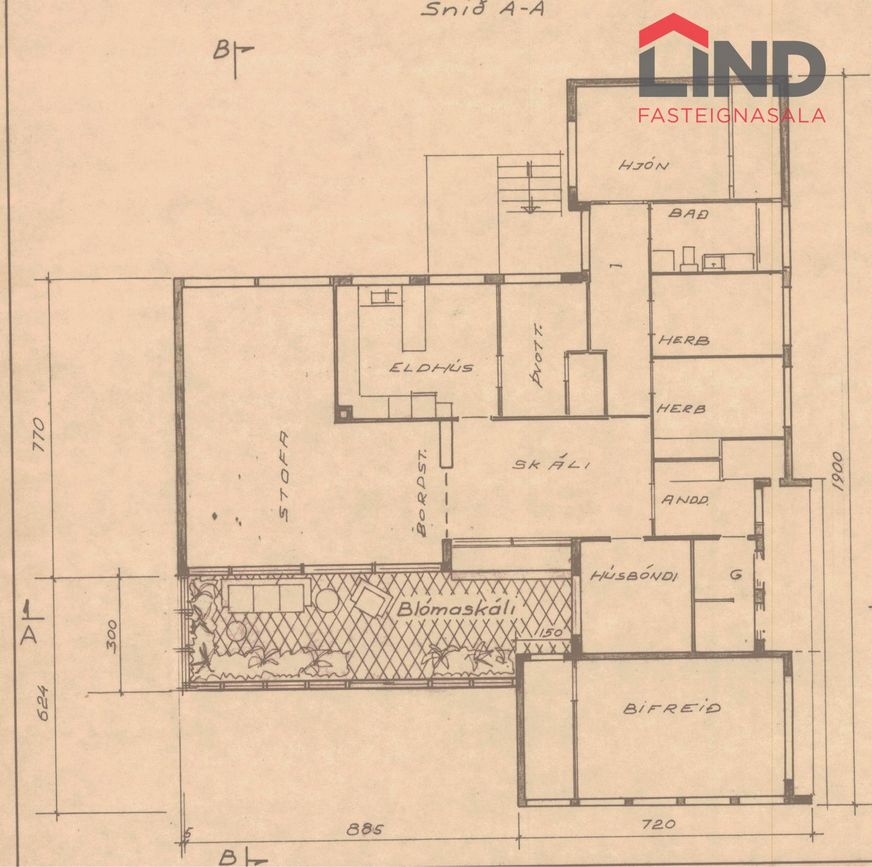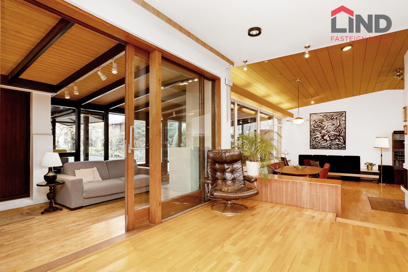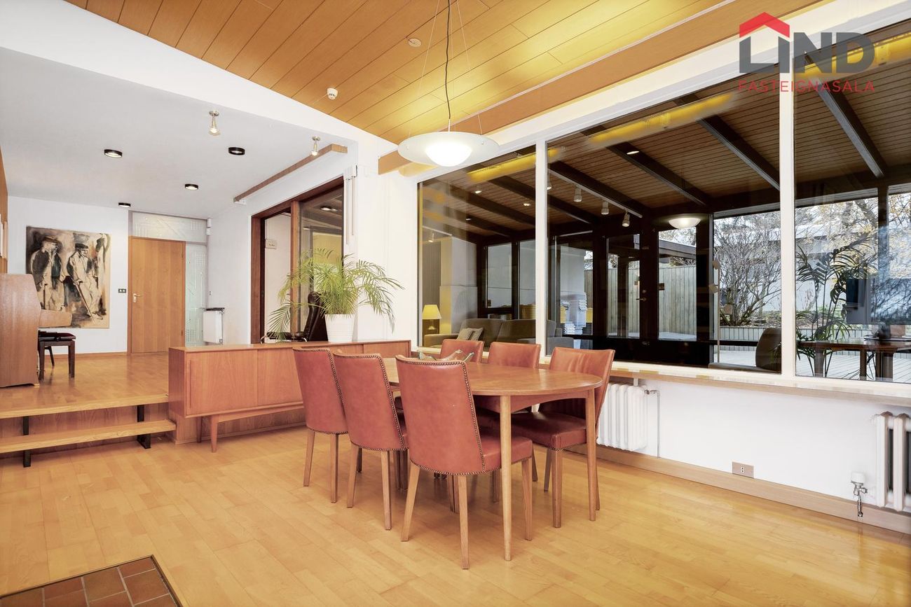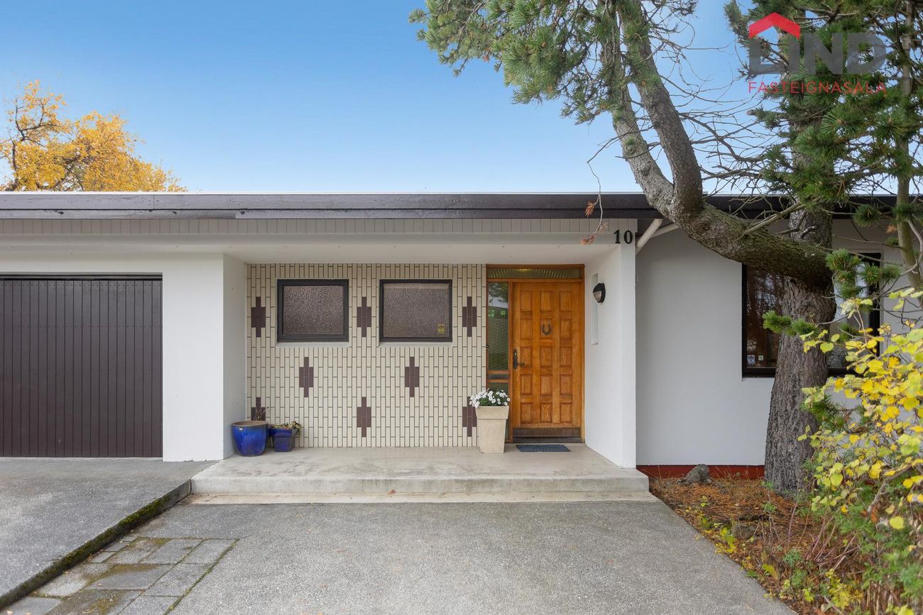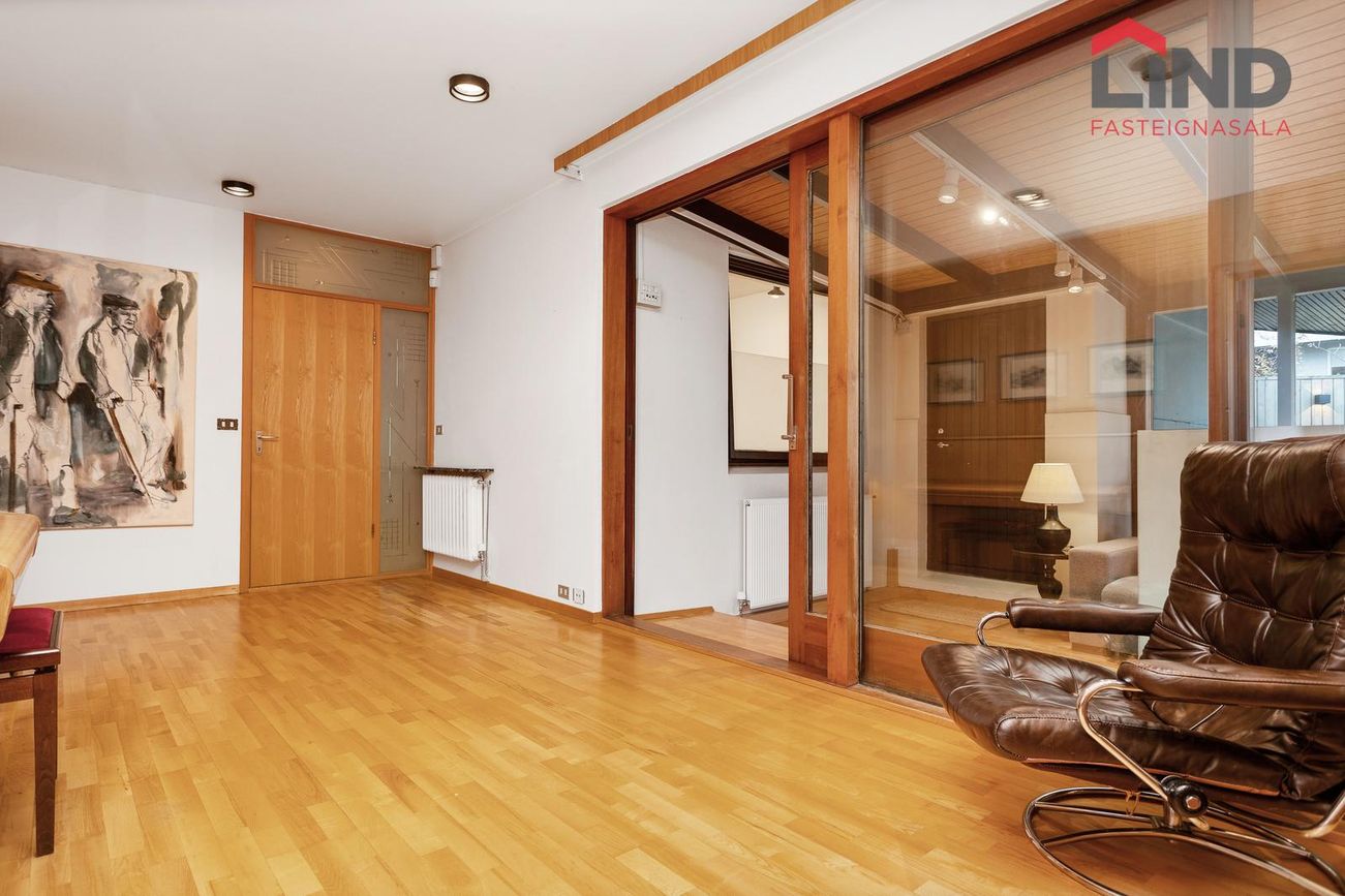 Einbýli á einni hæð. Fimm svefnherbergi, þar á meðal hjónaherbergi með fataherbergi. Opnar stofur með mikilli lofthæð og parketgólfi. Sólstofa með útgangi á pall. Bílskúr með steyptu gólfi, heitu og köldu vatni, og opnanlegum glugga. Sér geymsla.