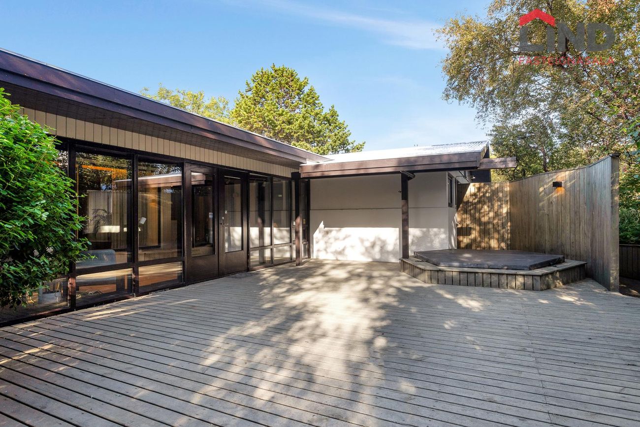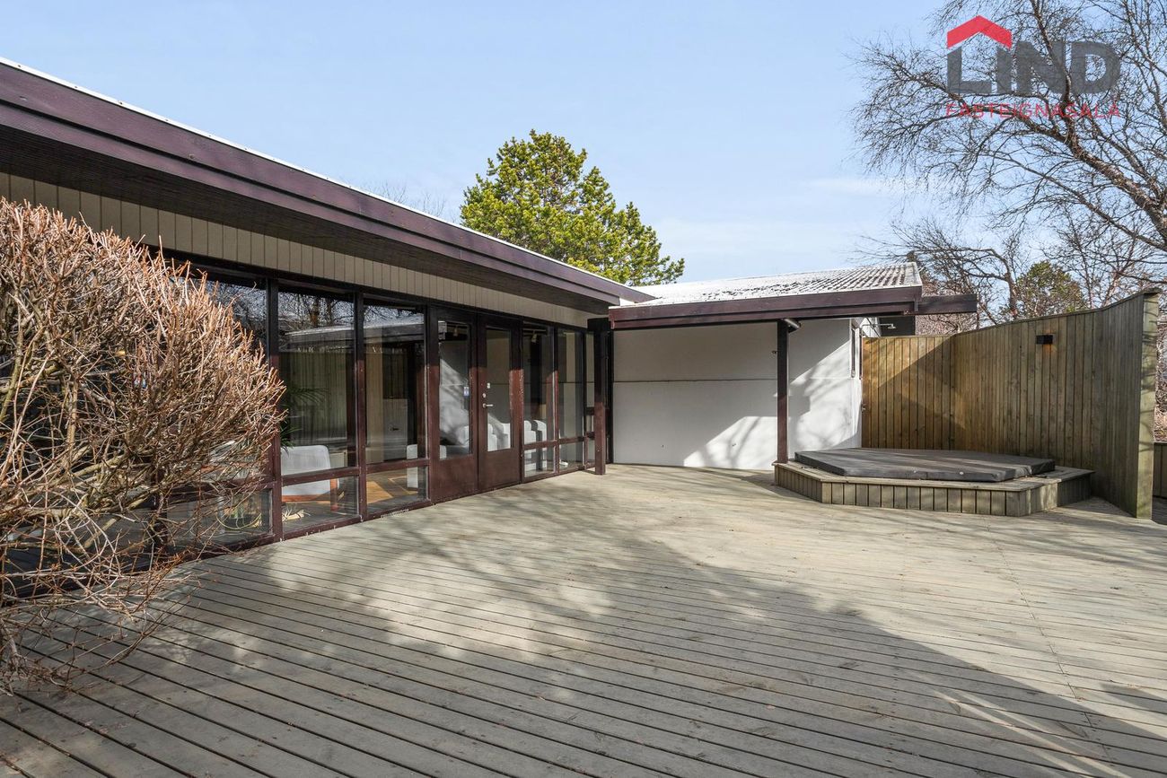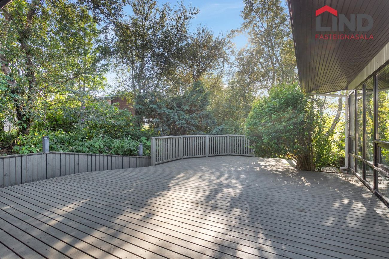 Skjólgóður og glæsilegur pall úti, útgengt úr sólstofu.
