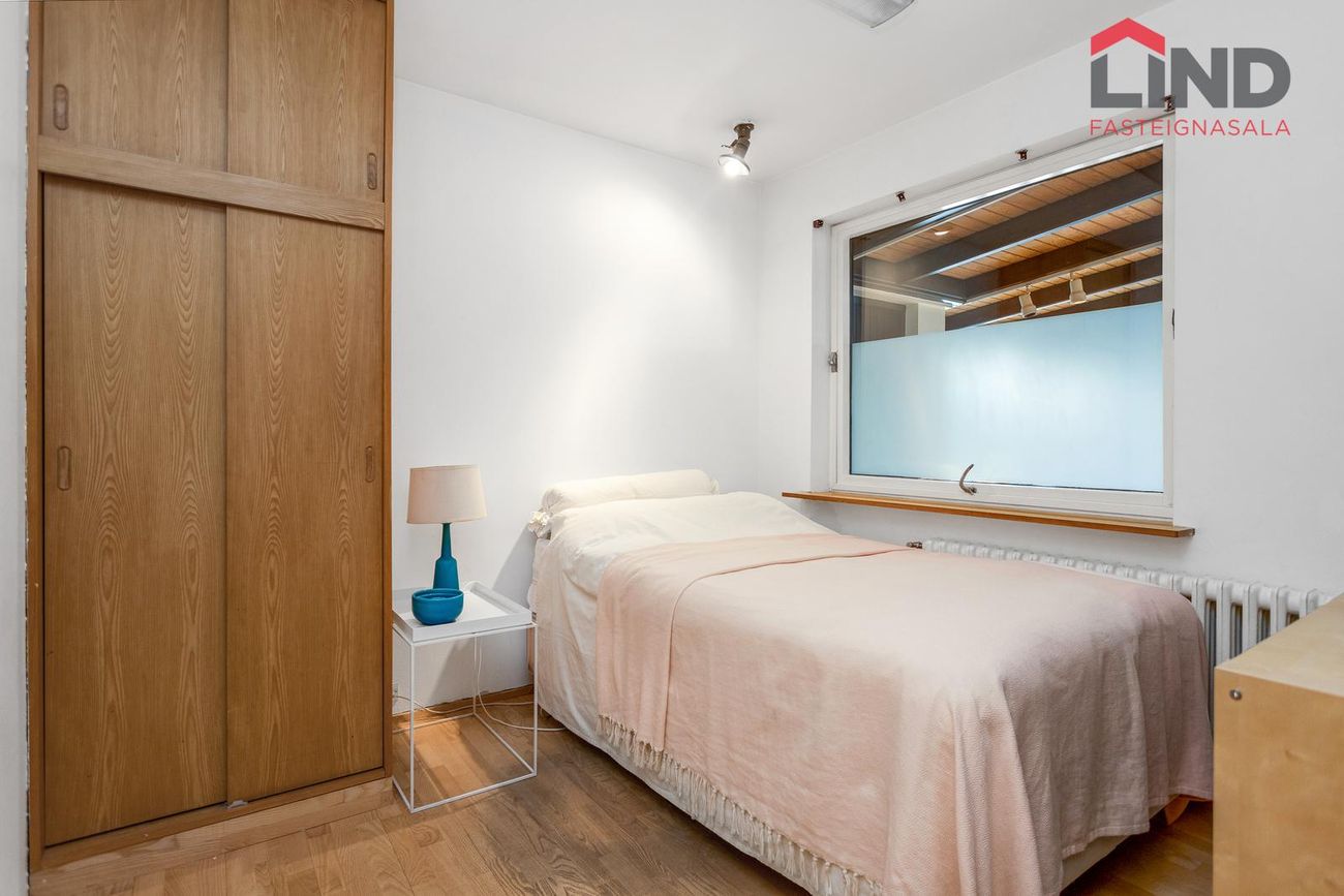 Geymsla fyrir aftan bílskúr, innangengt úr sólstofu. Fataskápar í sumum herbergjum.