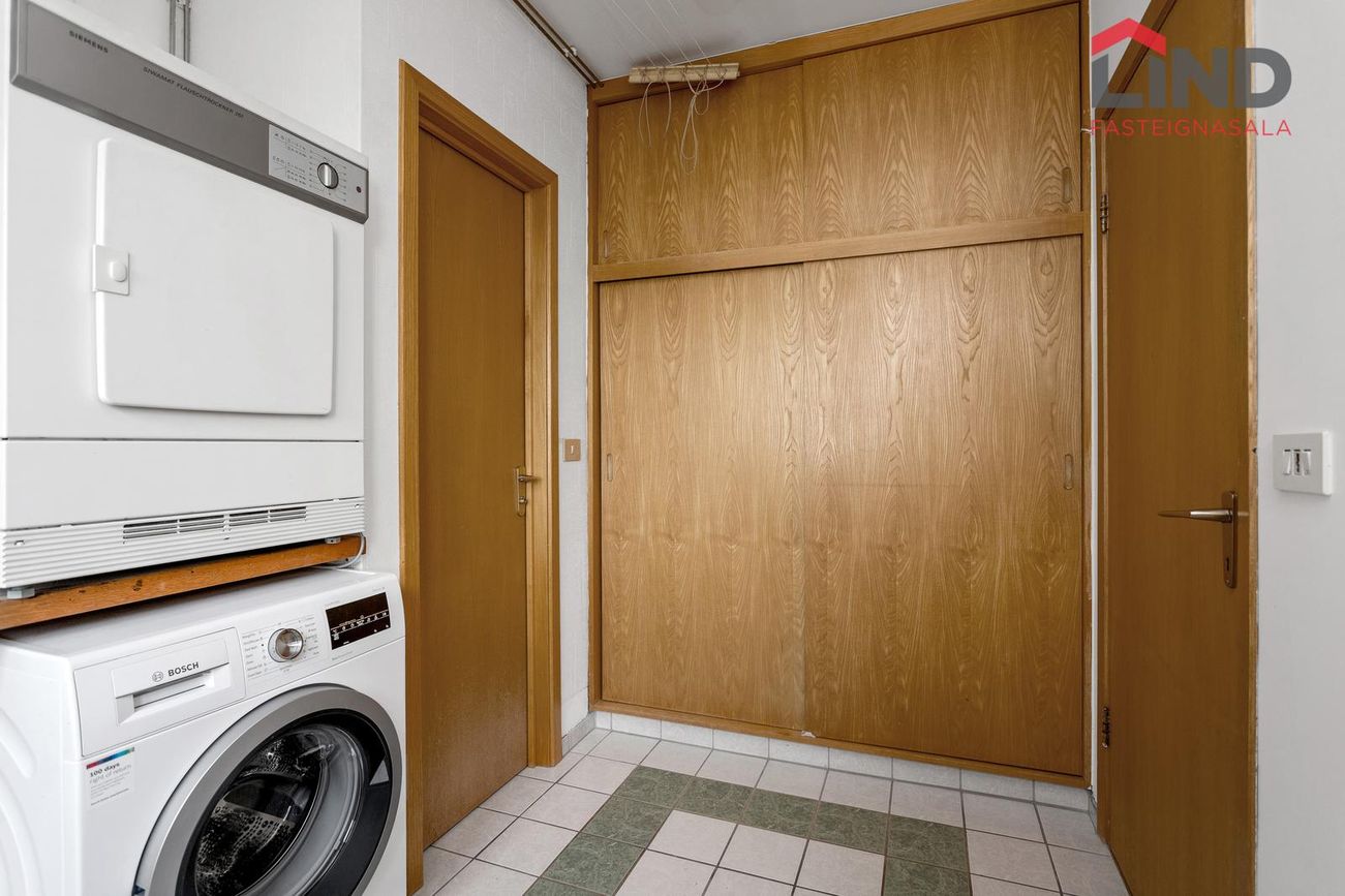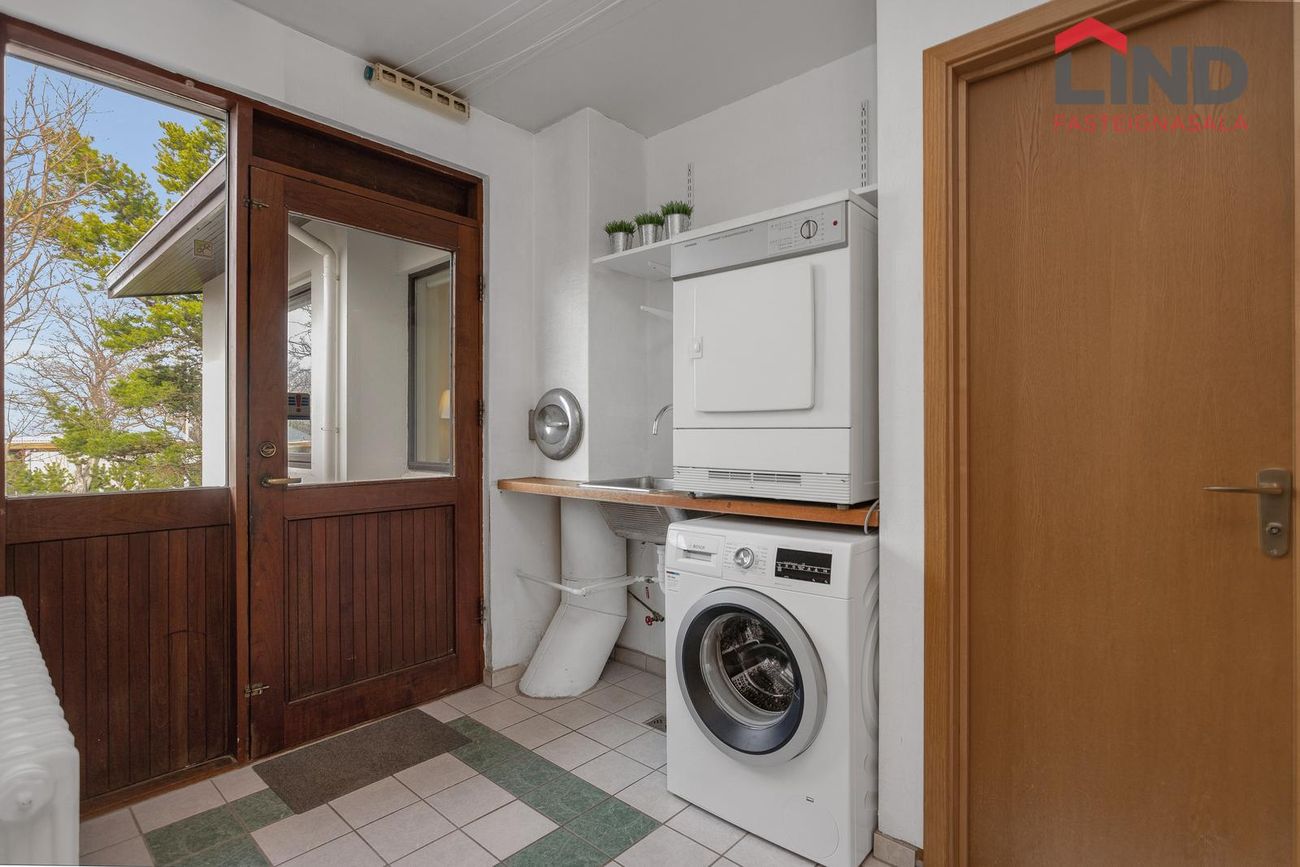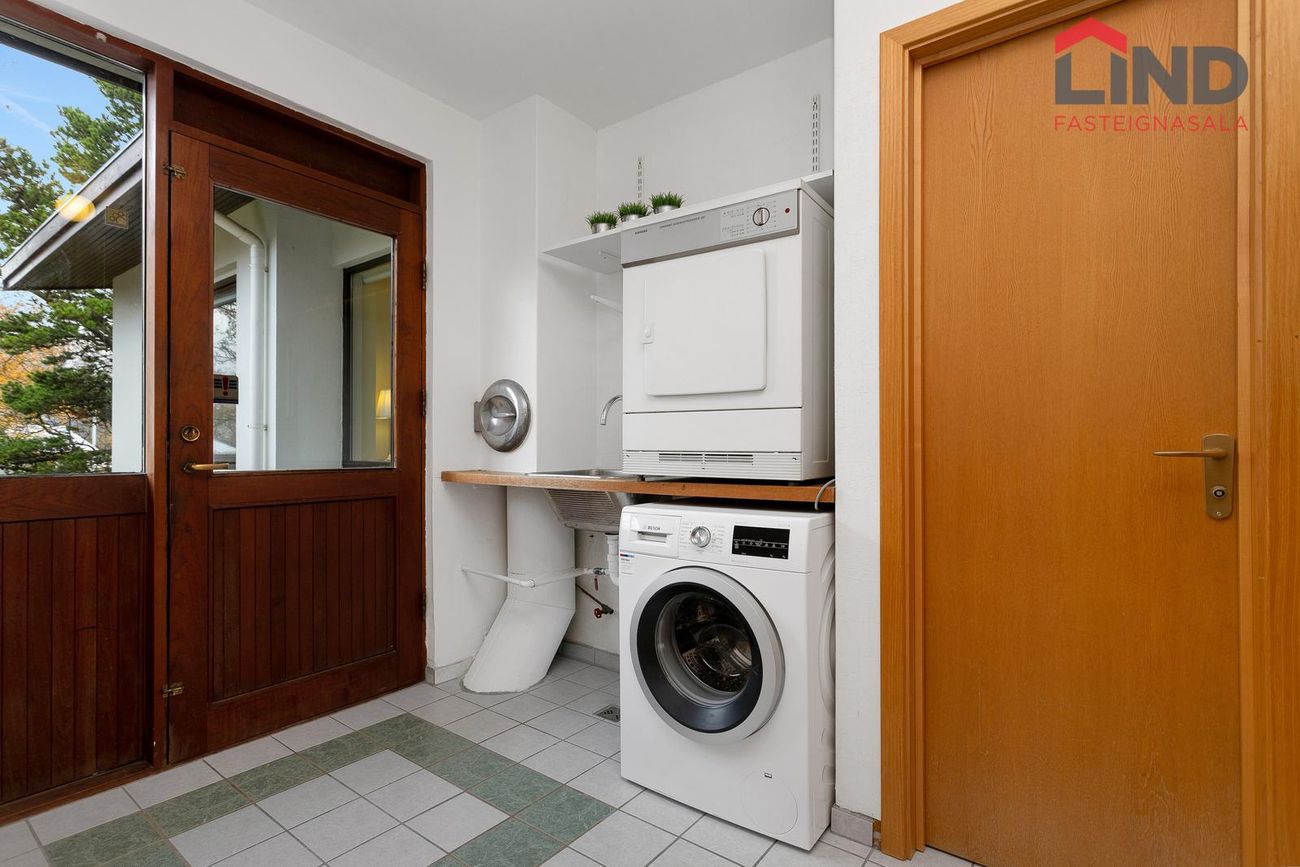 Sér þvottahús inn af eldhúsi með flisum á gólfi, borðplötu með skolvaski, sturtu og fataskáp. Útgengt út í garð.