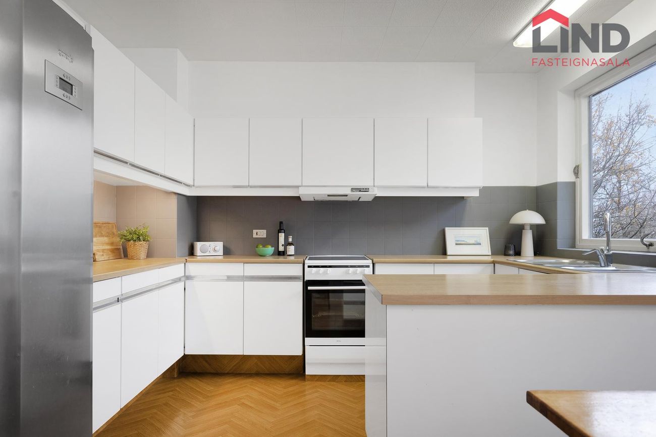 Rúmgott og bjart eldhús með dúk á gólfi. Hvít innrétting með góðu skápaplássi.