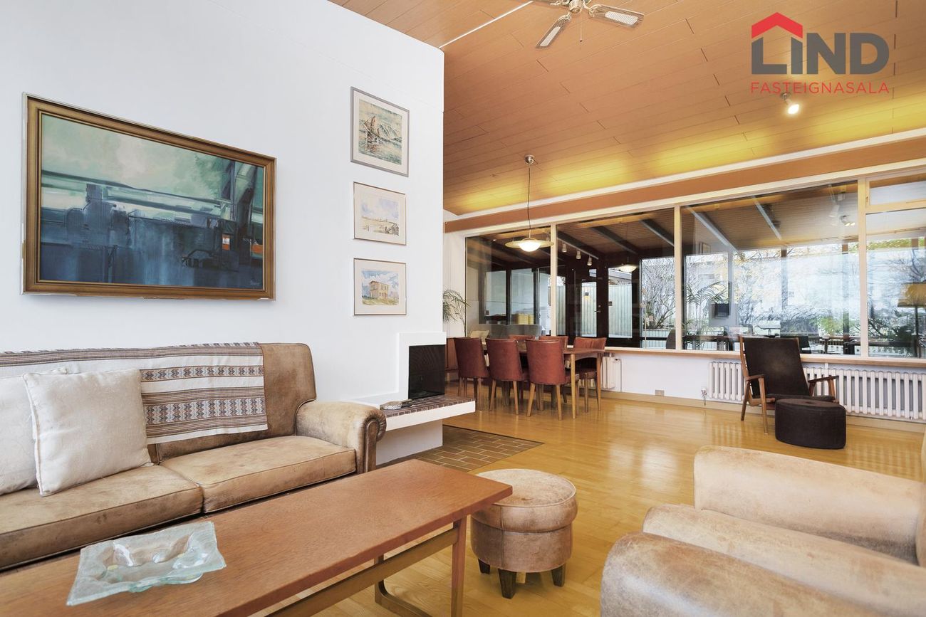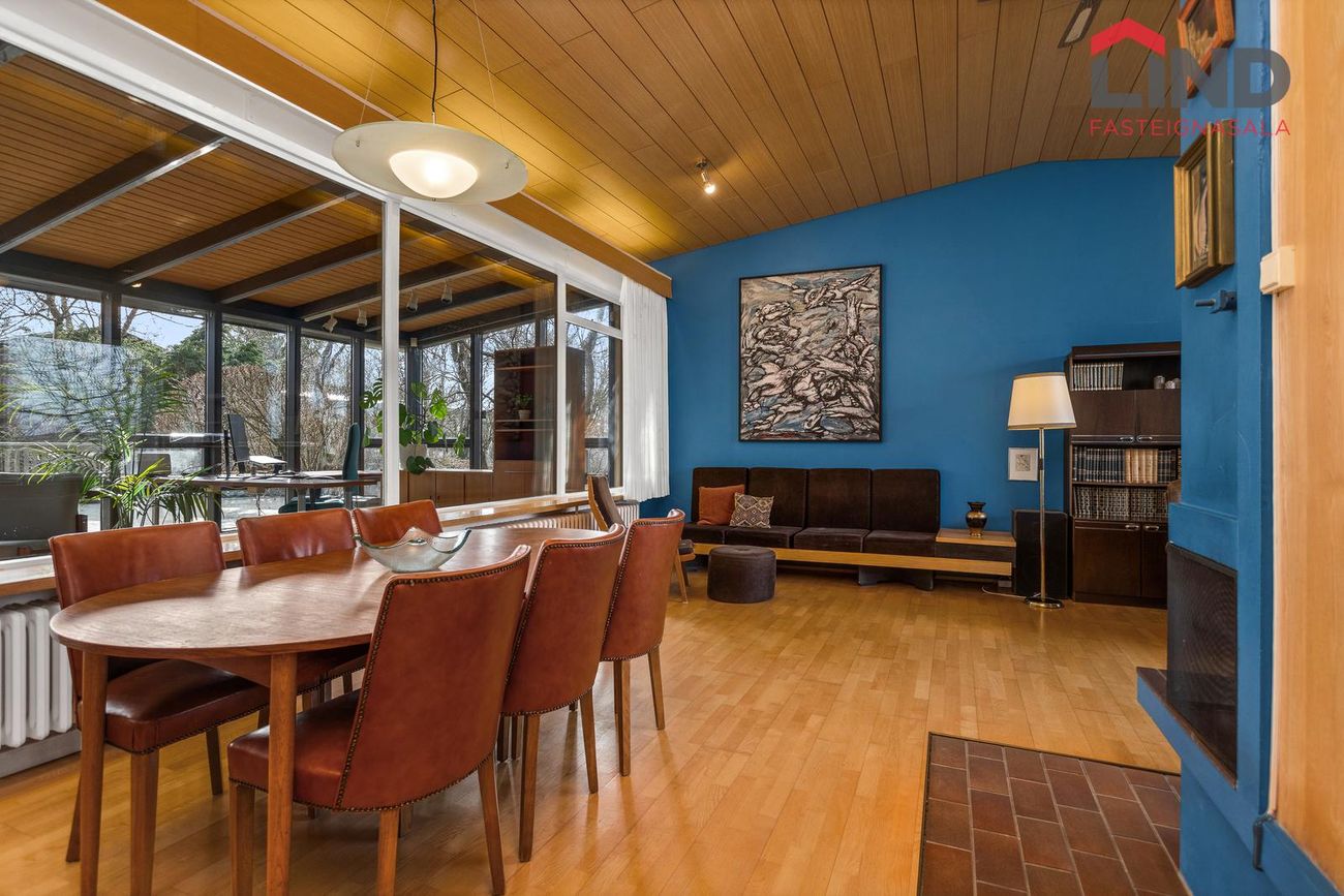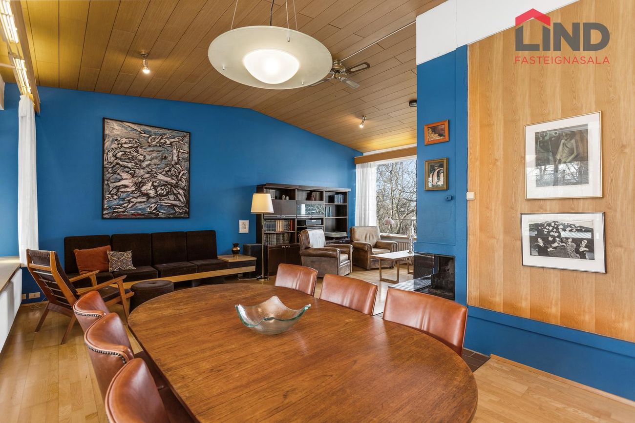 Stofa og borðstofa samliggjandi í opnu, björtu rými með mikilli lofthæð. Parket á gólfi, arinn. Stórir gluggar beggja vegna.