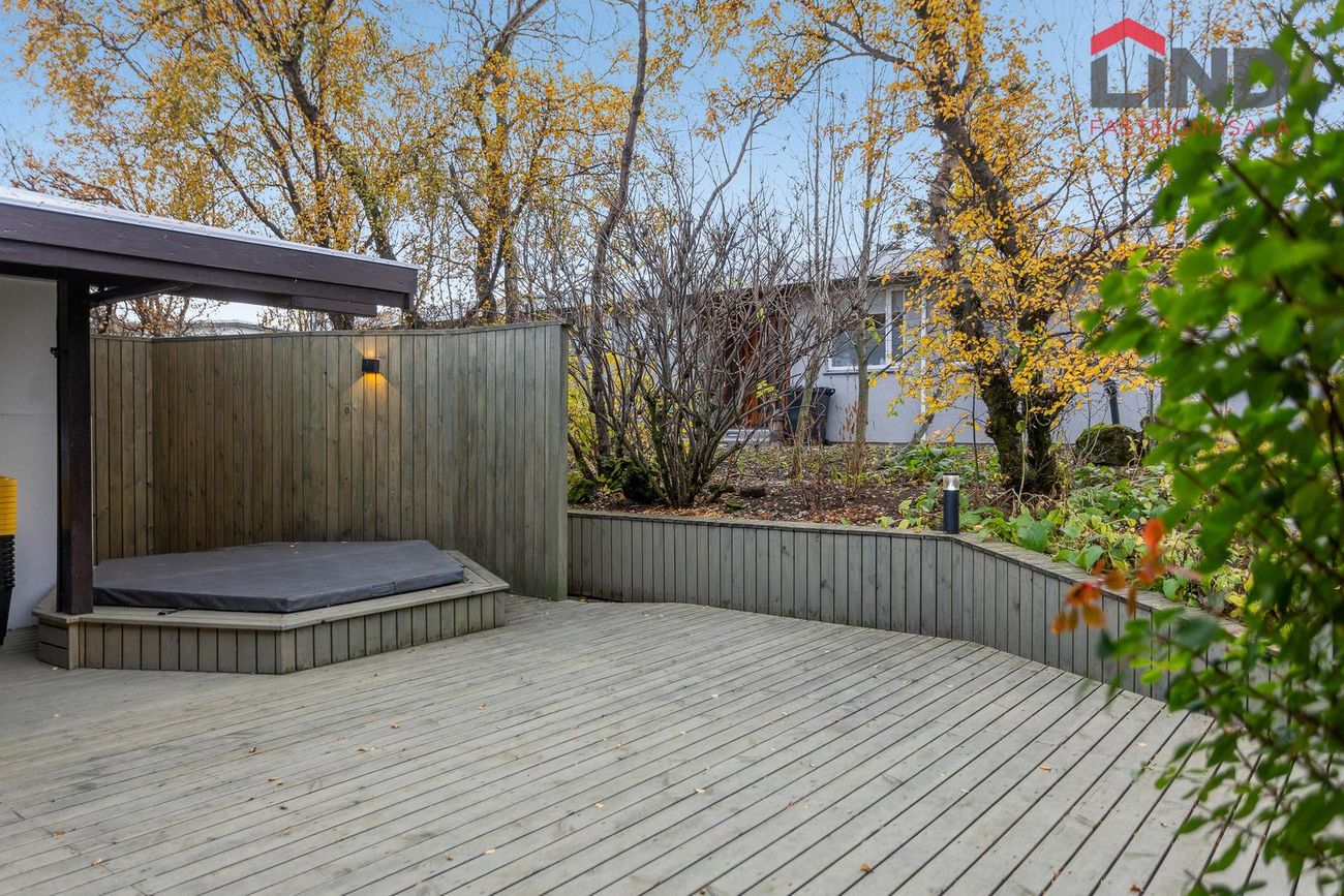 Skjólgóður og glæsilegur pall með heitum potti og útisturtu. Garður.