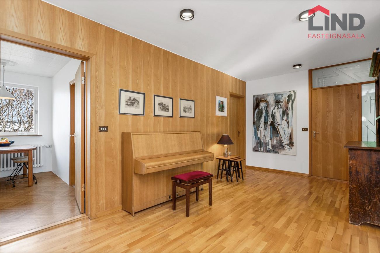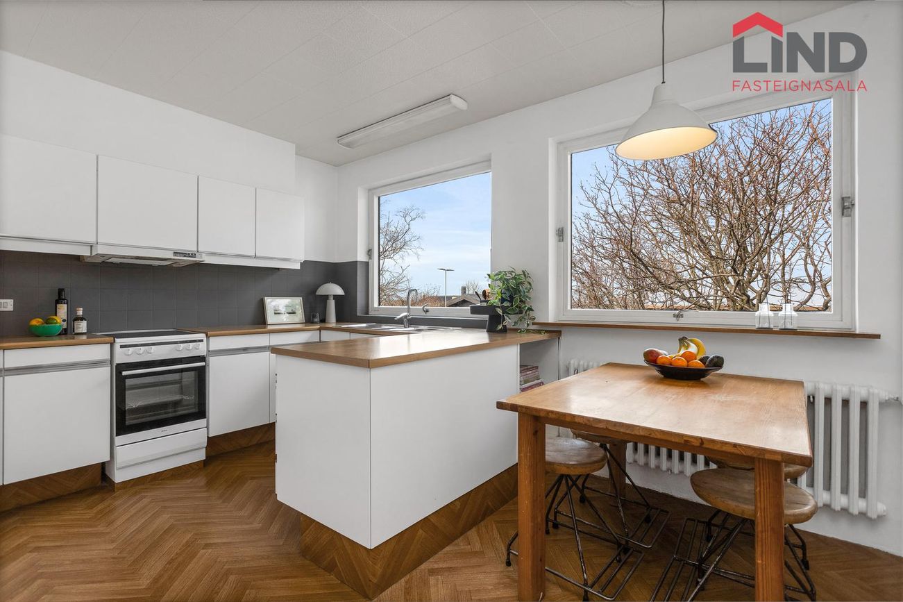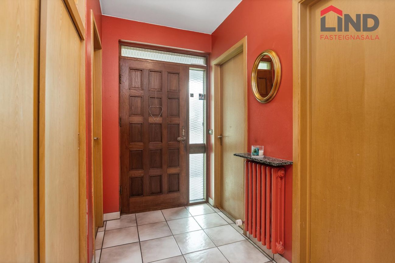 Parket á gólfi í stofu, borðstofu, sólstofu og svefnherbergjum. Flísar í baðherbergi, þvottahúsi, forstofu. Dúkur í eldhúsi og gestasnyrtingu.