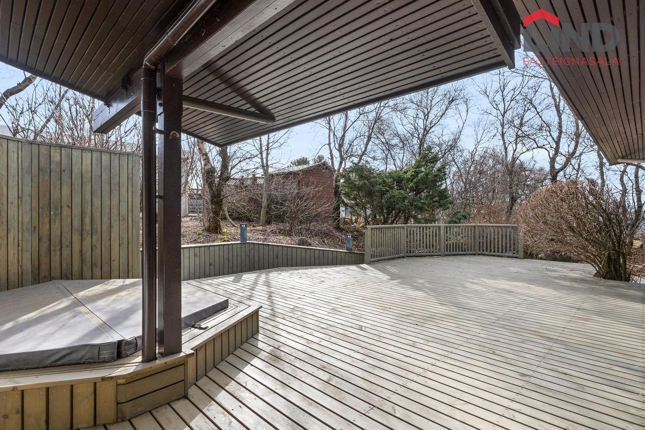 Fimm svefnherbergi, stórar samliggjandi stofur með mikilli lofthæð, stórt bjart eldhús, sér þvottahús, baðherbergi, gestasnyrting, stór sólstofa, skjólgóður pall með heitum potti og útisturtu, bílskúr með hiti.