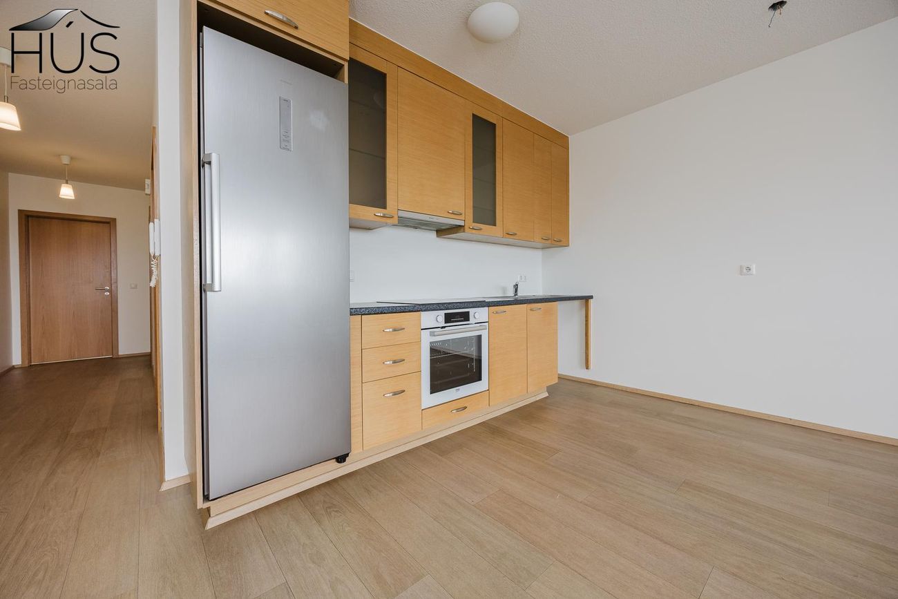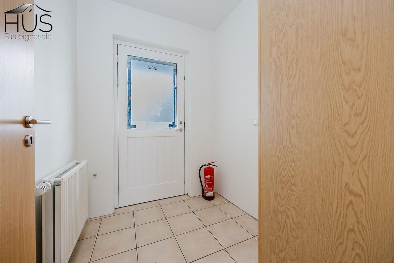 Eignin telur forstofu með flísum á gólfi og fataskáp, gangur með harðparketi á gólfi, rúmgott svefnherbergi með stórum fataskáp. Baðherbergi með flísum á gólfi, innréttingu og baðkari með sturtuaðstöðu og inn af því er lítið þvottahús með flísum á gólfi. Saman í opnu og björtu rými stofa og eldhús með harðparketi á gólfi og góðri spónlagðri innréttingu. Góðar 7,3 fm svalir eru á íbúðinni sem snúa mót suðvestri. Á jarðhæð er 7,3 fm geymsla. Húsið er steypueiningahús einangrað að utan með viðhaldslítilli álklæðningu.
