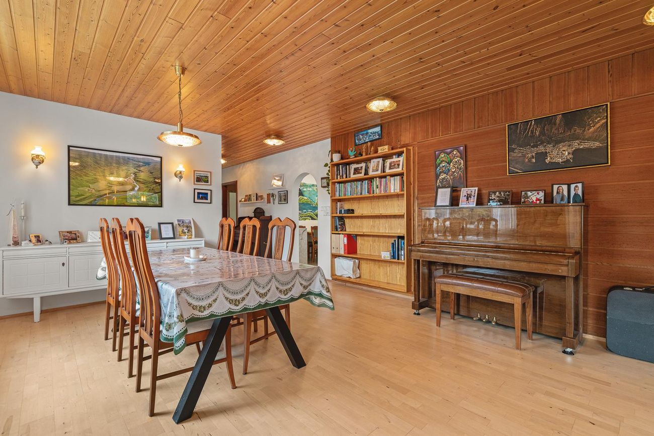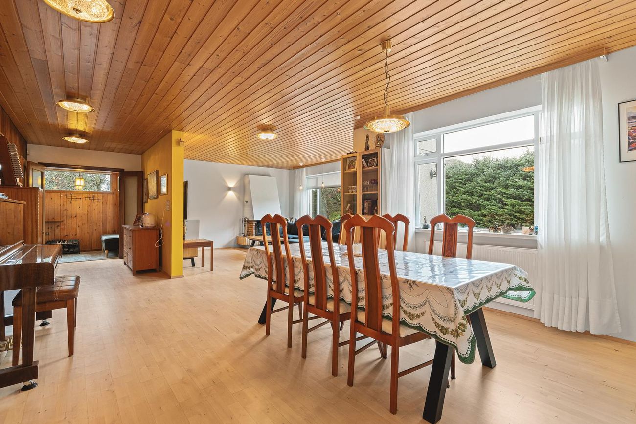 Stofa með arni og útgöngu að verönd og garði. Borðstofa samliggjandi.