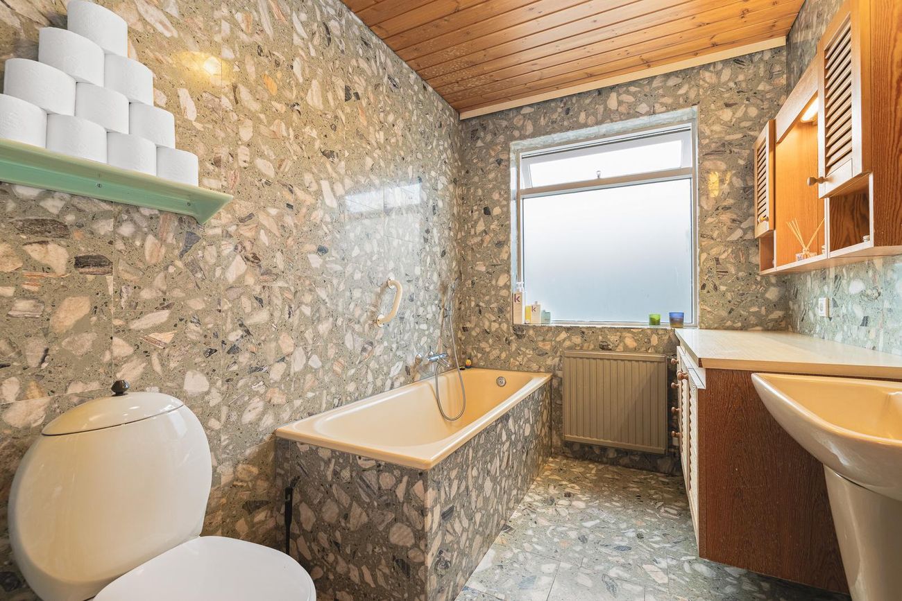 Baðherbergi með Terrazzo flísum og 80s útlit.