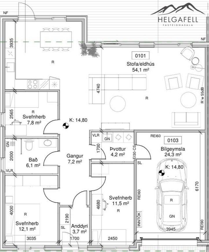 Gluggar og hurðir: Gluggar og hurðir eru úr timbri með álkápu gráir að lit og hvítum lit að innan, gler í gluggum er tvöfalt einangrunargler. Bílskúrshurð frá Límtré Vírnet.