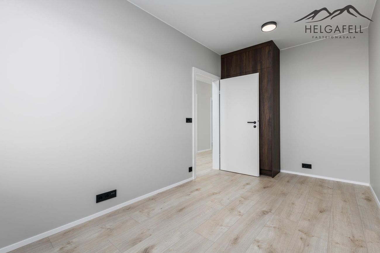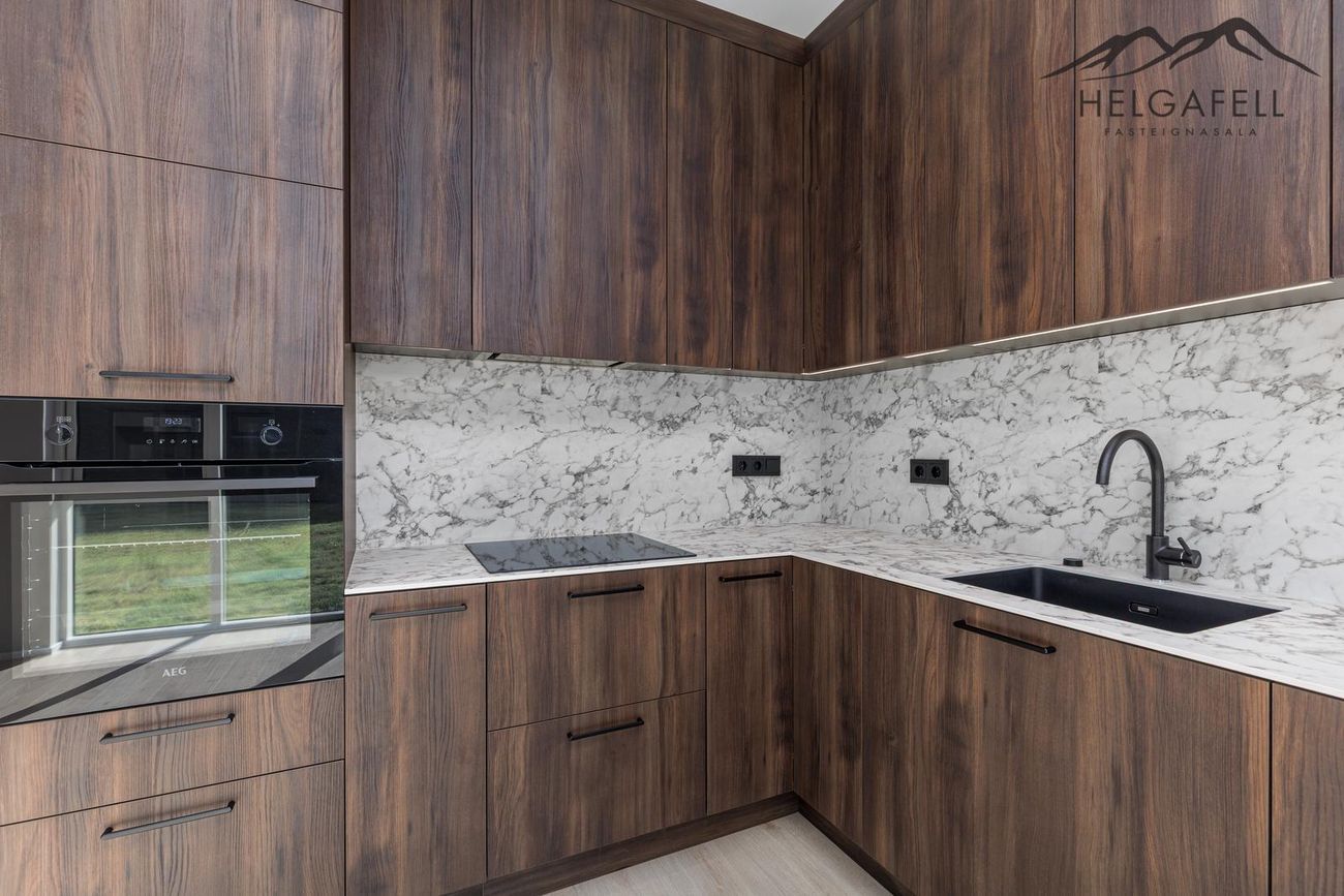 innréttingar: Fallegar brúnar innréttingar eru frá Voke-III, svört handföng og hæglokur. Allar innréttingar eru smíðaðar í fullri lofthæð.