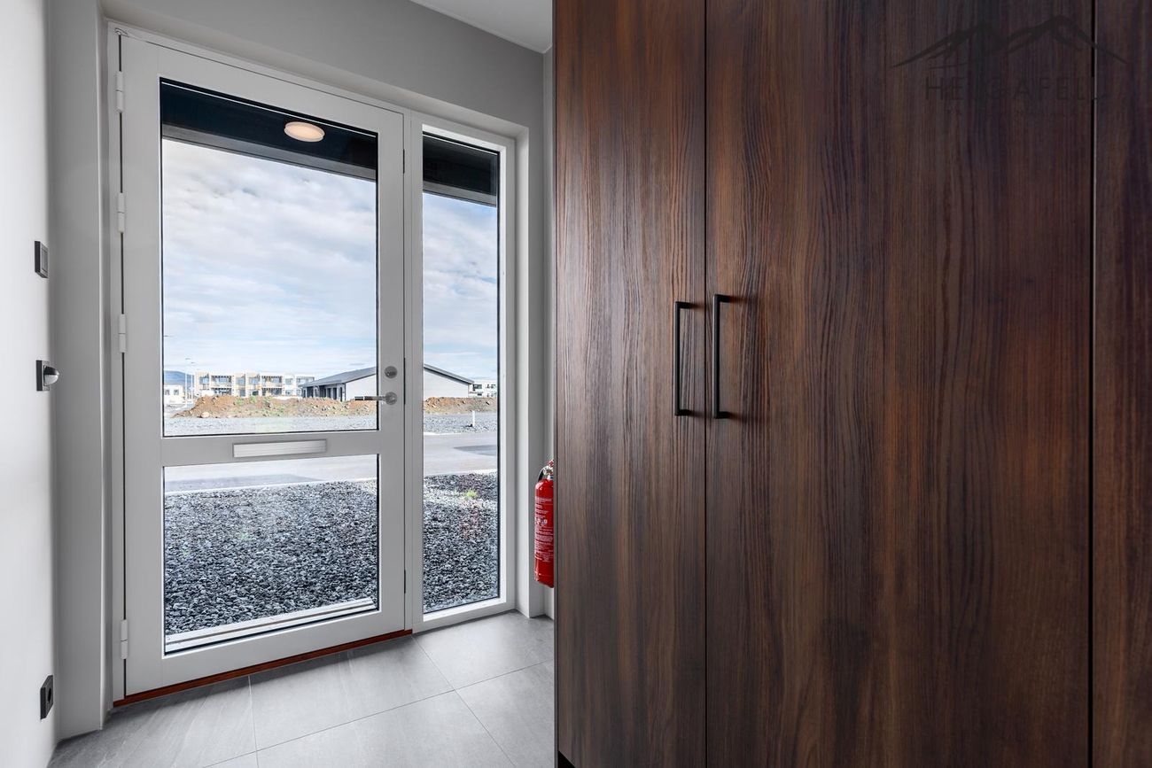 Innihurðir: Hvítar yfirfelldar innihurðir með svörtum hurðarhúnum eru frá Parka. Felliþröskuldar eru á hurðum í anddyri og svefnherbergjum.