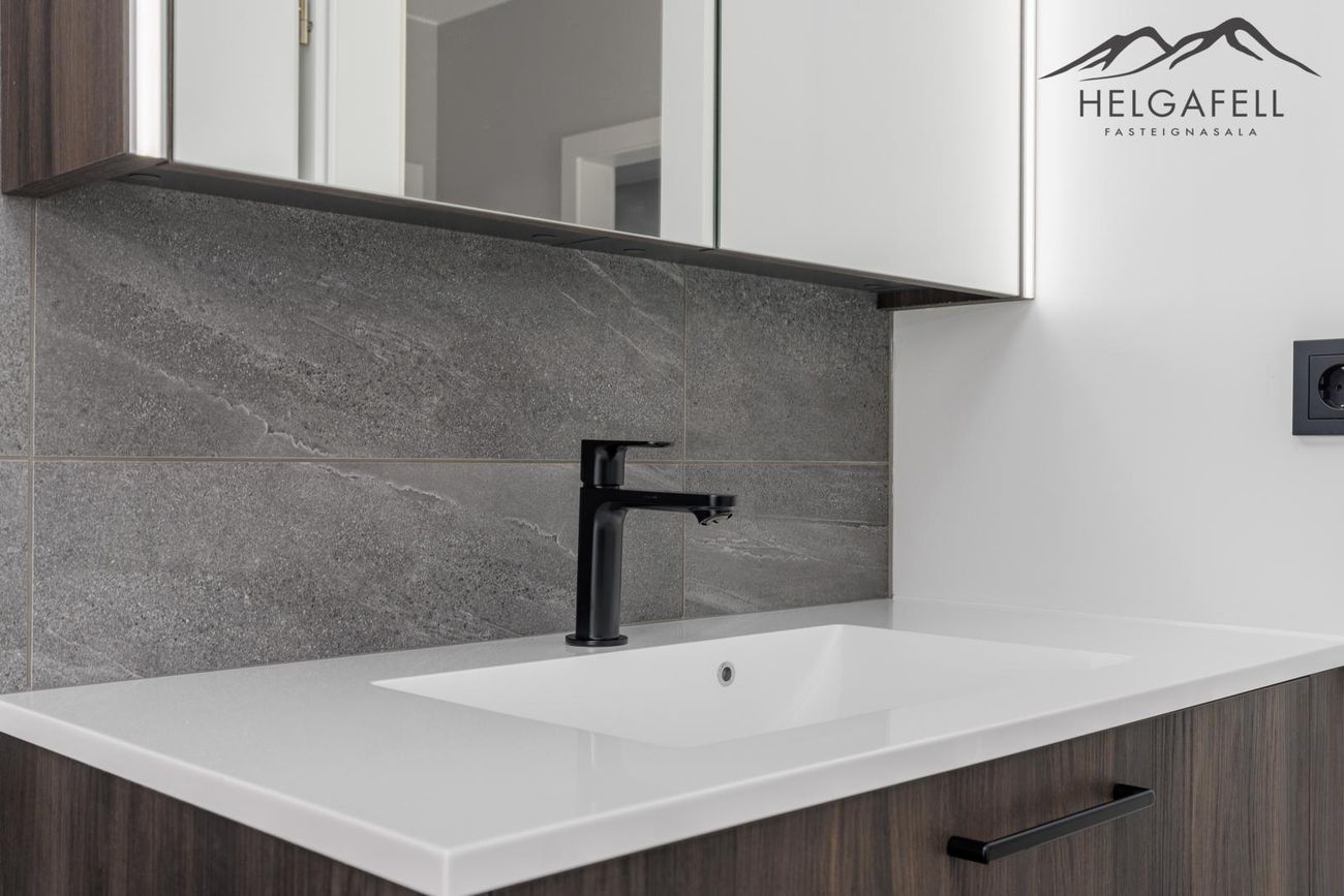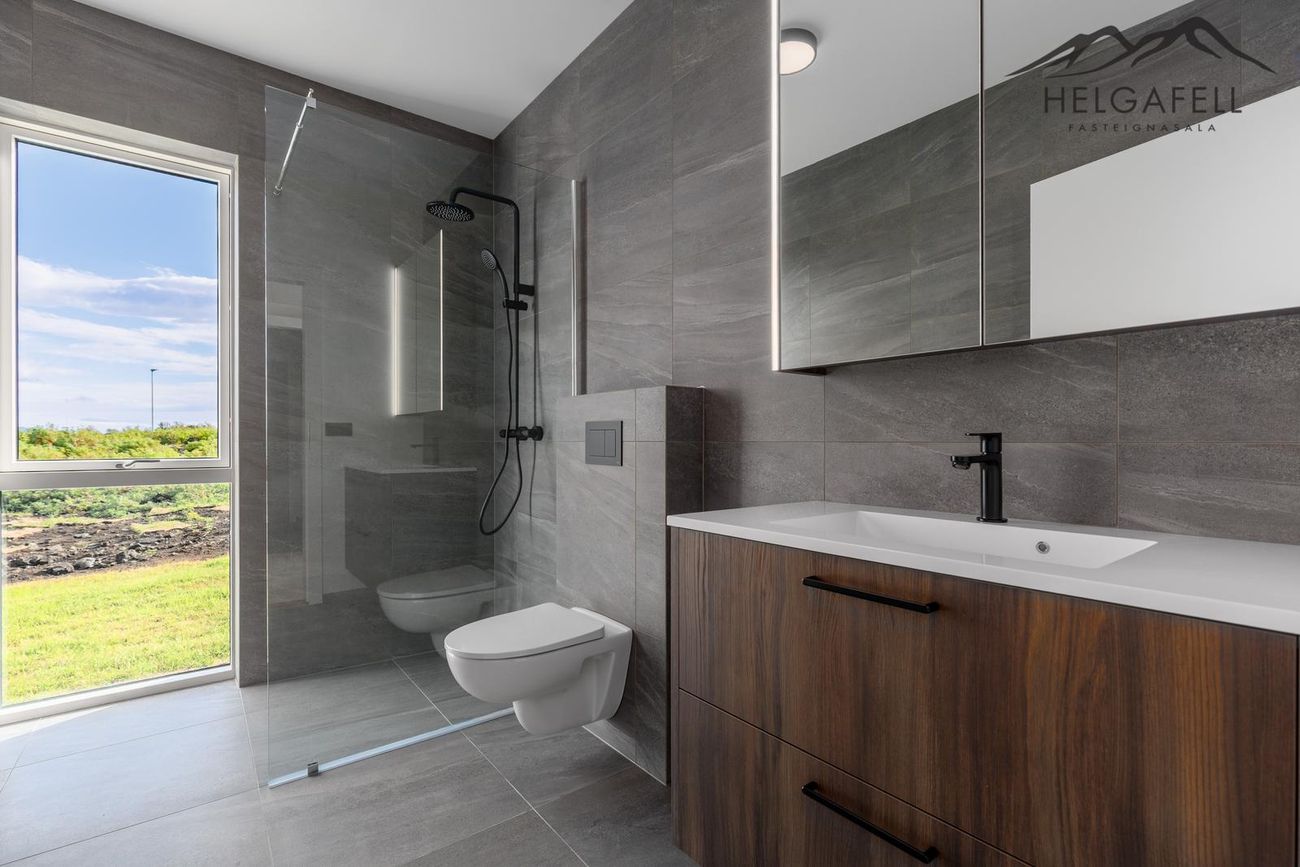 Baðherbergi: Með brúnni innréttingu með hvítri handlaug, speglaskápur með ljósi, walk in sturta, upphengt salerni, gólfsíður gluggi, flísalagt í hólf og gólf.