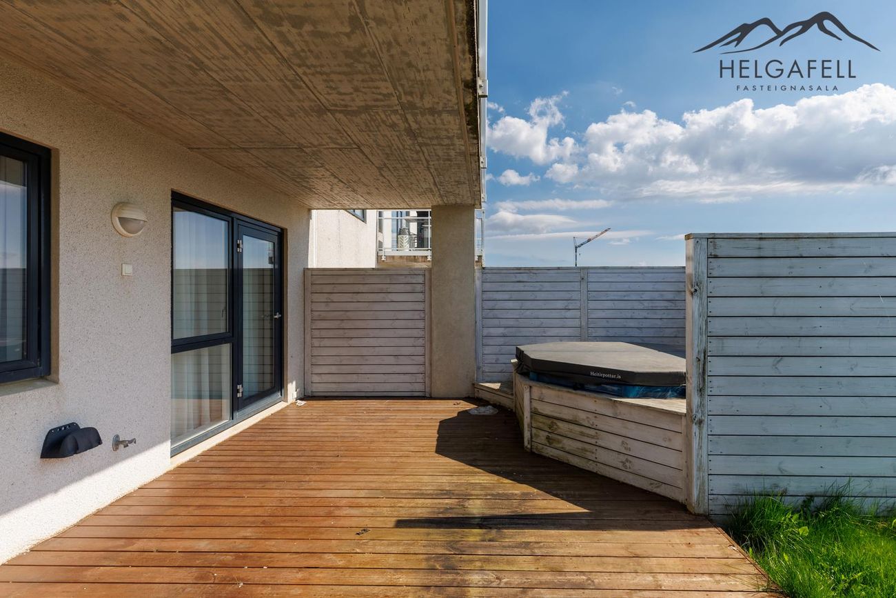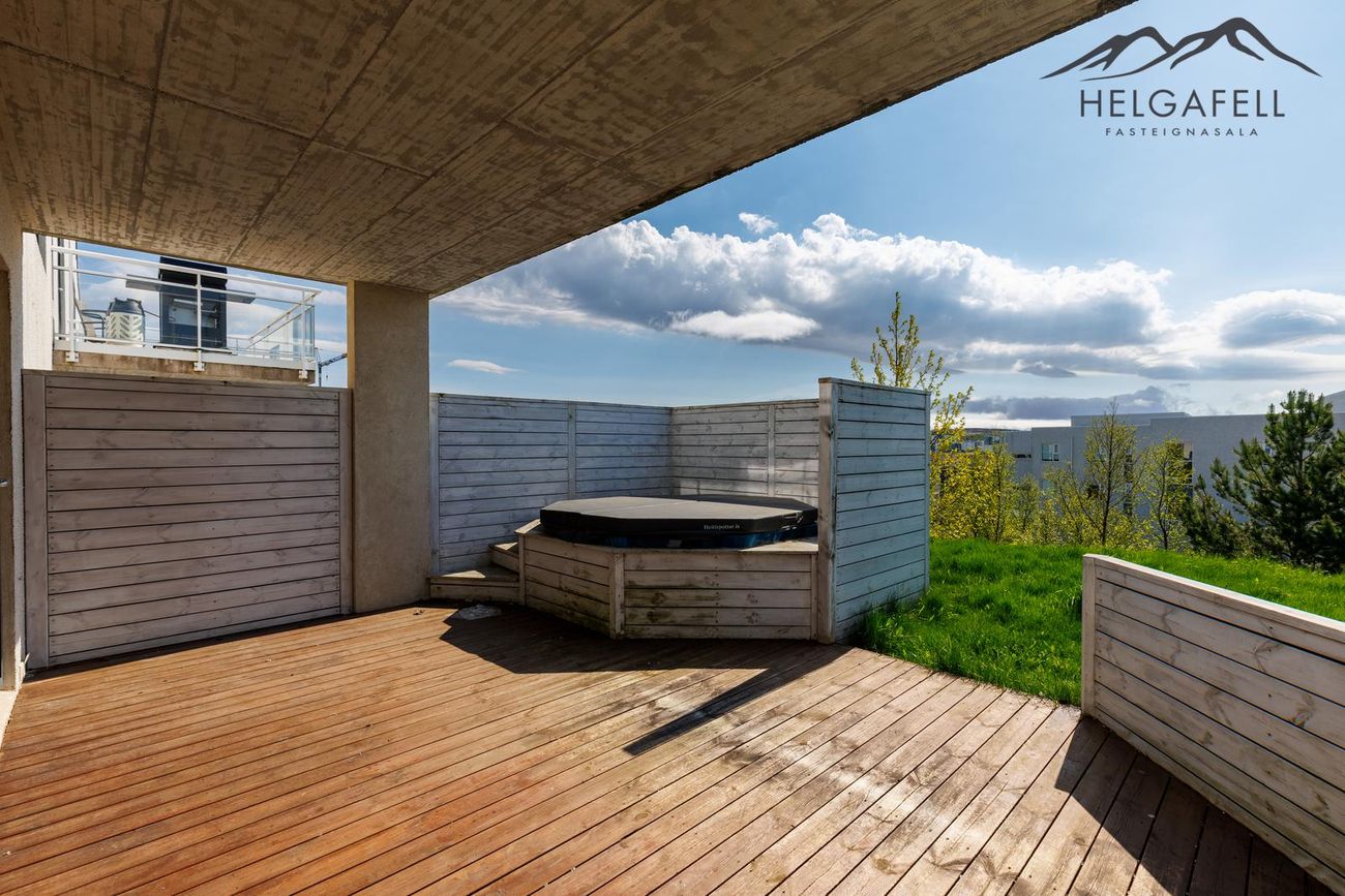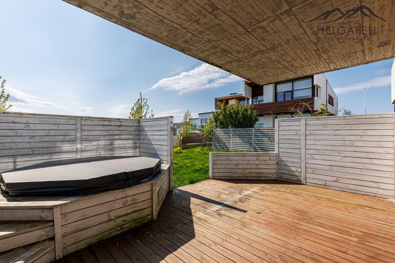 Lóðin er fullfrágengin með timburverönd, heitum potti, skólveggjum og snyrtilegum grónum garði.