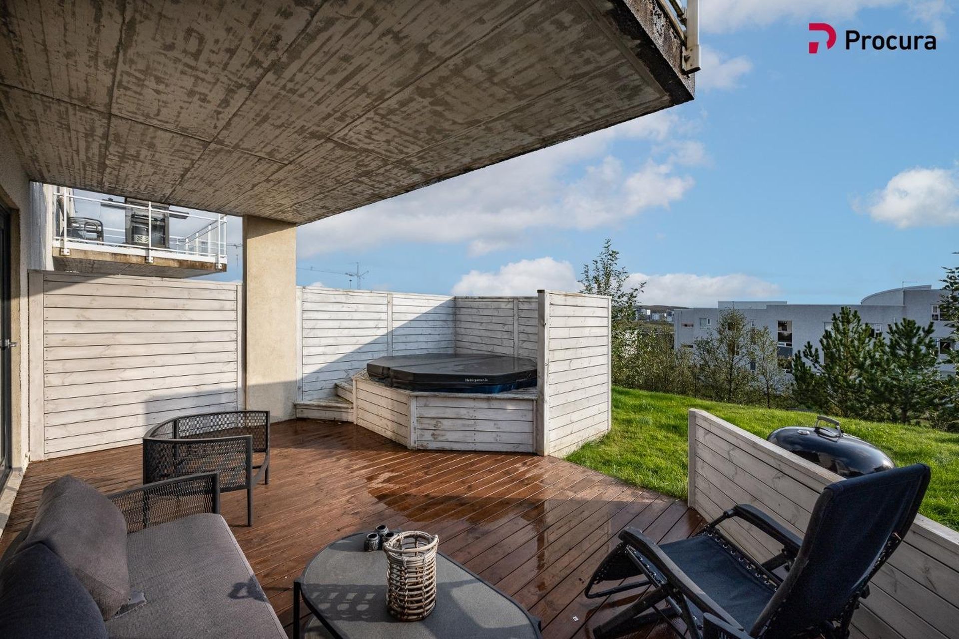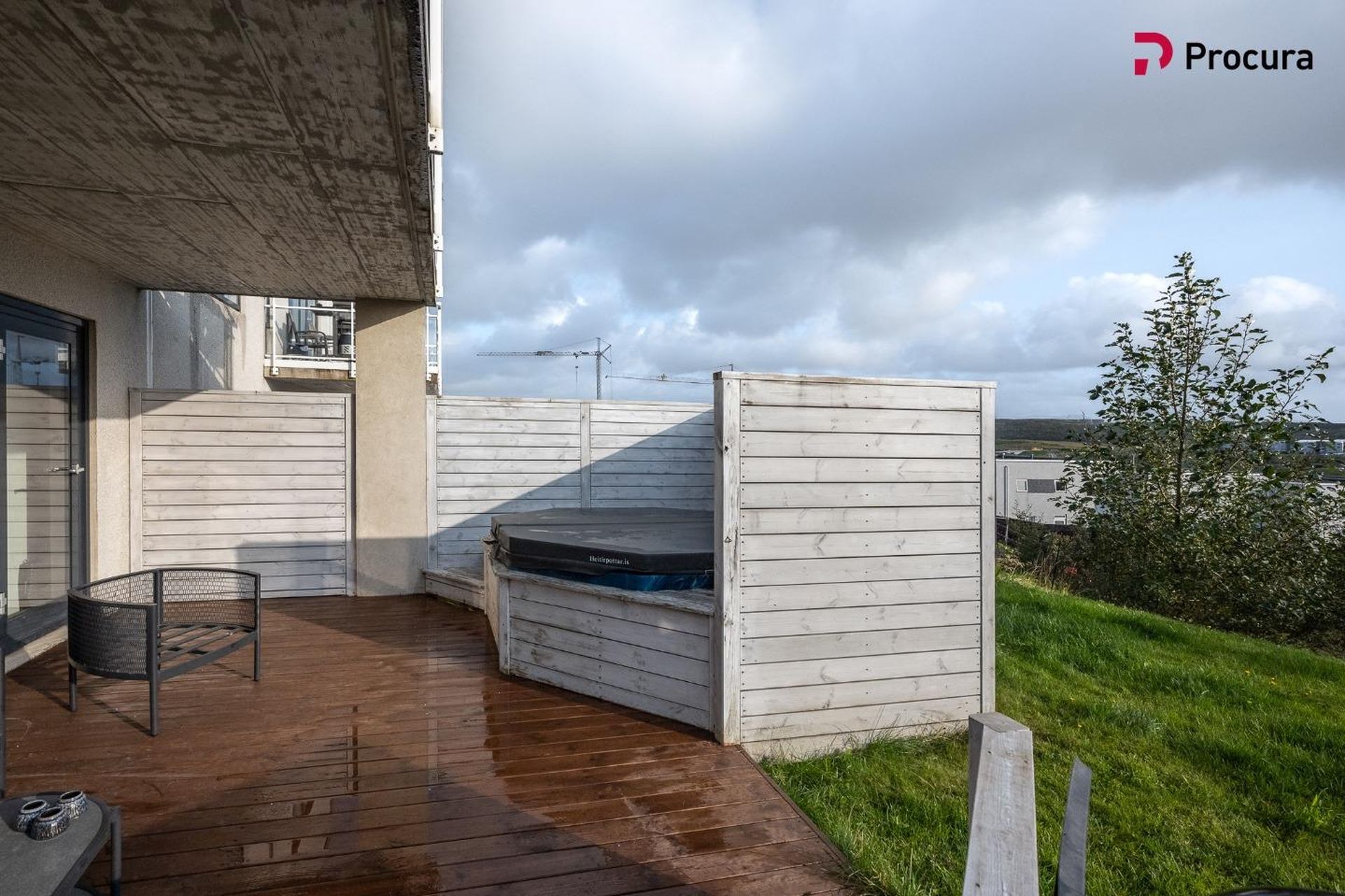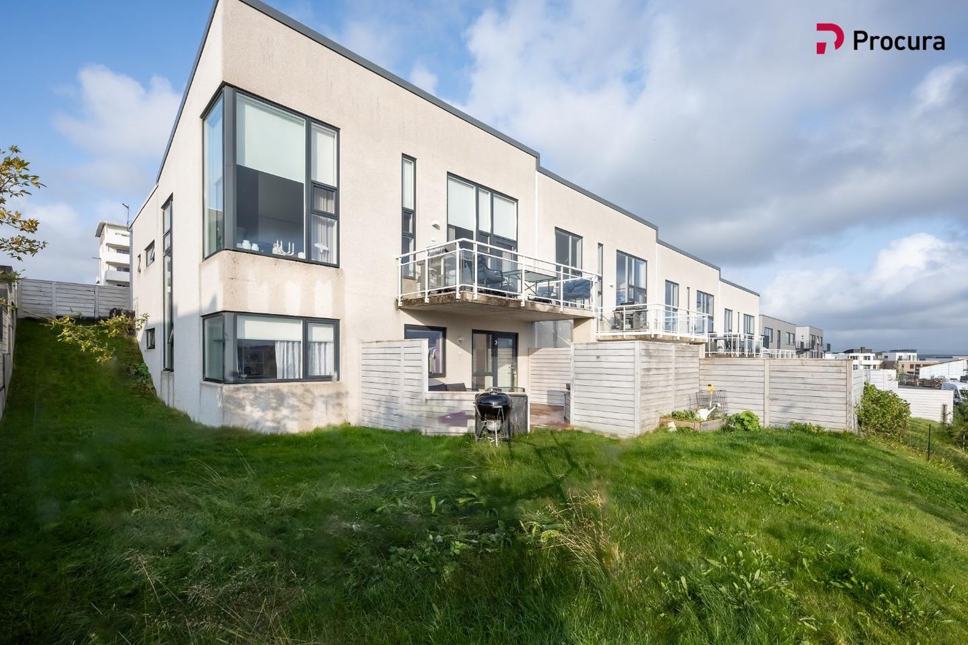 Lóðin er fullfrágengin með timburverönd, heitum potti, skólveggjum og snyrtilegum grónum garði.