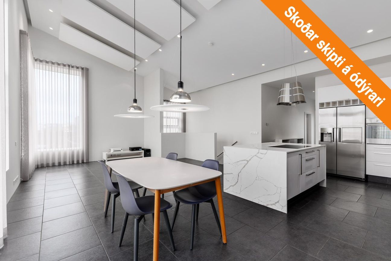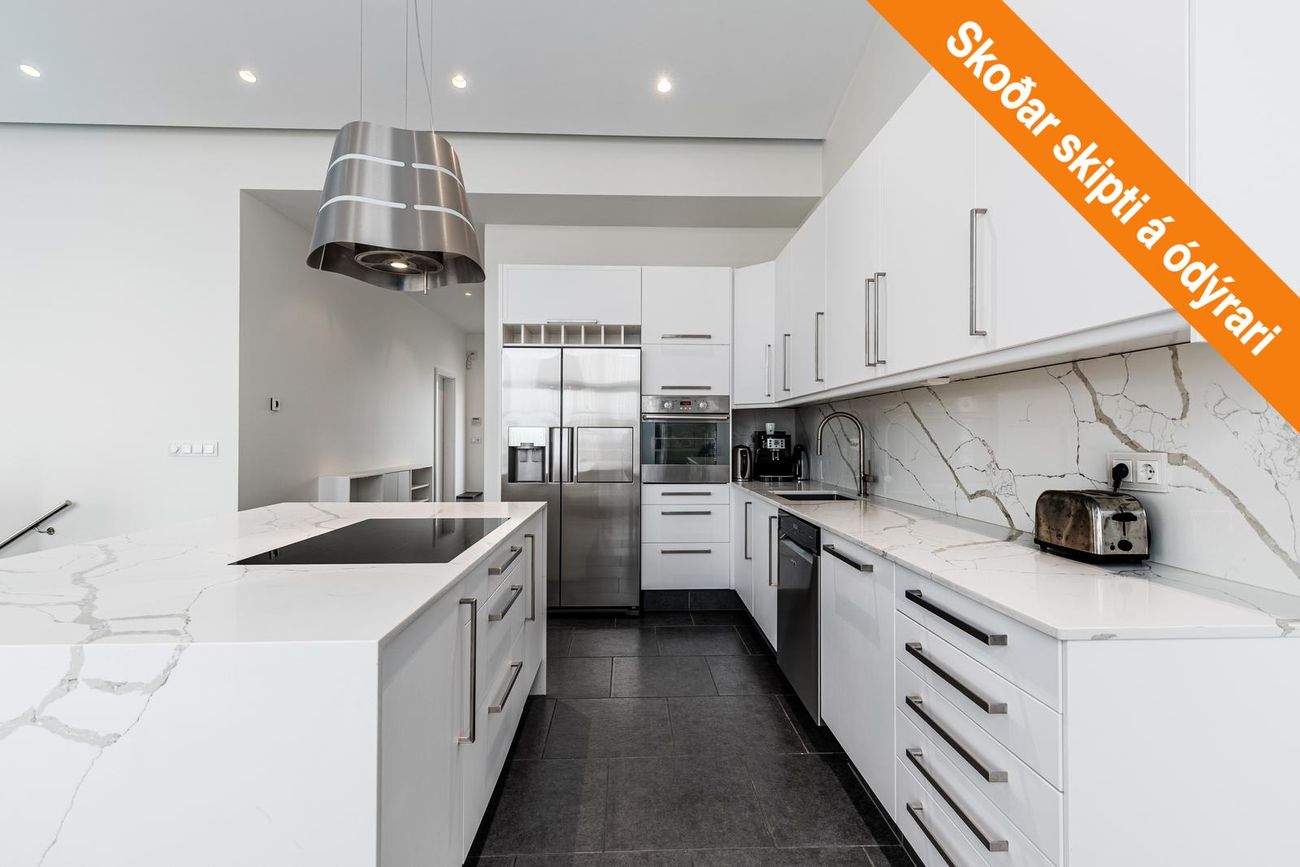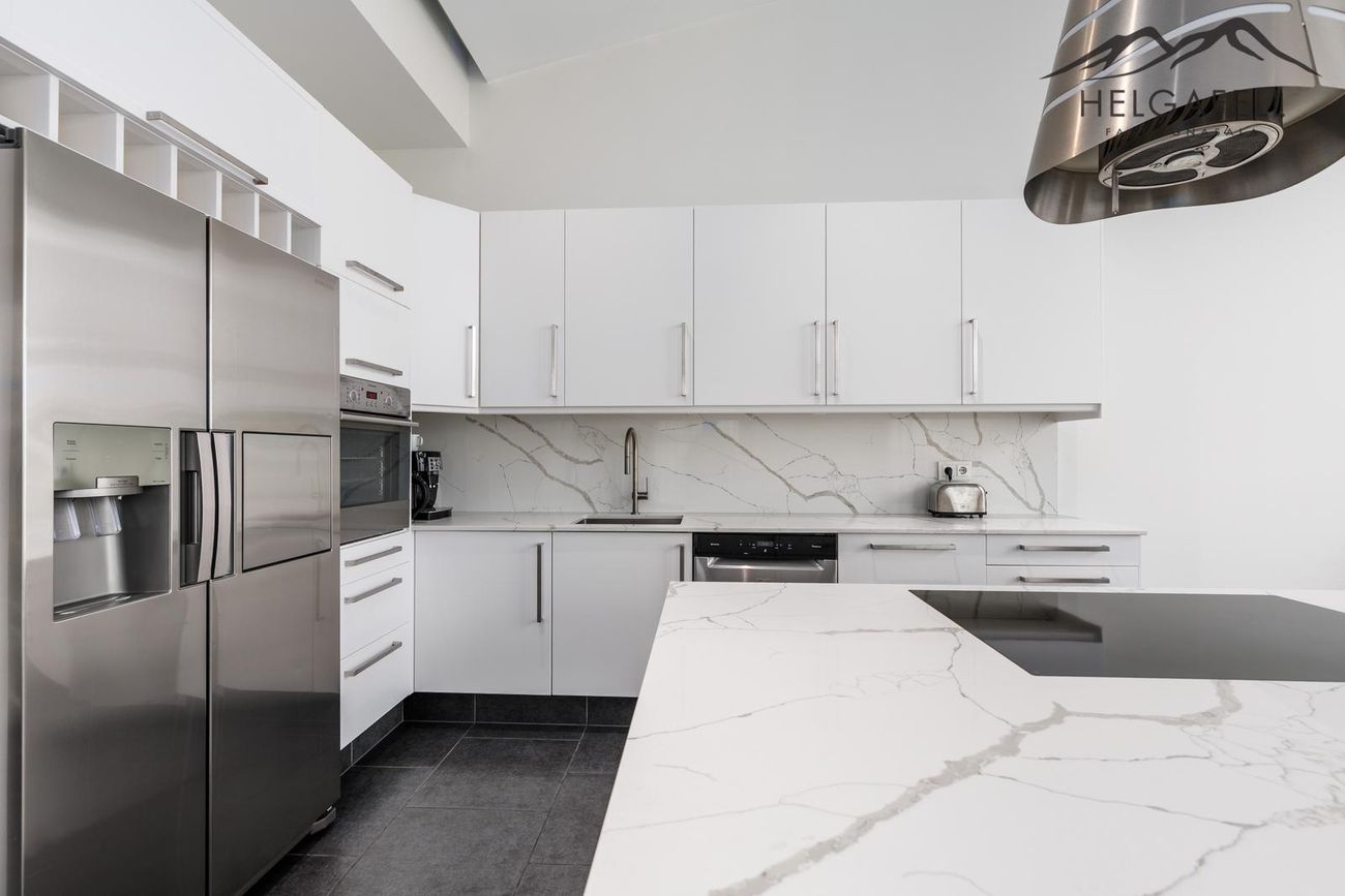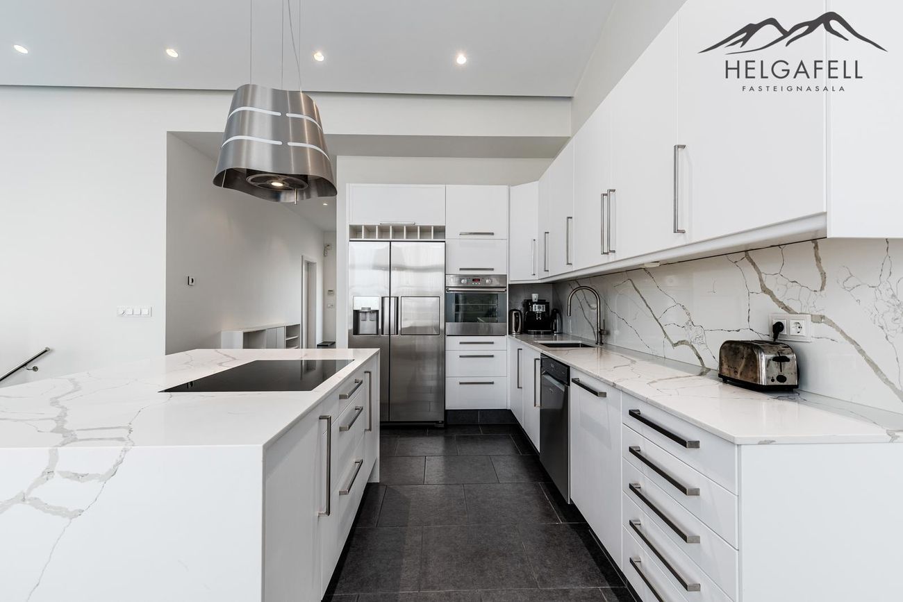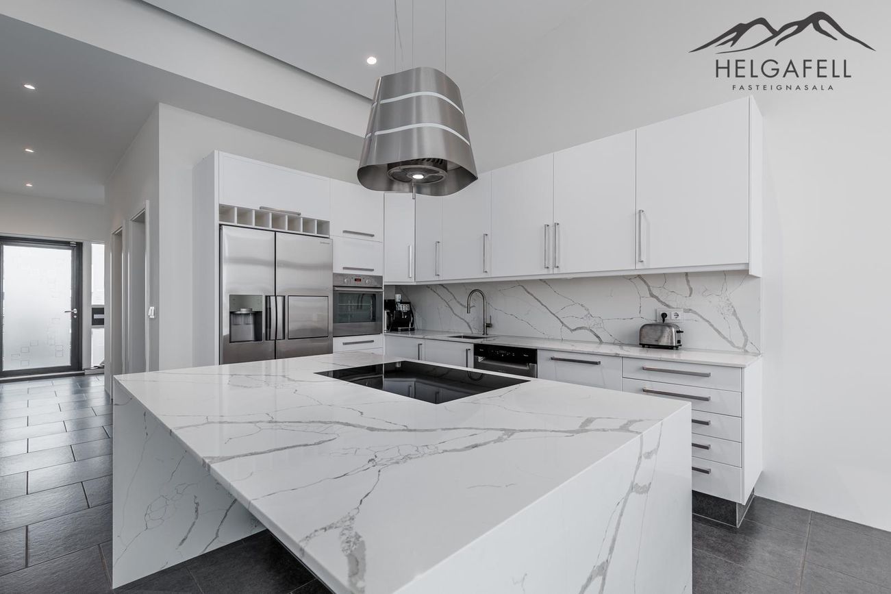 Eldhús: Eldhúsið, stofa og borðstofa mynda saman opið rými með mikla lofthæð og gólfsíðum gluggum sem bjóða upp á stórkostlegt útsýni. Snyrtileg hvít innrétting, með stórri marmaraeyju, er í L-laga sniði og býður upp á keramikhelluborð og fallegan stálháf. Ofn í vinnuhæð og dökkar flísar á gólfi gefa rýminu stílhreinan blæ.