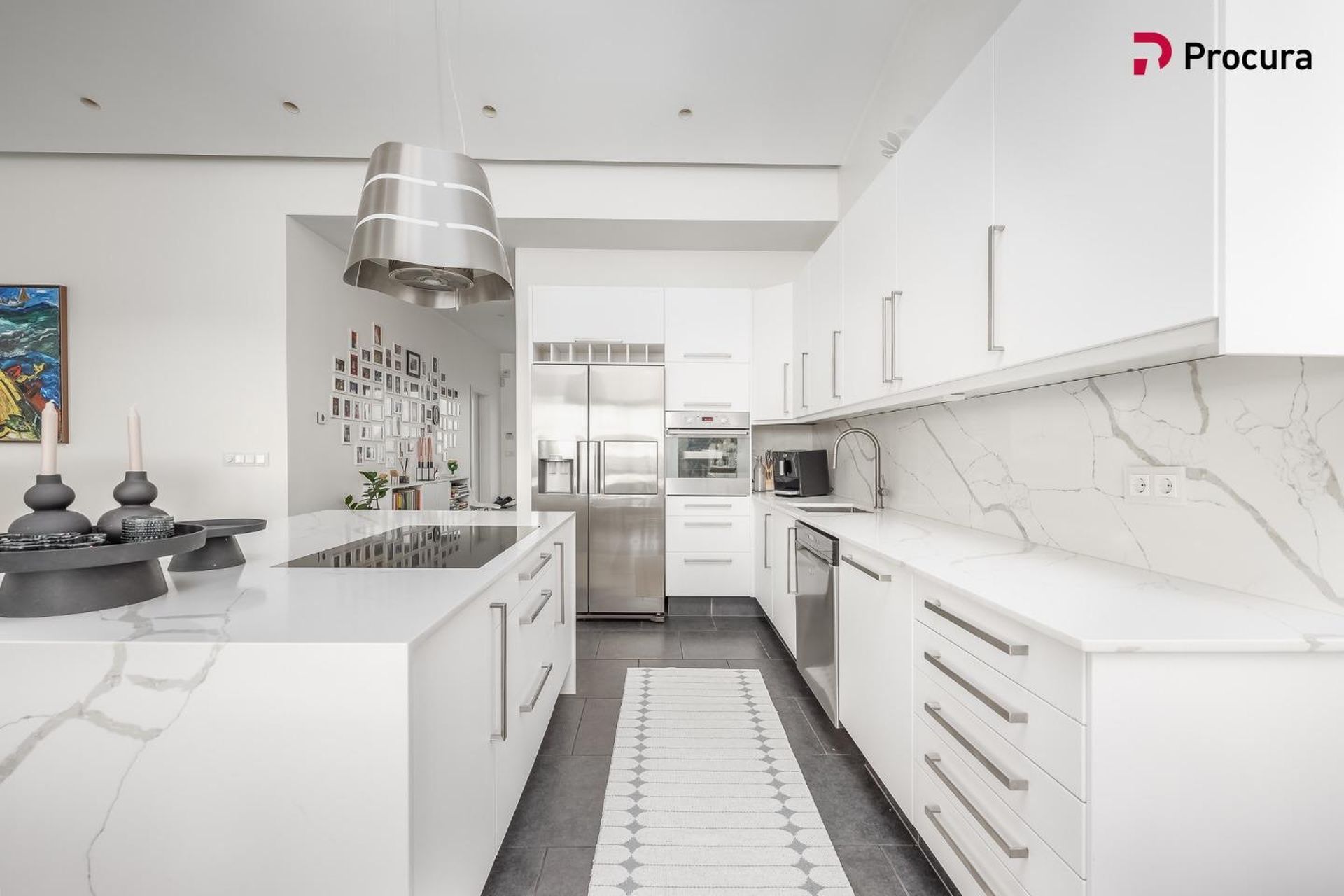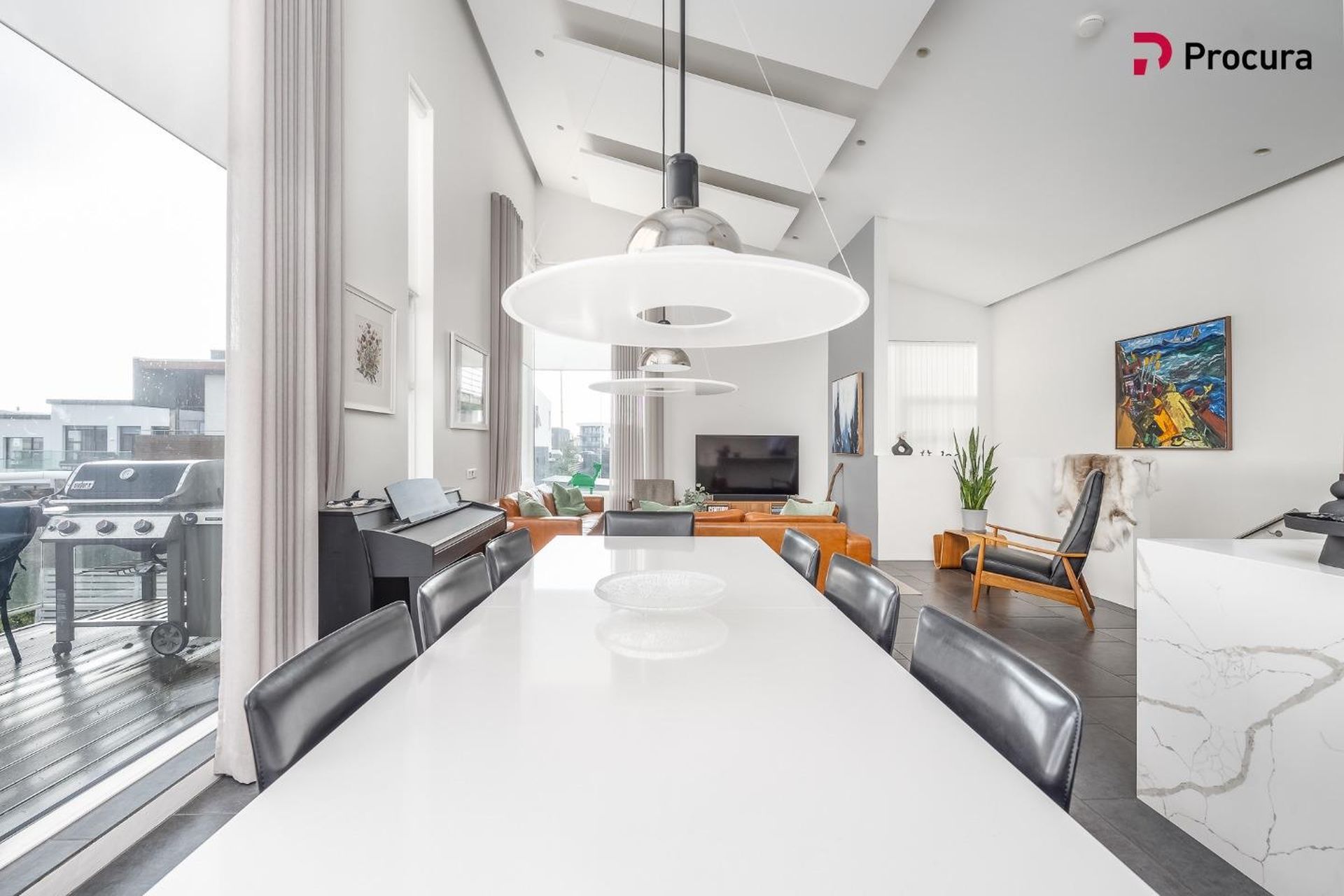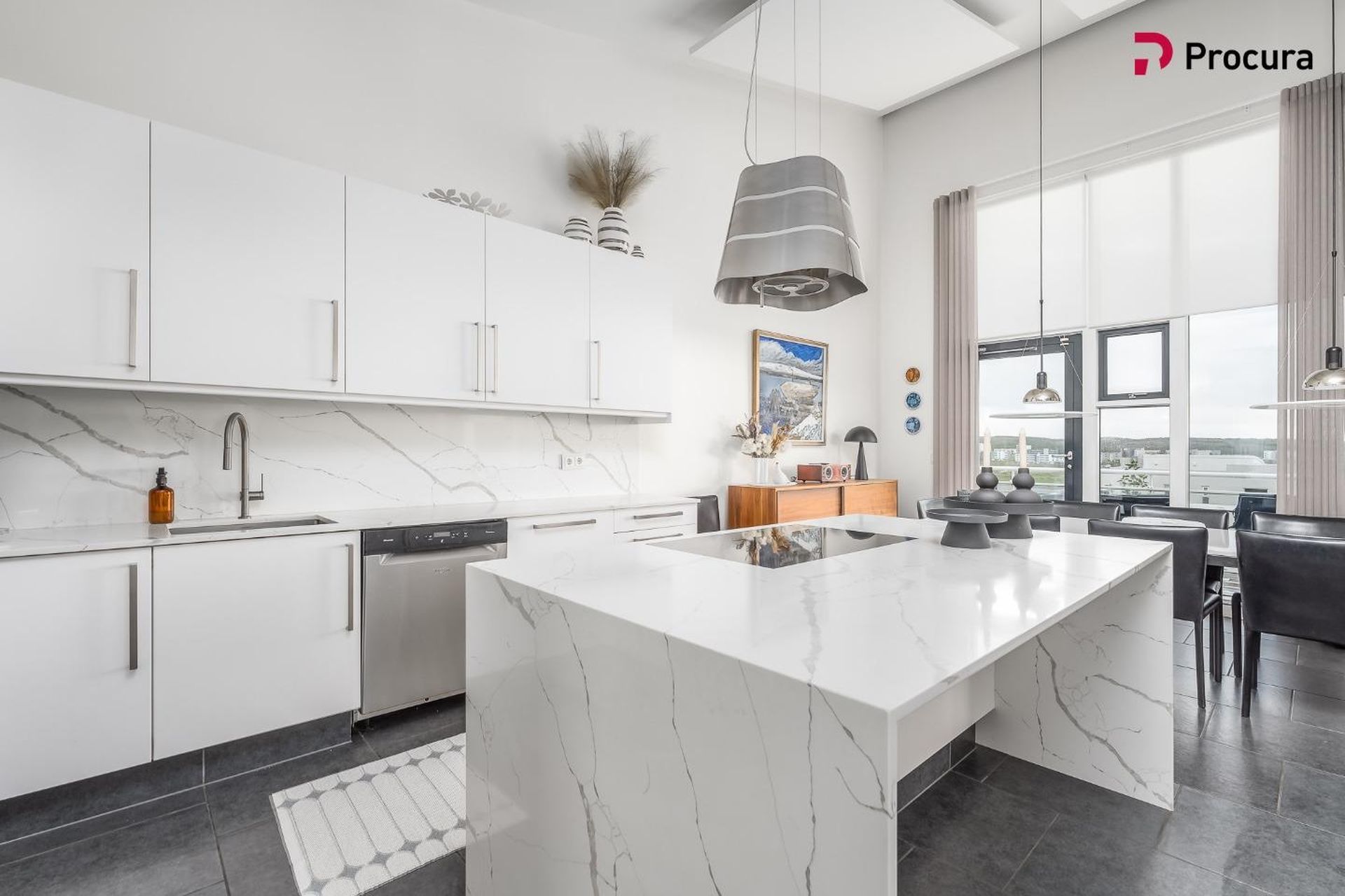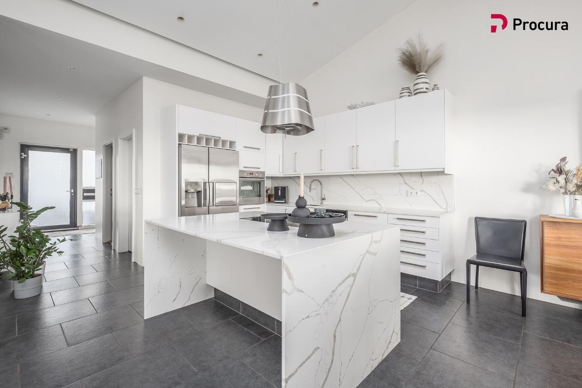 Eldhús: Eldhúsið, stofa og borðstofa mynda saman opið rými með mikla lofthæð og gólfsíðum gluggum sem bjóða upp á stórkostlegt útsýni. Snyrtileg hvít innrétting, með stórri marmaraeyju, er í L-laga sniði og býður upp á keramikhelluborð og fallegan stálháf. Ofn í vinnuhæð og dökkar flísar á gólfi gefa rýminu stílhreinan blæ.