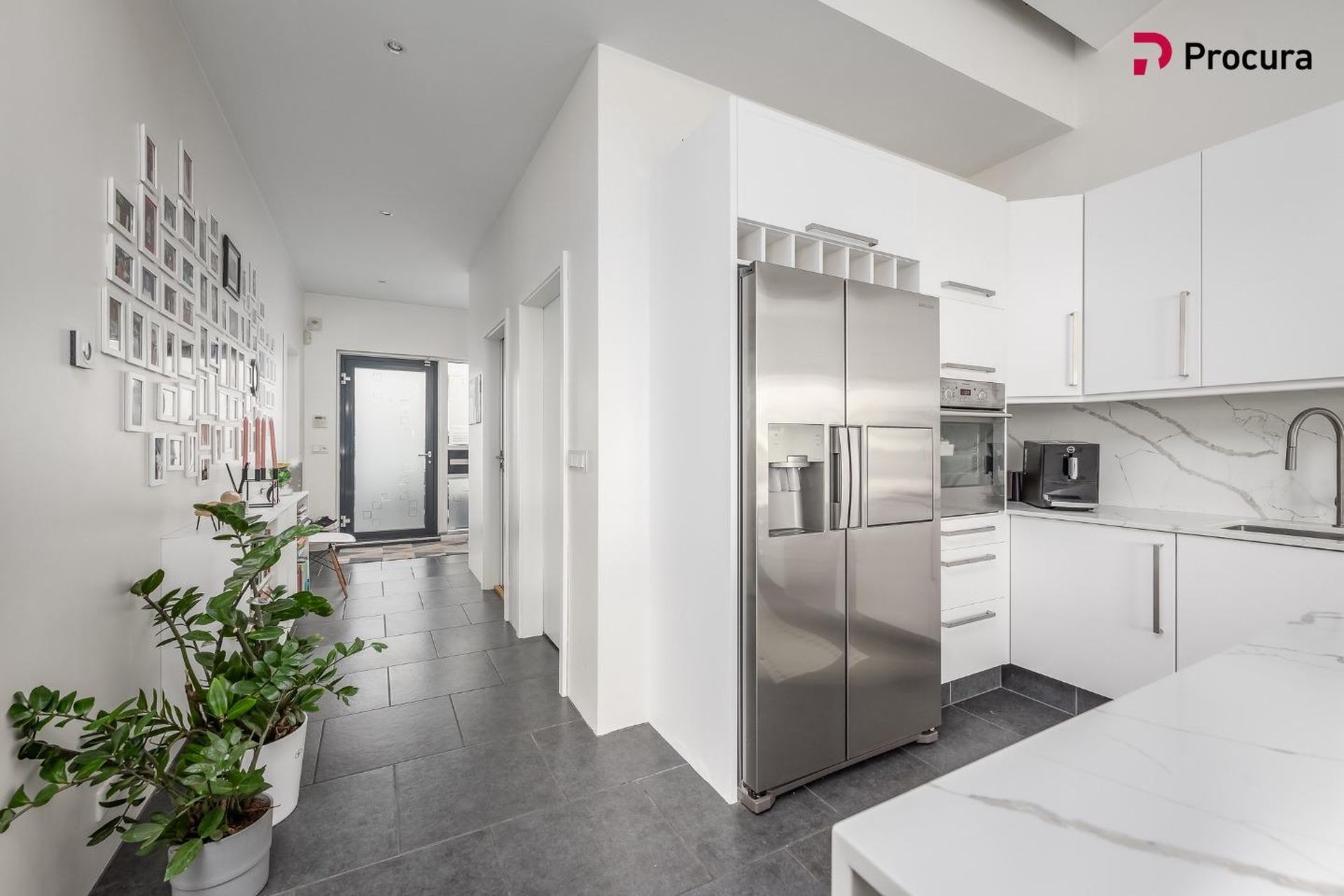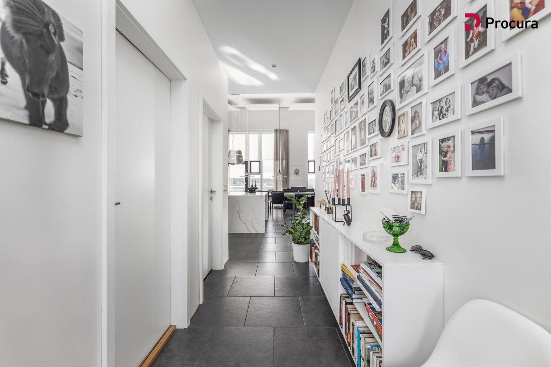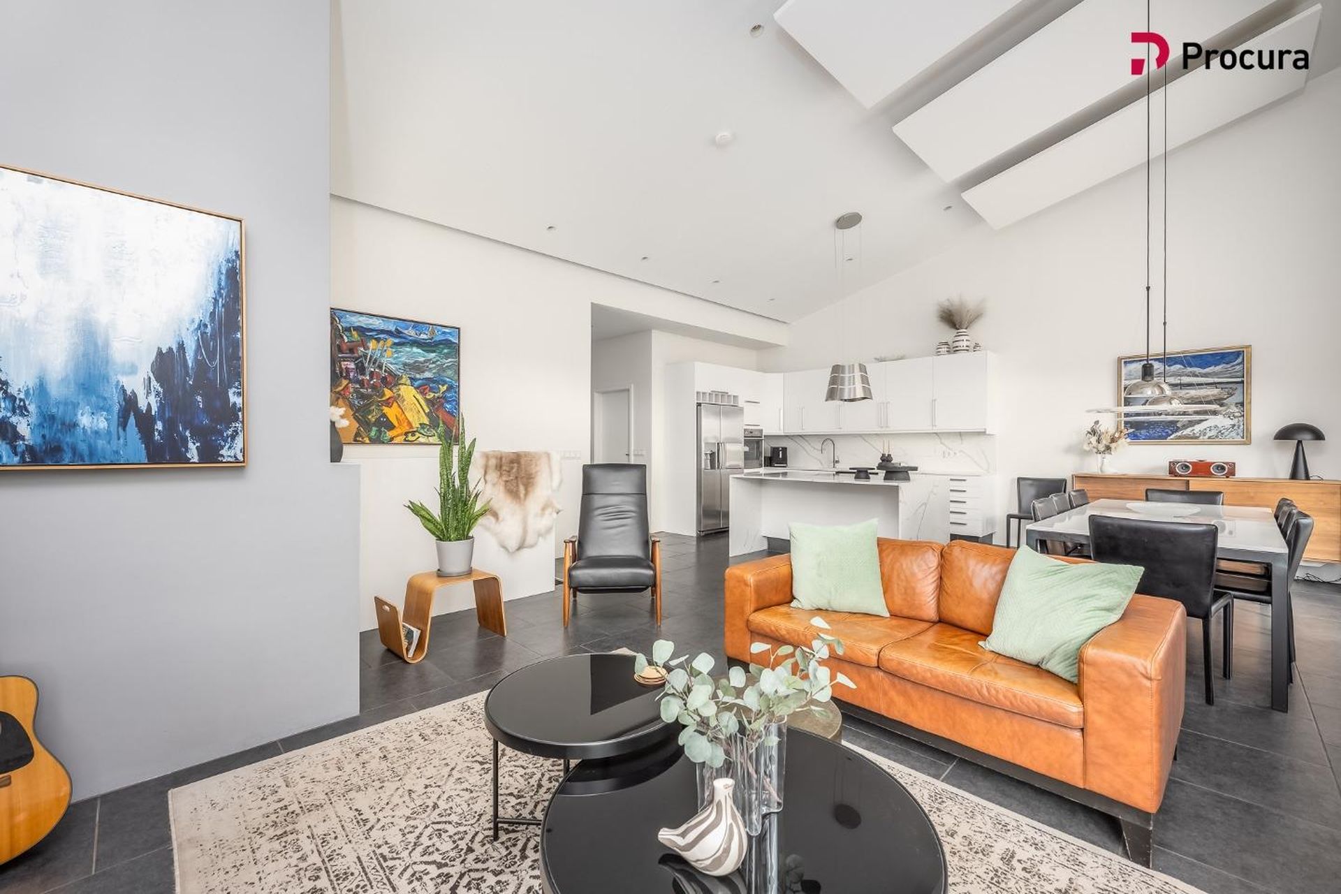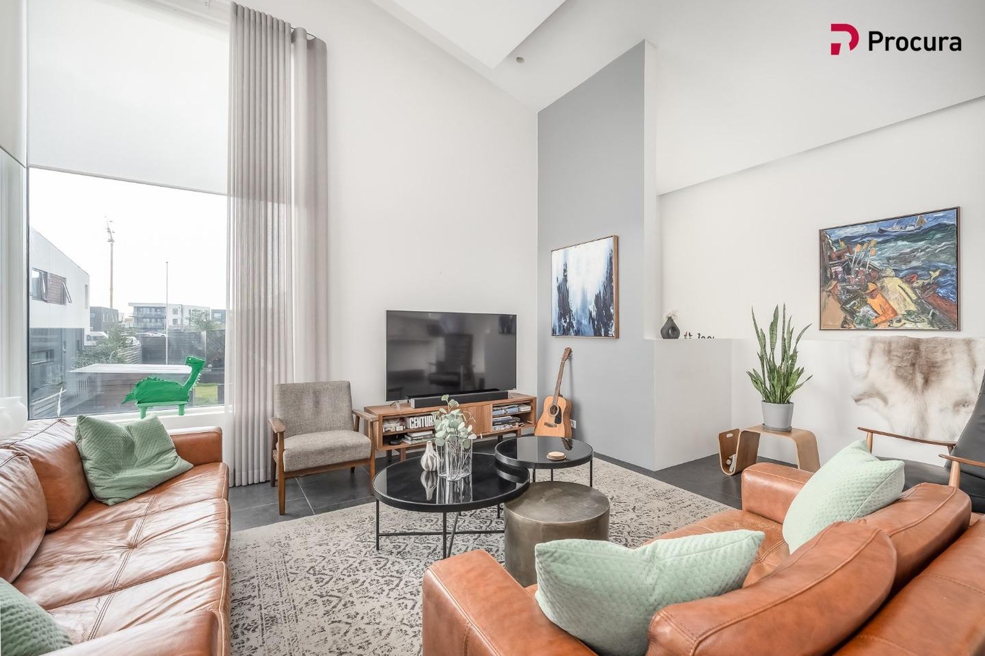 Eldhús: Eldhúsið, stofa og borðstofa mynda saman opið rými með mikla lofthæð og gólfsíðum gluggum sem bjóða upp á stórkostlegt útsýni. Snyrtileg hvít innrétting, með stórri marmaraeyju, er í L-laga sniði og býður upp á keramikhelluborð og fallegan stálháf. Ofn í vinnuhæð og dökkar flísar á gólfi gefa rýminu stílhreinan blæ.