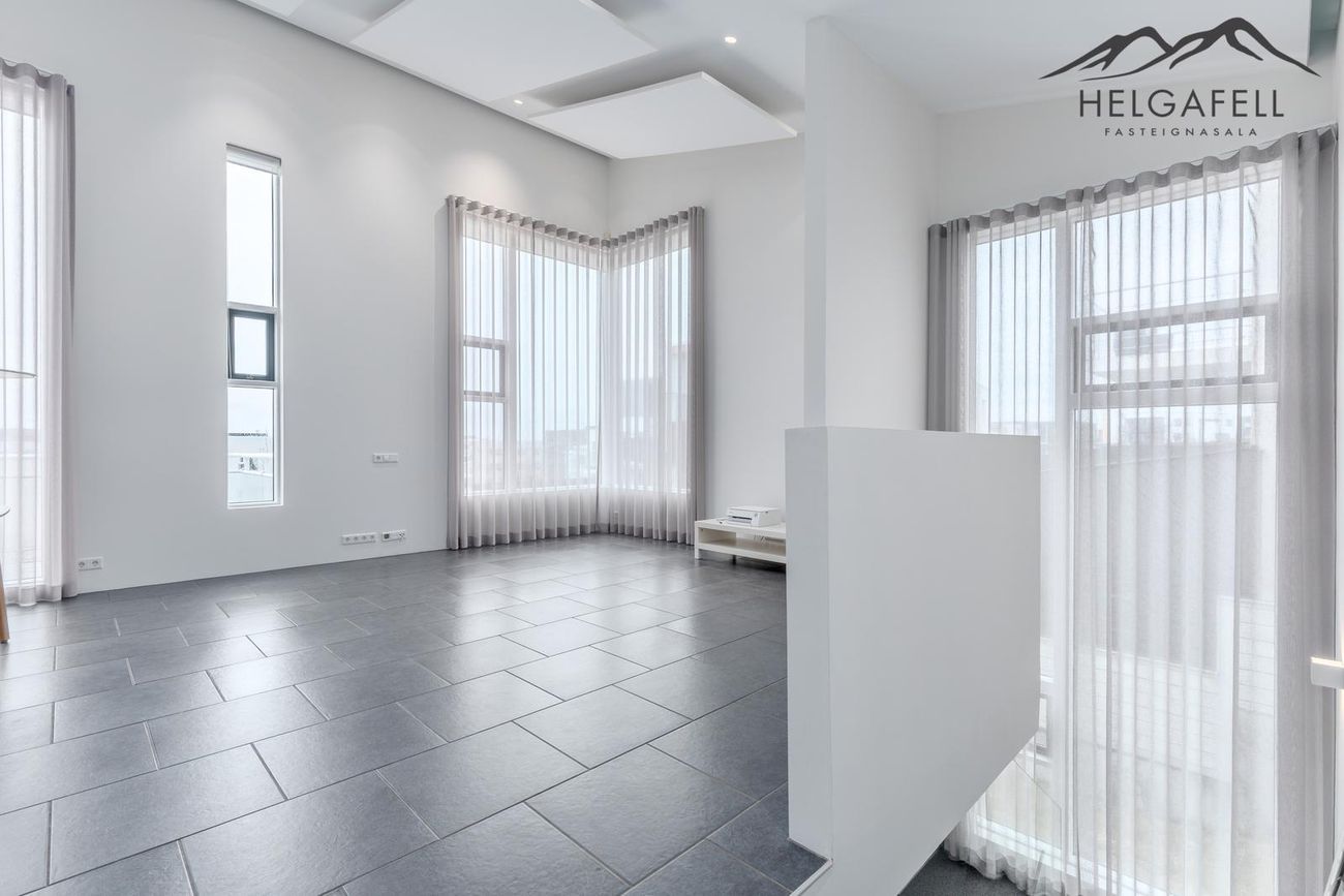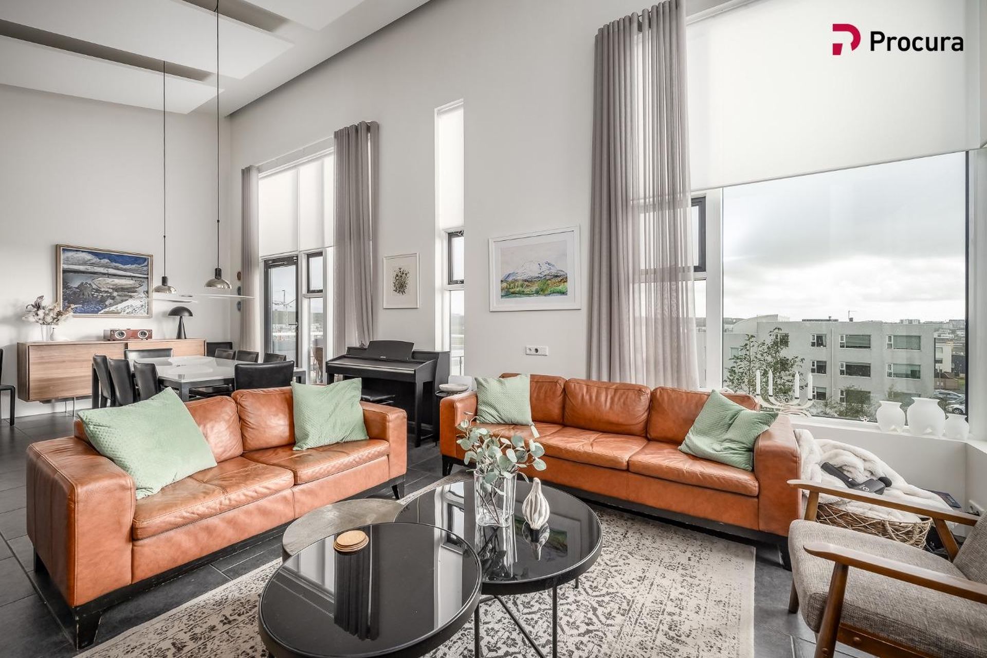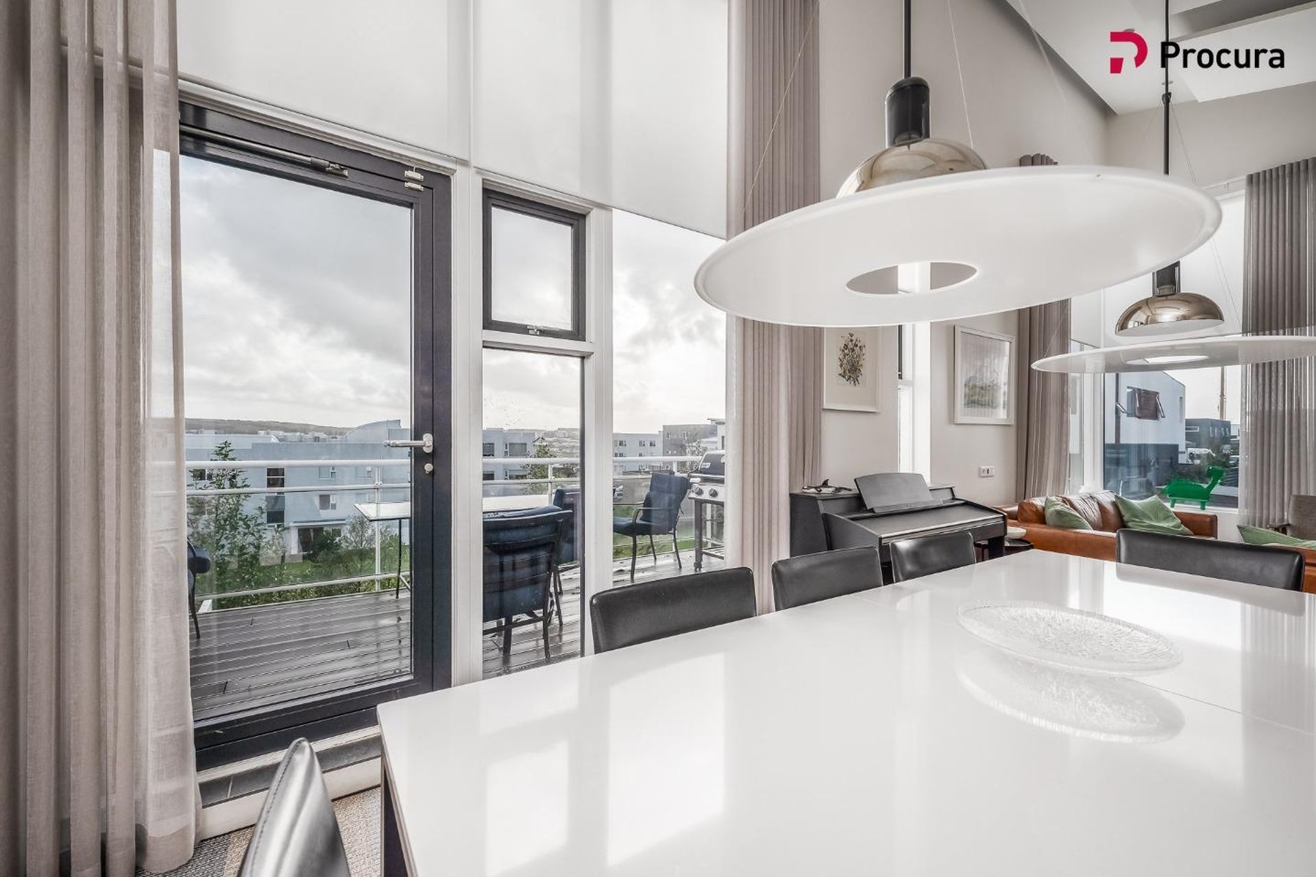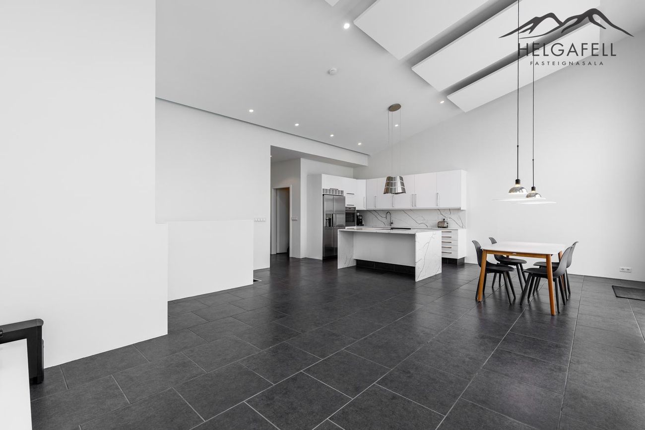Stofa/Borðstofa: Stofan og borðstofan eru í samhengi við eldhúsið. Frá borðstofunni er gengið út á stórar suður svalir sem bjóða upp á glæsilegt útsýni að Reynisvatnsás. Setustofan er í framhaldi af borðstofunni, þar sem há lofthæðin og gólfsíðu gluggarnir skapa opna og loftkennda stemmingu. Innfelld lýsing og hulin birtu í loftklæðningu auka enn frekar þægindin.
