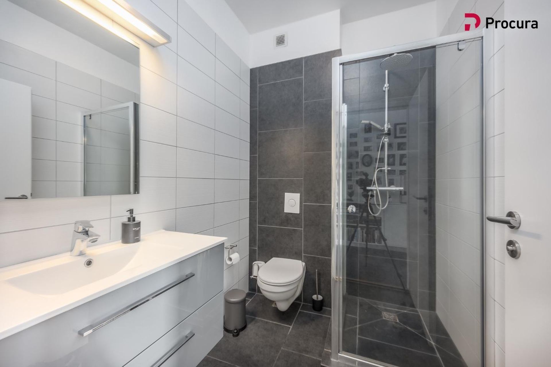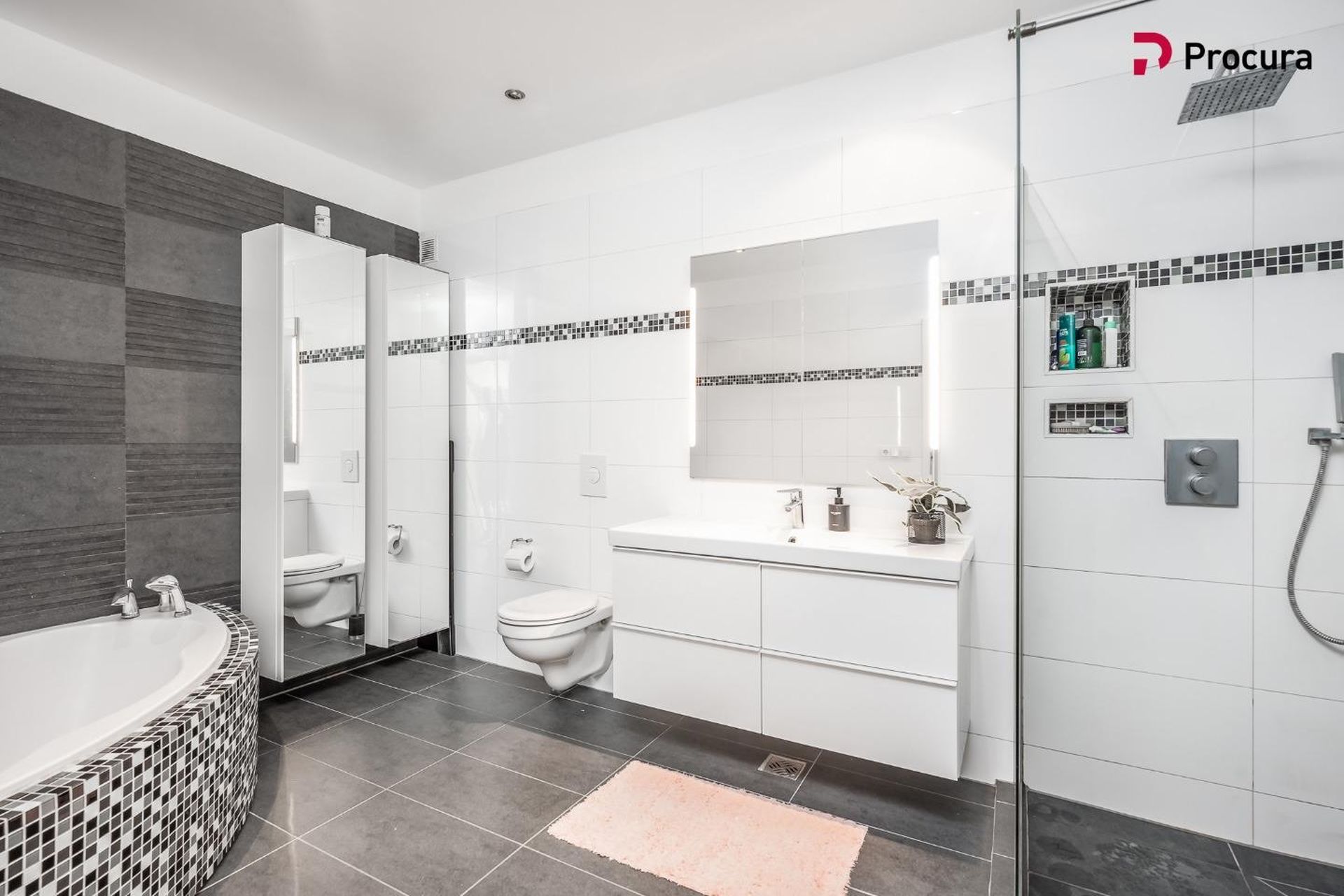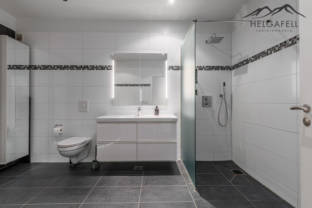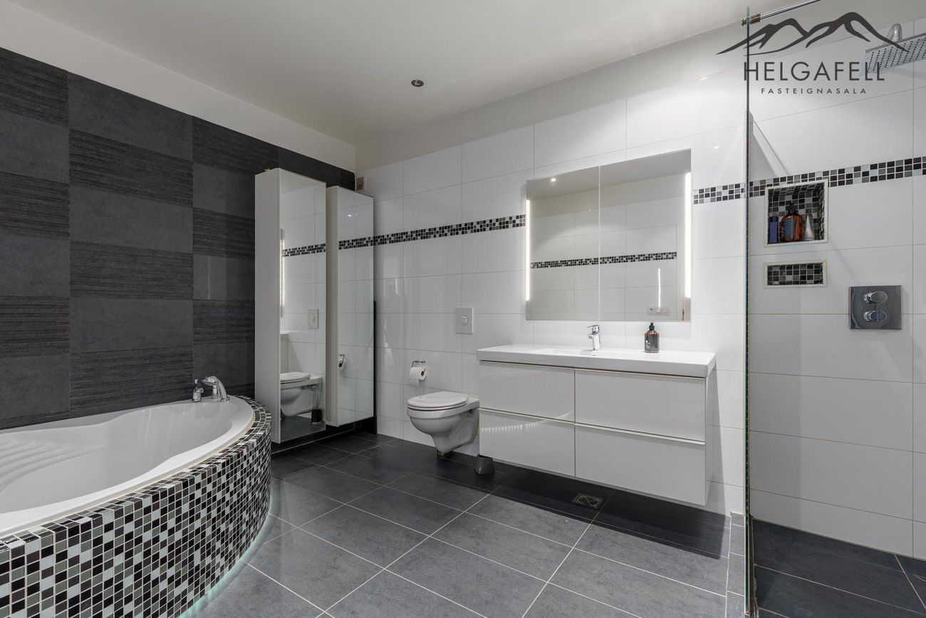 Baðherbergi: Aðalbaðherbergið er mjög stórt, með fallegum dökkum flísum, upphengdu salerni, stór sturta með glervegg og hornbaðkar er einnig til staðar. Gott skápapláss með fjórfaldri skúffu undir vaski og tveimur speglaskápum á vegg. Handklæðaofn og flísalagður bekkur við sturtuna.