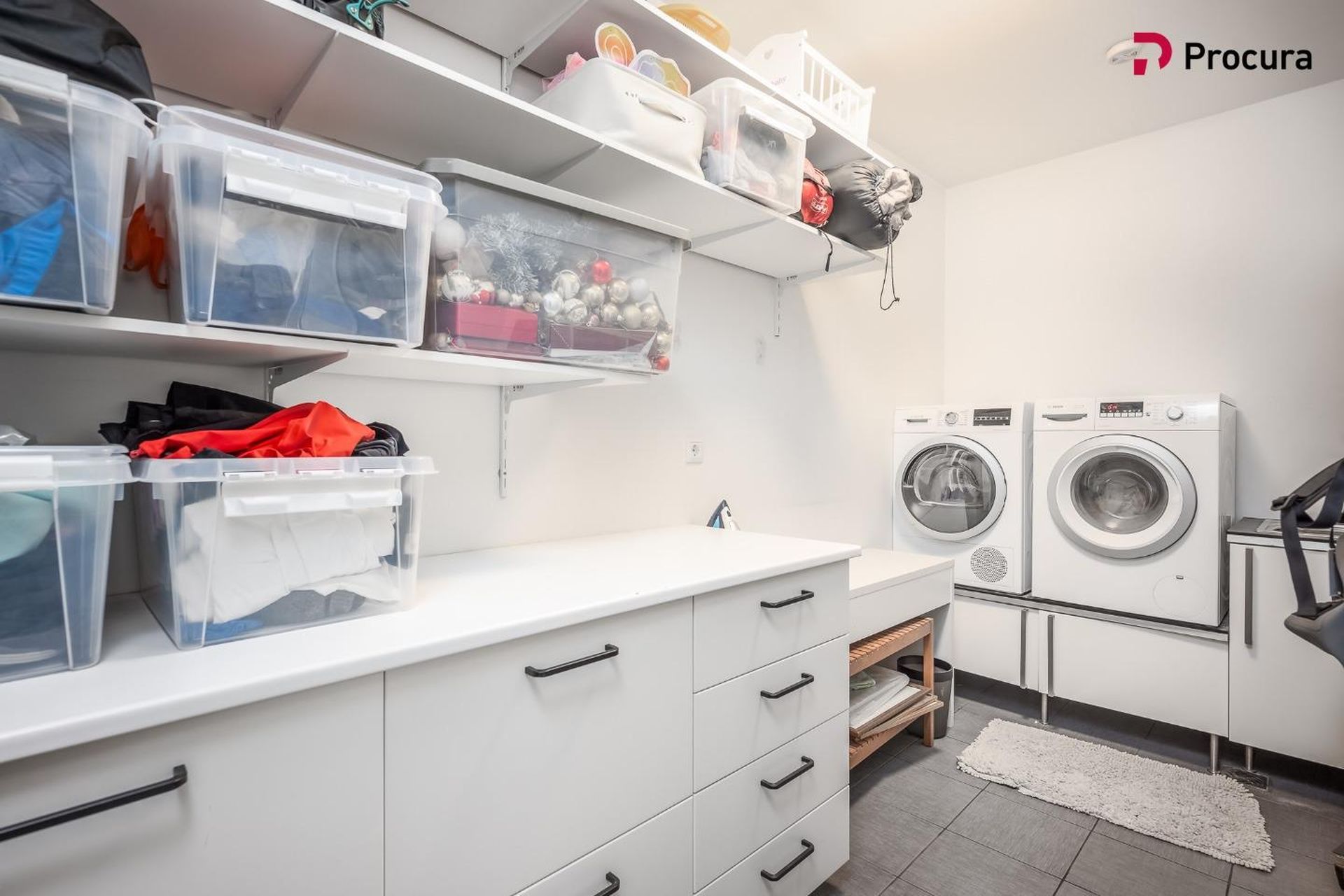 Þvottaherbergi: Stórt þvottaherbergi með flísum á gólfi, innréttingu með hyrslum og vinnuvaski. Pláss er fyrir þvottavél og þurrkara í vinnuhæð.