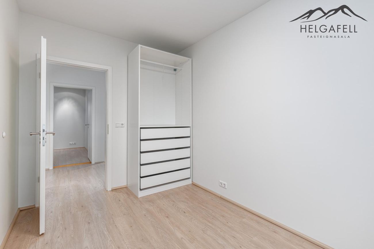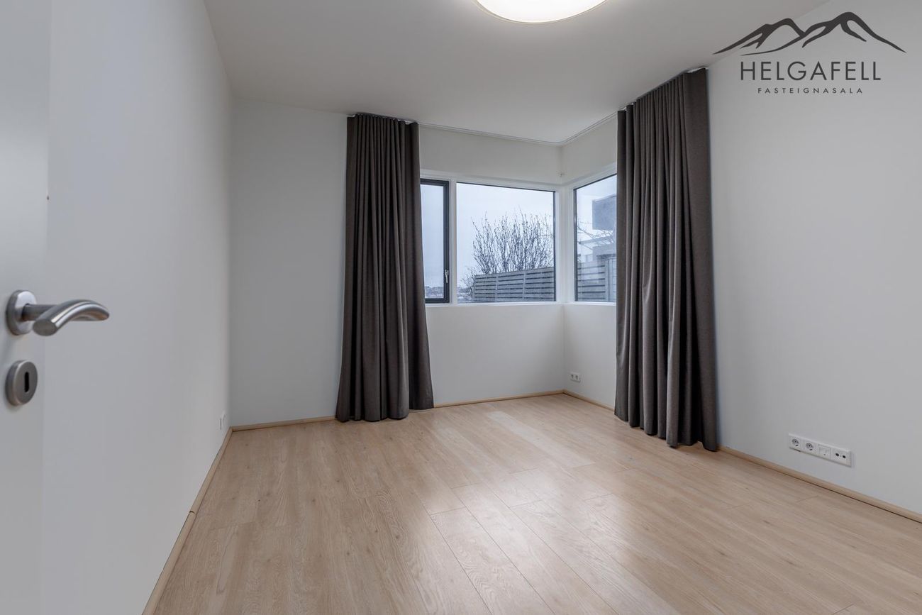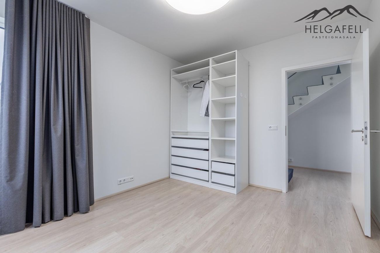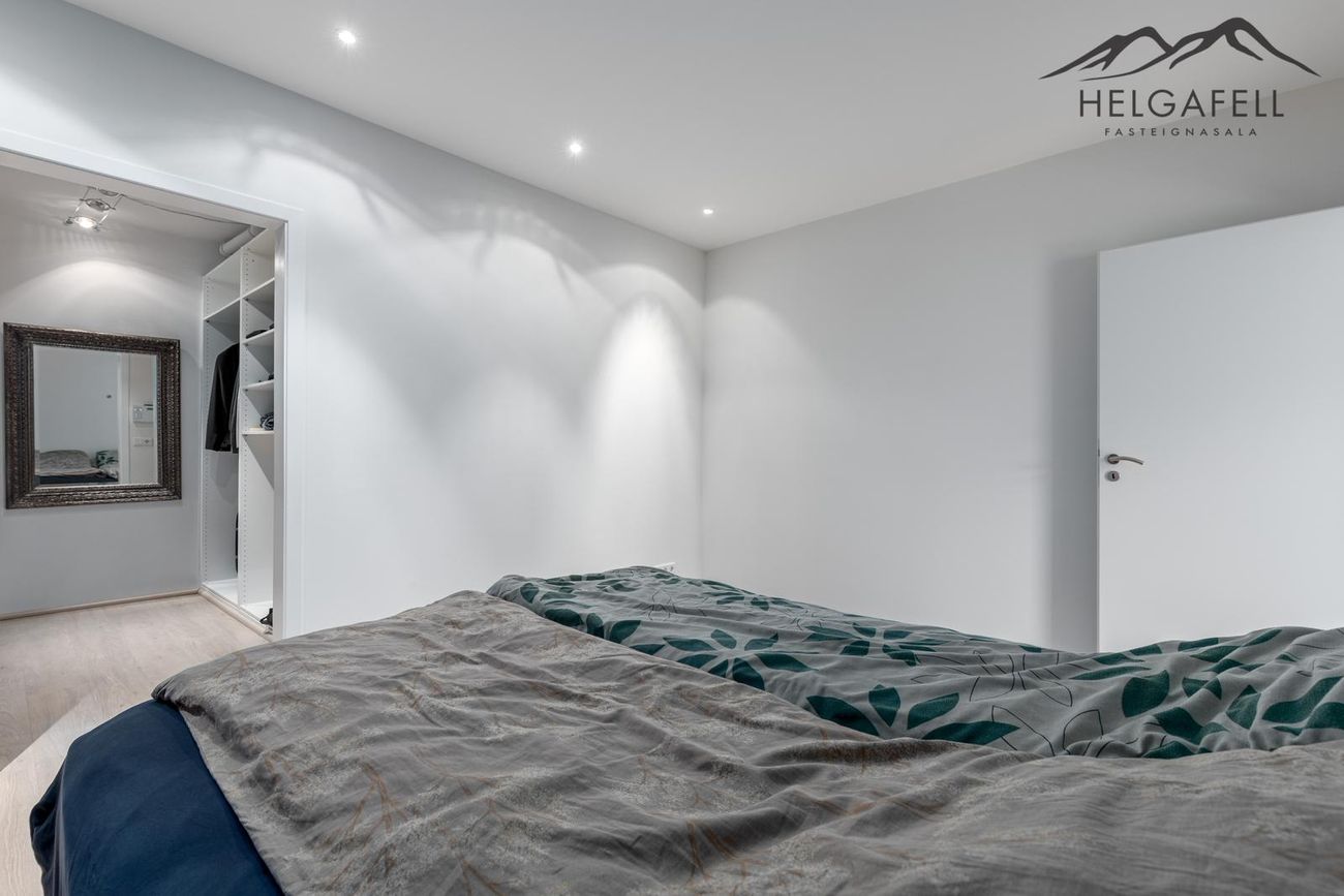 Herbergi II (hjónaherbergi + fataherbergi): Rúmgott hjónaherbergi með ljósu harðparketi og vel útbúið fataherbergi.