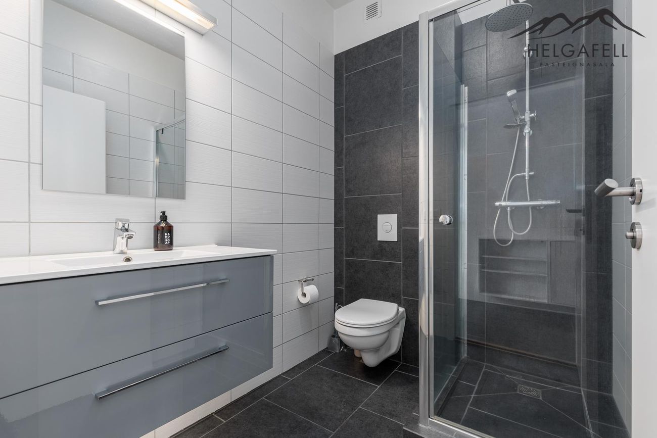 Baðherbergi: Við forstofuna er rúmgott gestasalerni með dökkum flísum á gólfi og fallegum hvítum flísum á öðrum veggjum. Hvít skúffueining er undir vaski og upphengt salerni. Góð sturta með glerveggjum er beint á gólf.