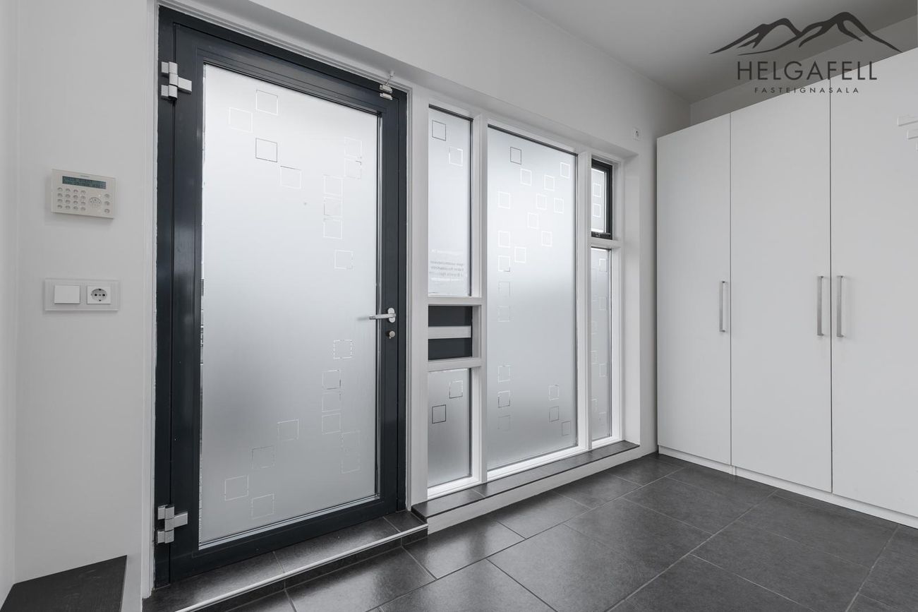 Stutt í íþróttaaðstöðu Fram, leik- og grunnskóla sem og fallegar gönguleiðir. Efri hæð: Forstofa: Velkomin inn í rúmgóða forstofu á efri hæð hússins, þar er þrefaldur hvítur fataskápur. Dökkar flísar á gólfi og stórir gluggar skapa bjarta og opna stemningu. Innangengt er í bílskúr úr forstofu.
