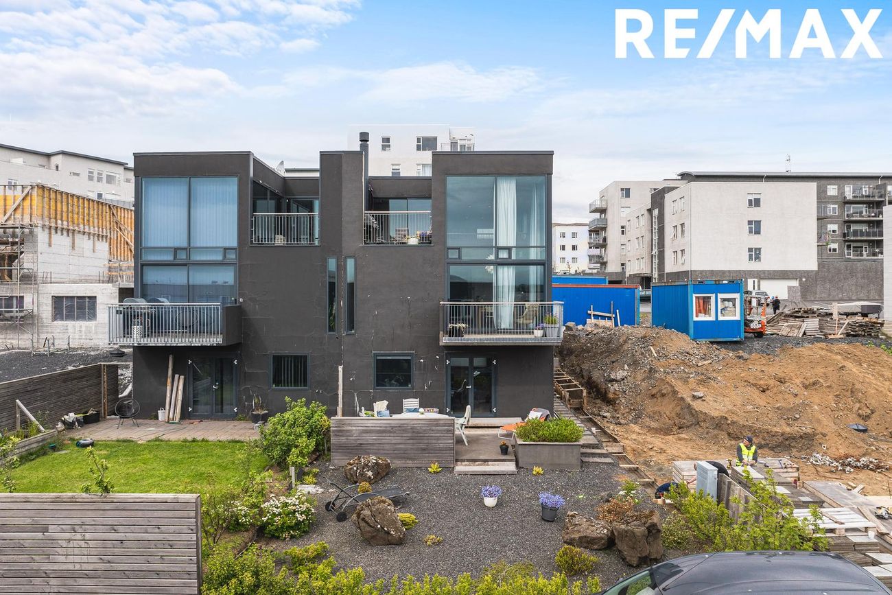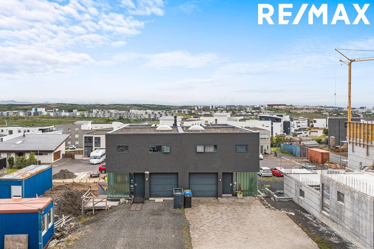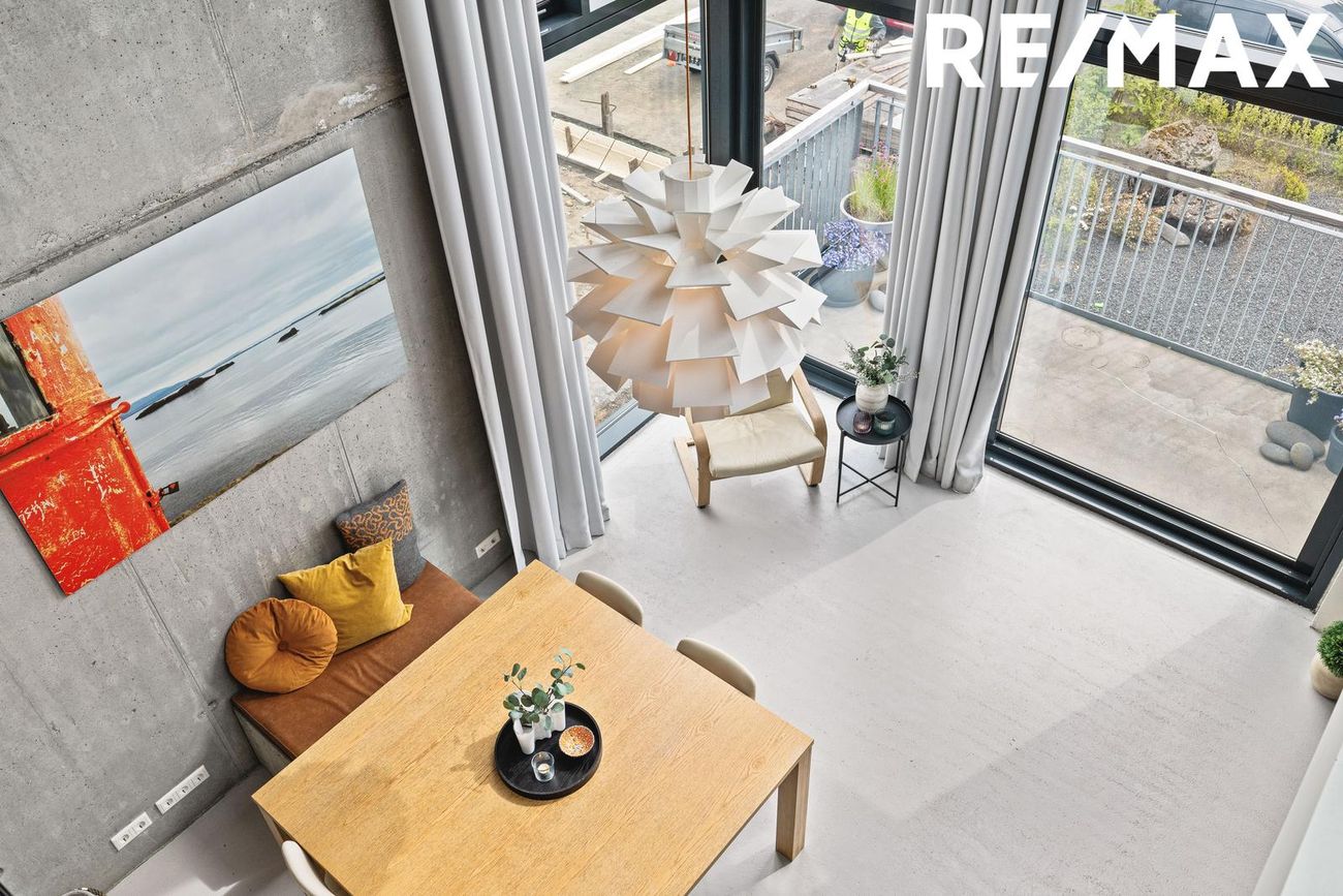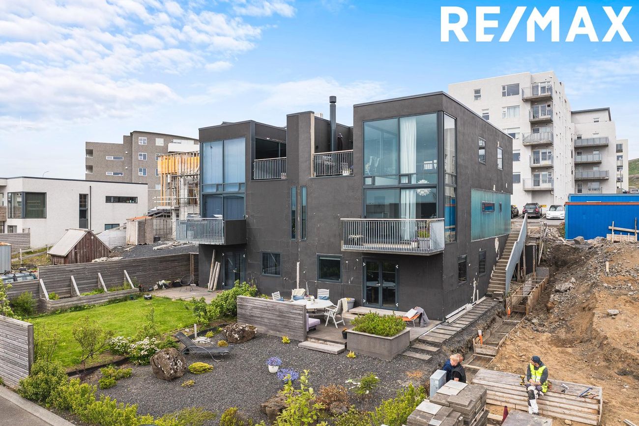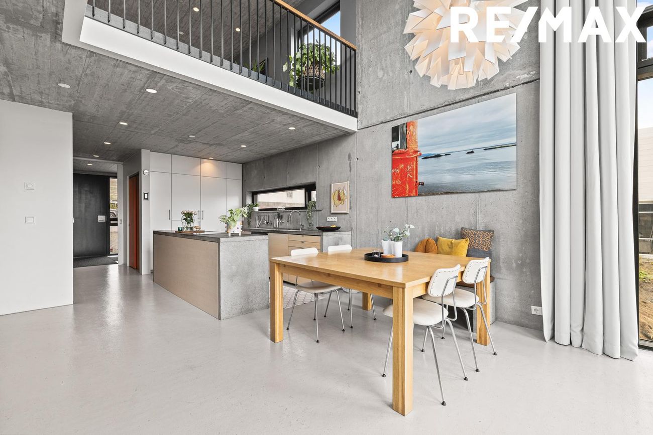 Parhús í mödernískum stíl með opnu rými, 5 metra lofthæð á aðalhæð, sjónsteypuveggjum og möguleikum á aukaíbúð. Hús með sterku harðparketi, steyptum stigum og innfelldri LED lýsingu.