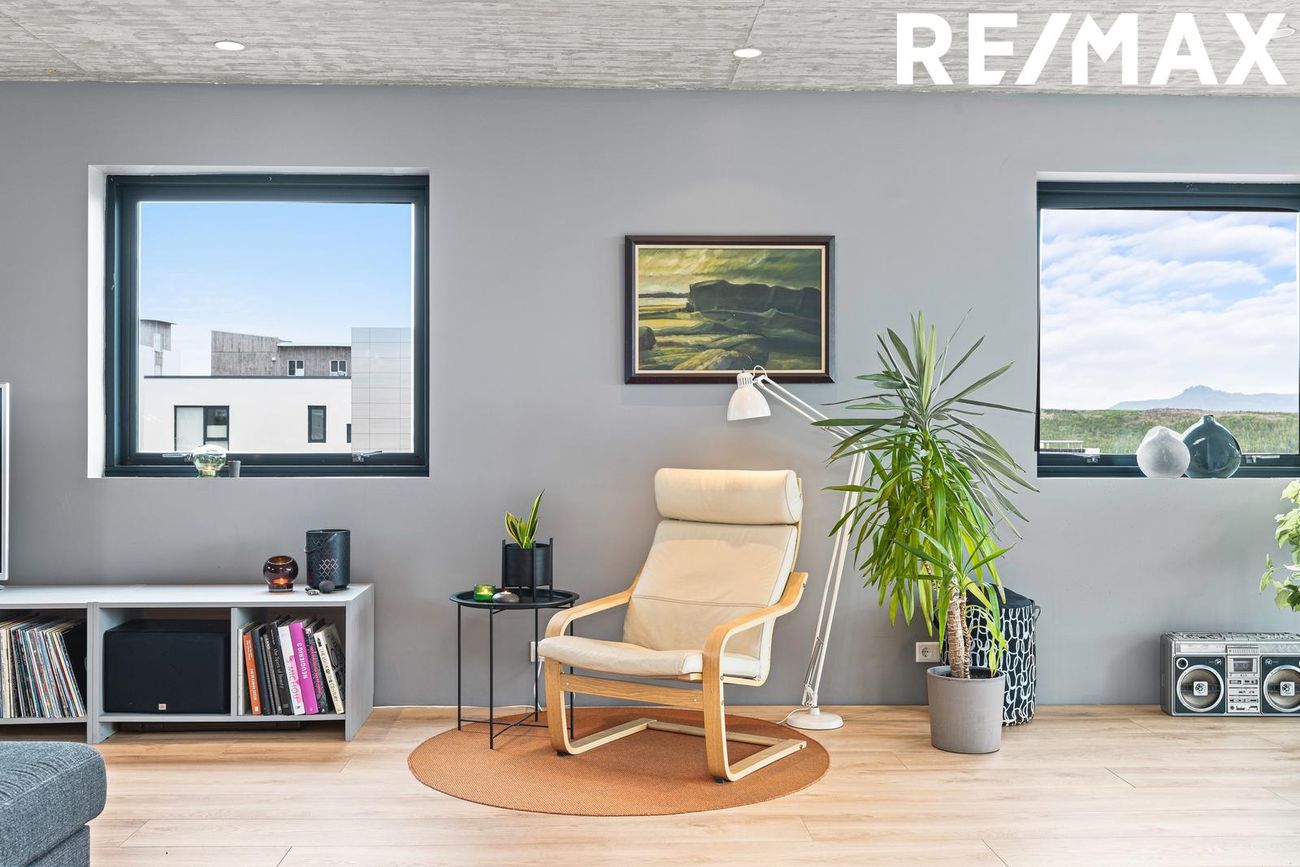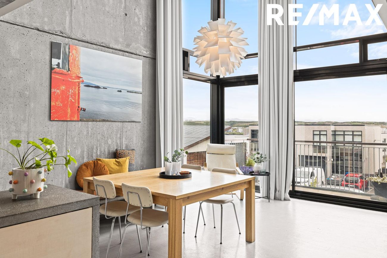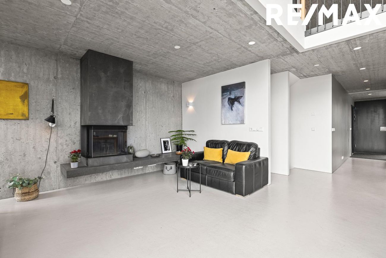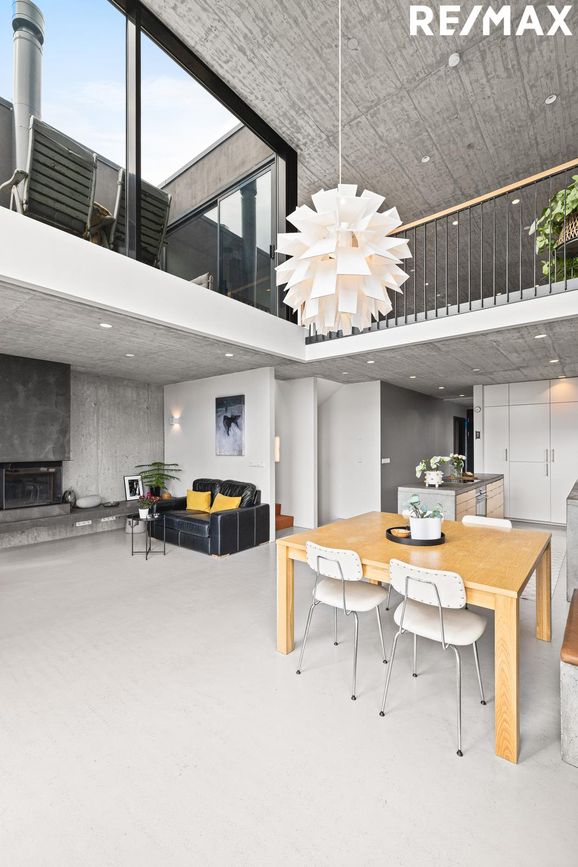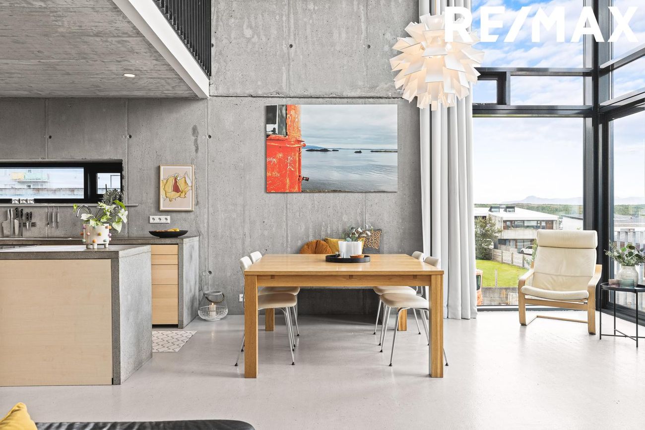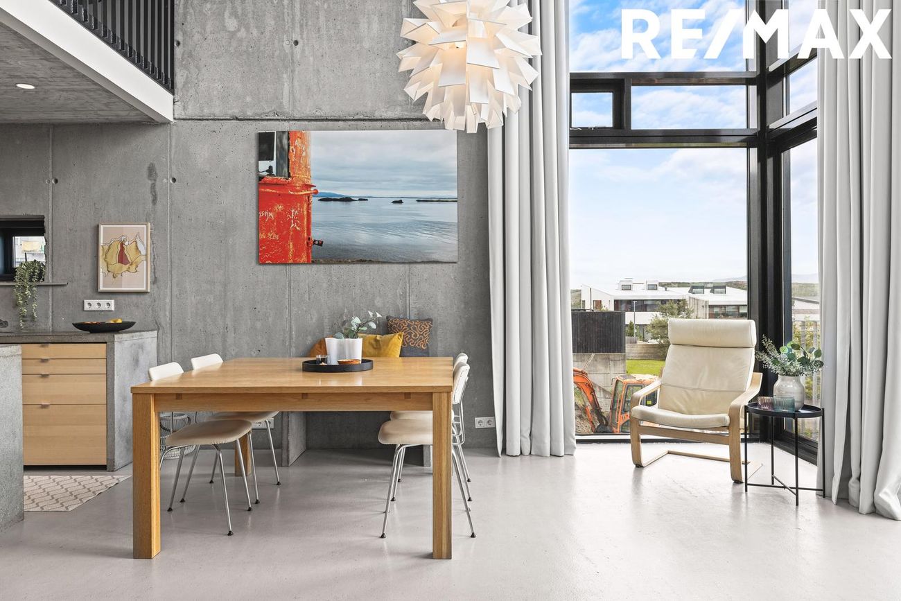 Stofa í opnu rými með 5 metra lofthæð, steyptri hillu, nýlegum arni og útgengi á suðursvalir með fjallasýni. Tvöföld lofthæð tengir aðalhæð og efri hæð.
