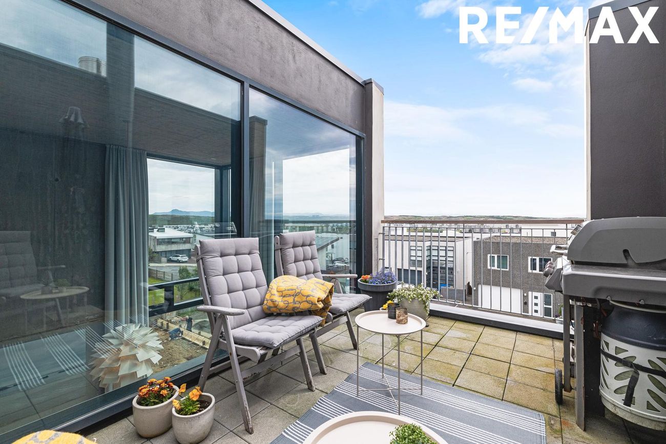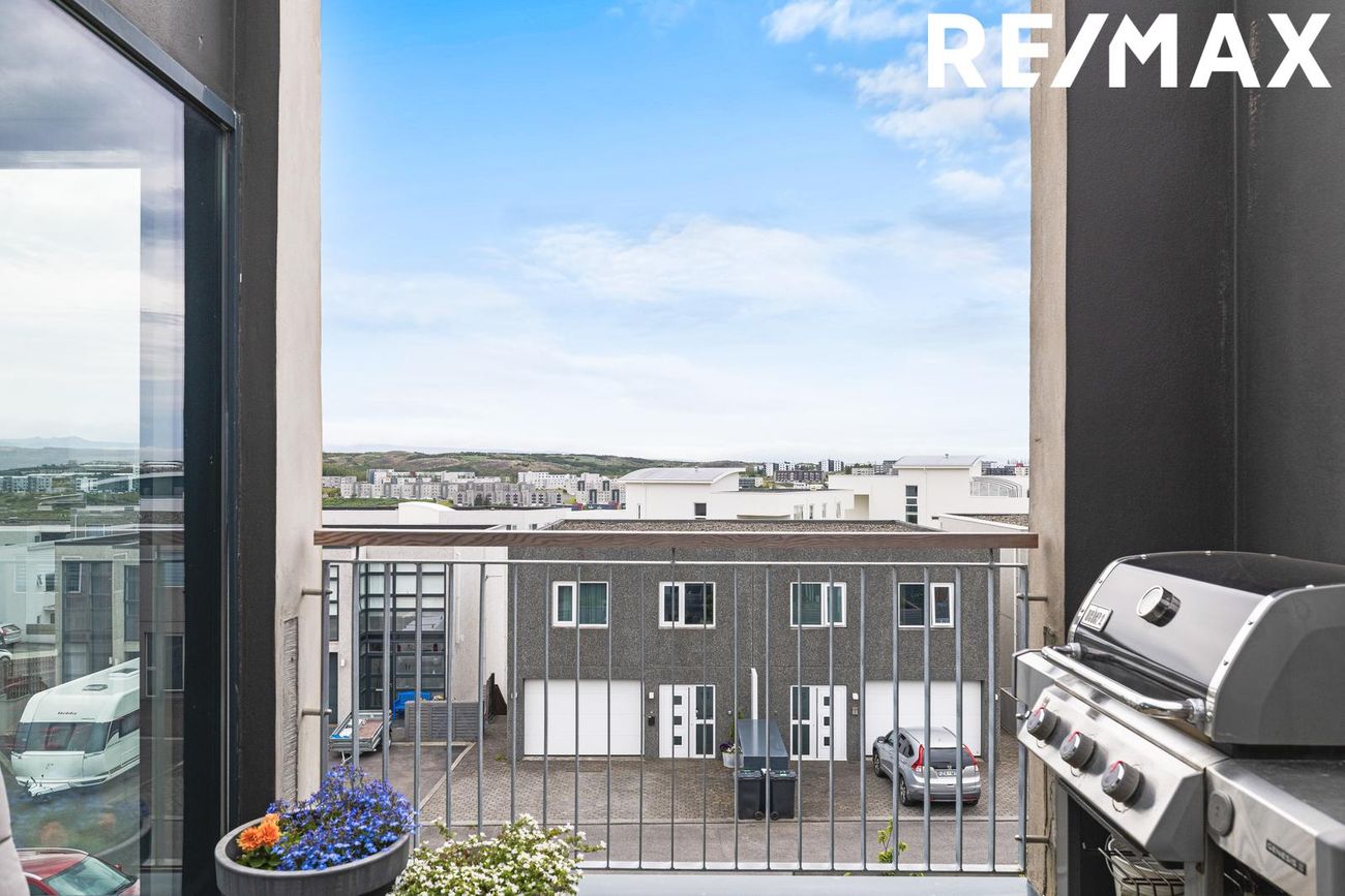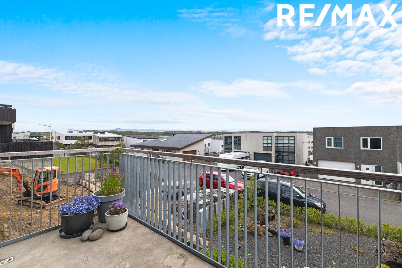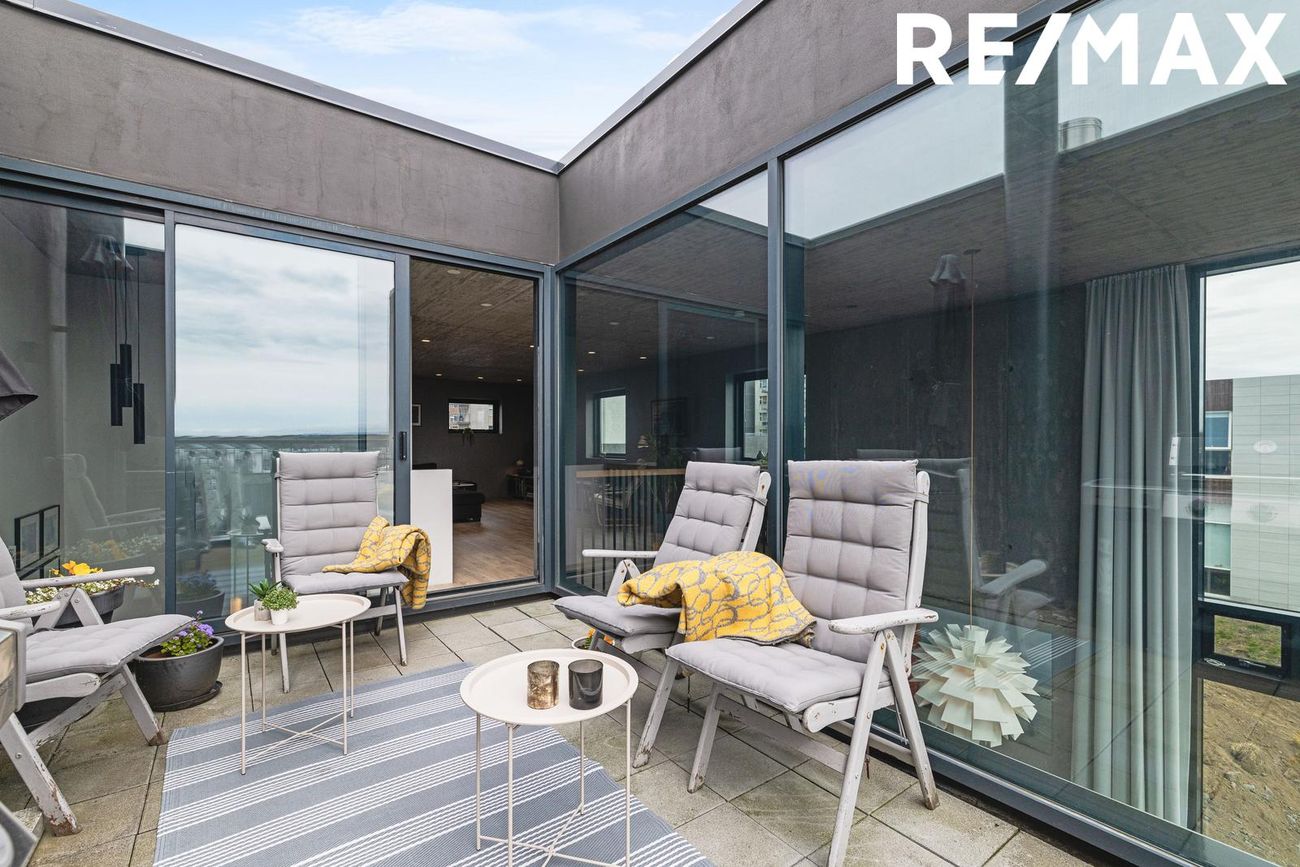 Tveir svalir í suðurátt, steyptur stigi með teppi og efsta hæð með kringlóttum þakglugga og víðsýnt útsýni.