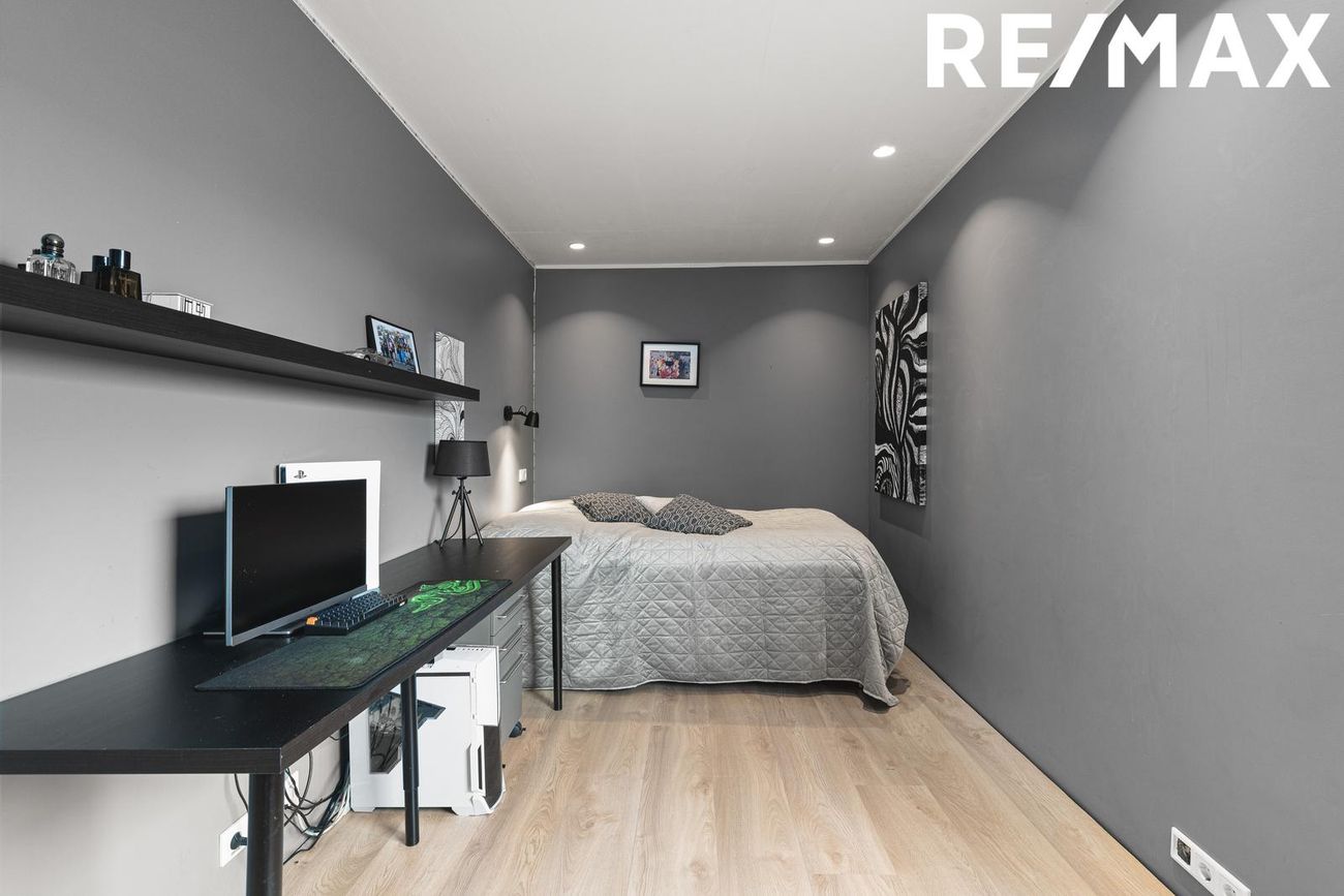 Þrjú rúmgóð svefnherbergi á jarðhæð með gluggum í alla áttir. Eitt herbergi með L-laga skipulagi og útgengi út á verönd.