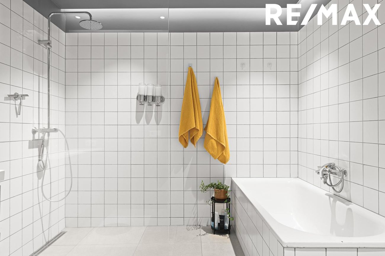 Baðherbergi með walk-in sturtu, baðkari, upphengt salerni og speglaskáp. Flísar á votssvæðum.