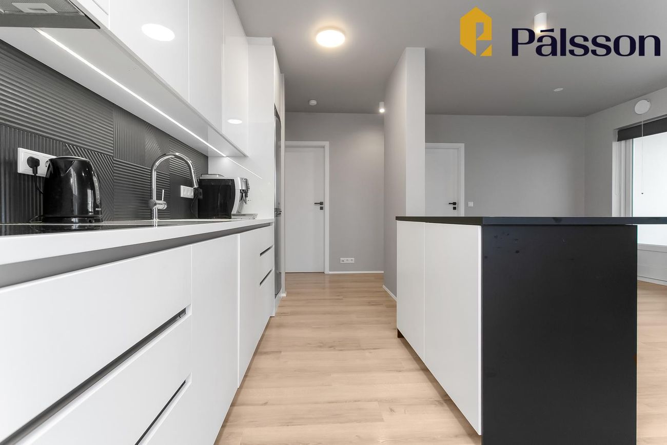 Eldhús með ljósri innréttingu, dökkar flísar á milli, ofn í vinnuhæð, innbyggð uppþvottavél, laus eyja. Parket á gólfi.