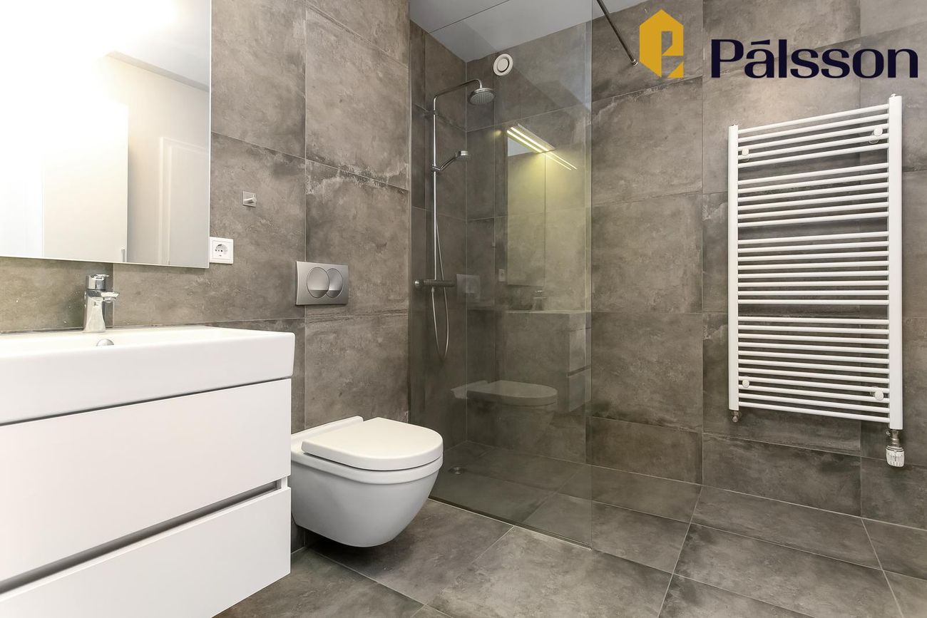 Baðherbergi er með góðri innrétting, hólf fyrir þvottavél og þurrkara, handklæðaofn, walk-in sturta, upphengt wc, flísar á gólfum og á veggjum að hluta.