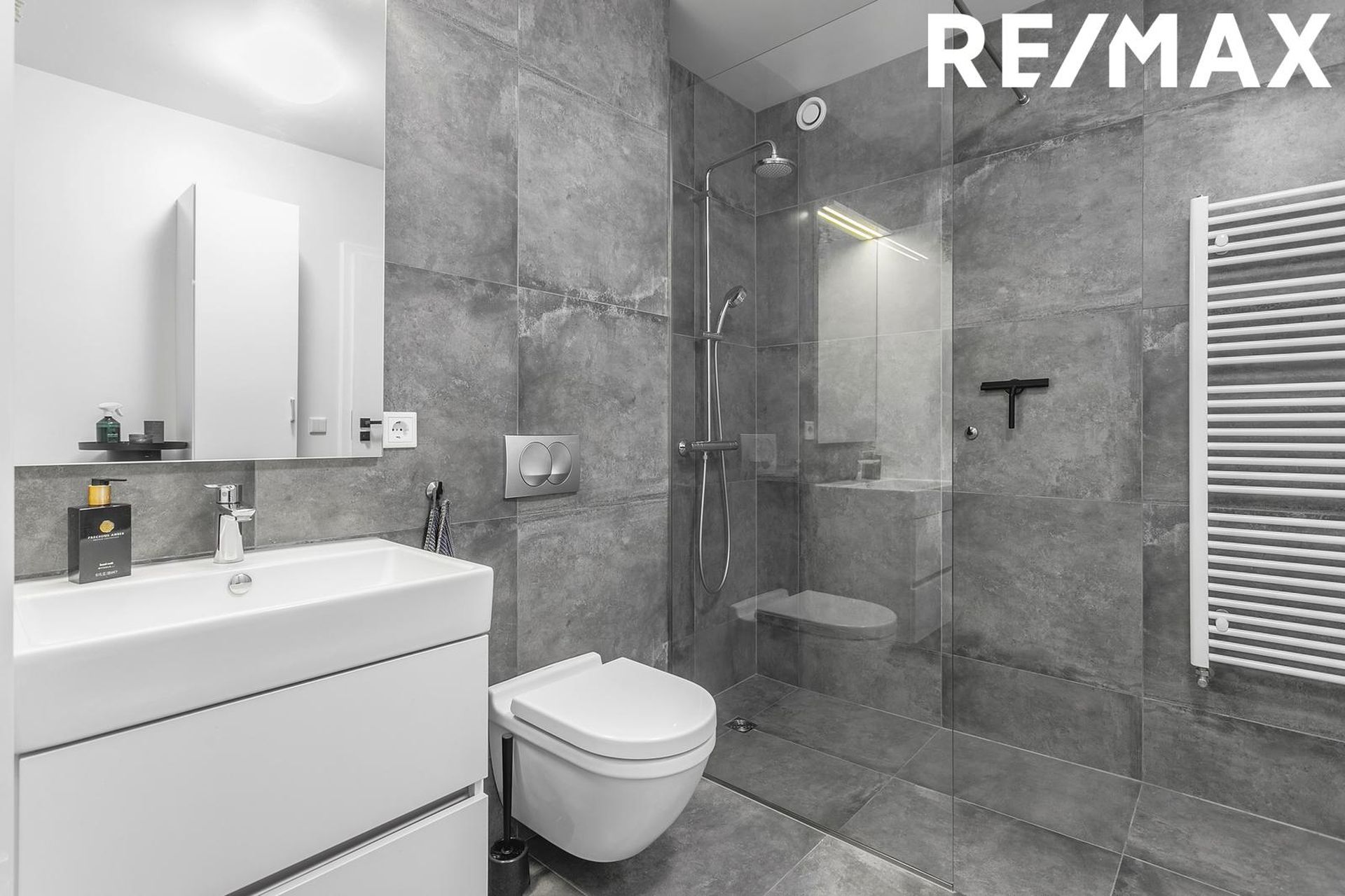 Baðherbergi með góðri innrétting, hólf fyrir þvottavél og þurrkara, handklæðaofn, walk-in sturta, upphengt wc. Flísar á gólfum og á veggjum að hluta.