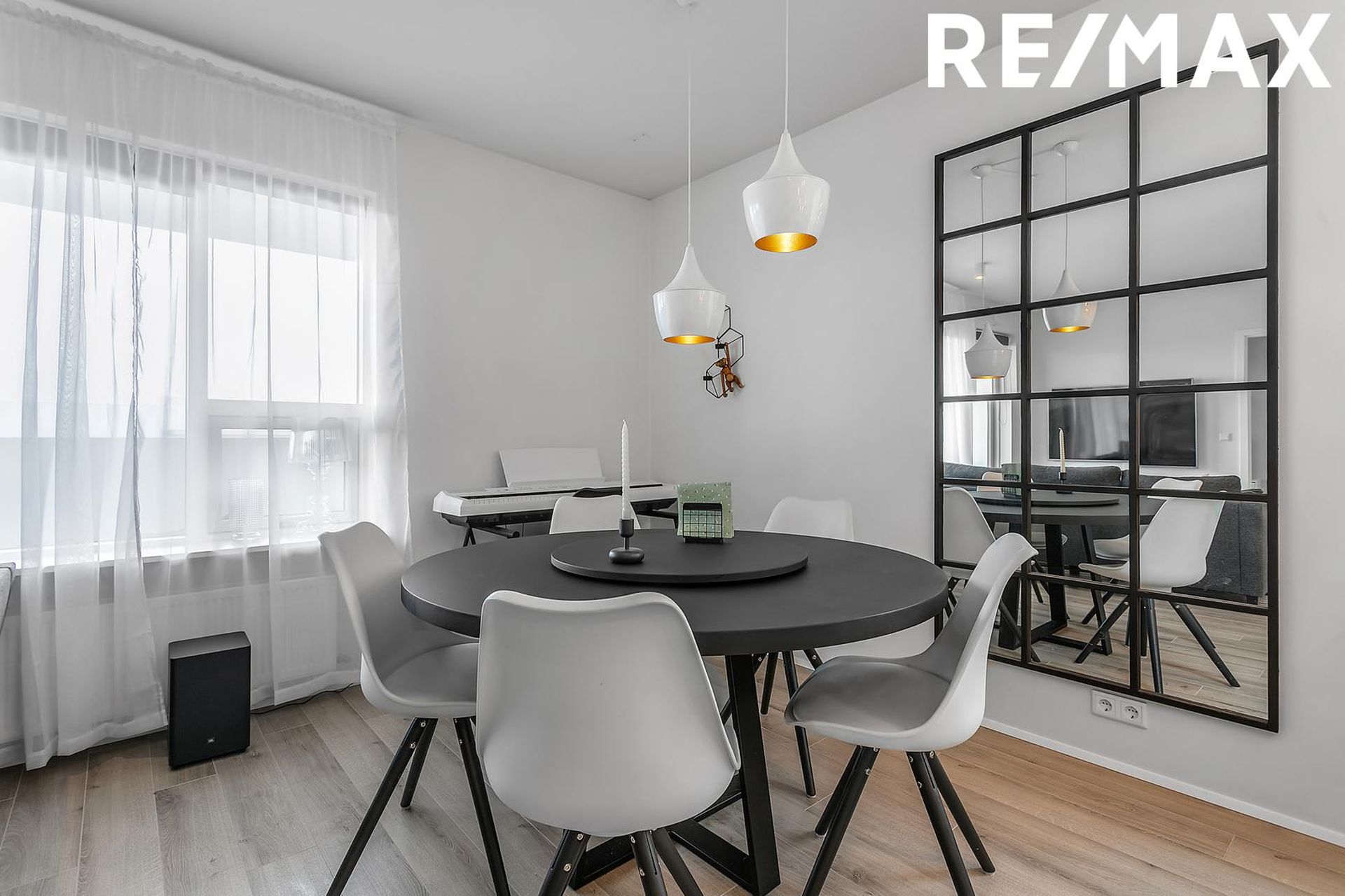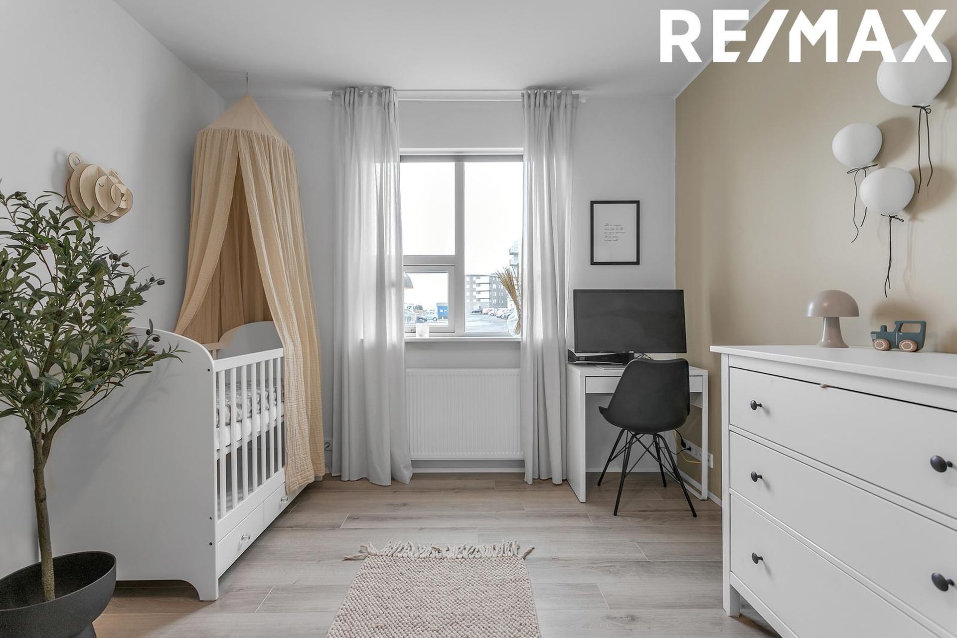 Parket á gólfi í flestum herbergjum, flísar í baðherbergi.