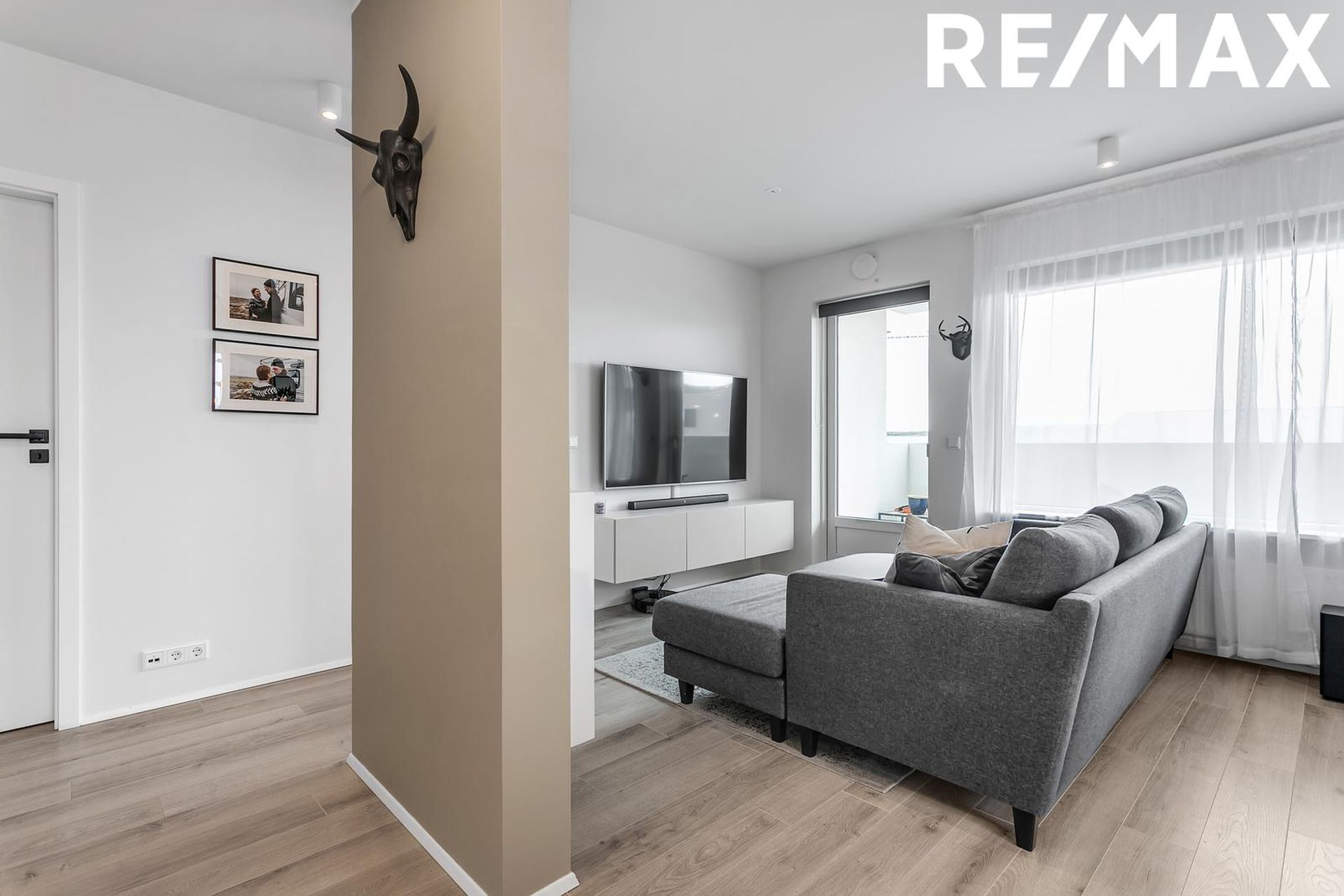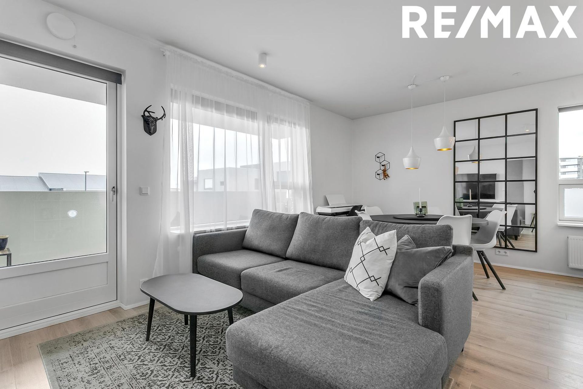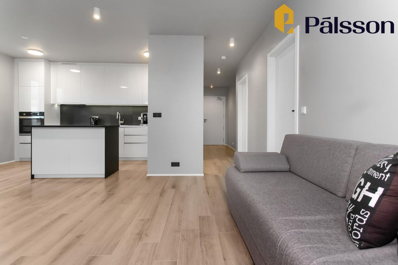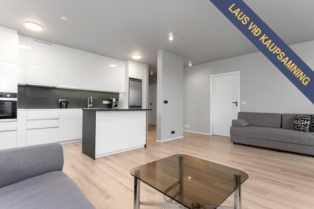 Björt stofa í sameiginlegu rými með eldhúsi, með útgengi út á svalir. Parket á gólfi.